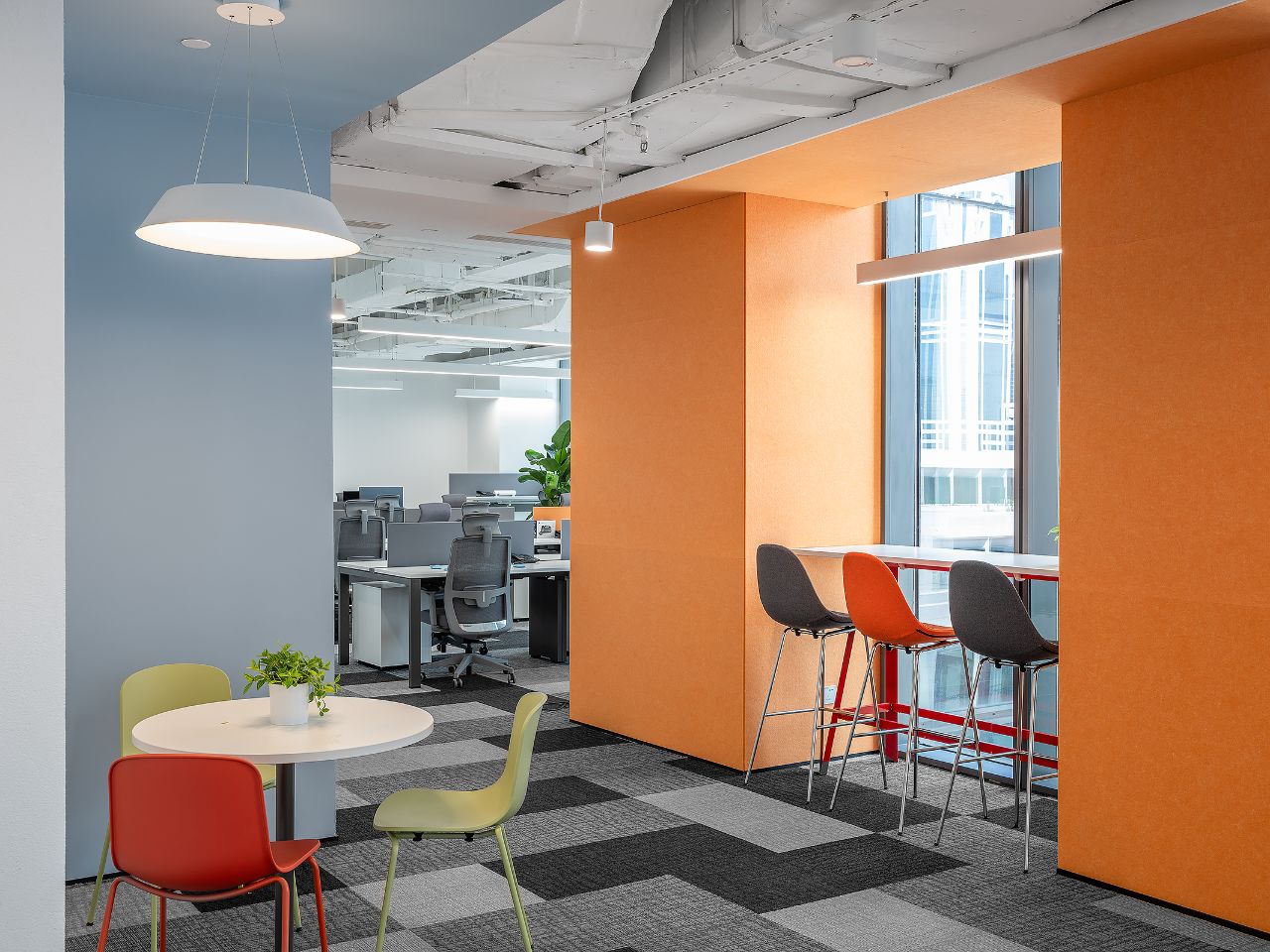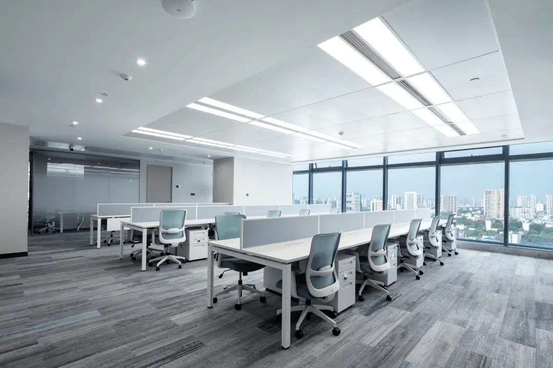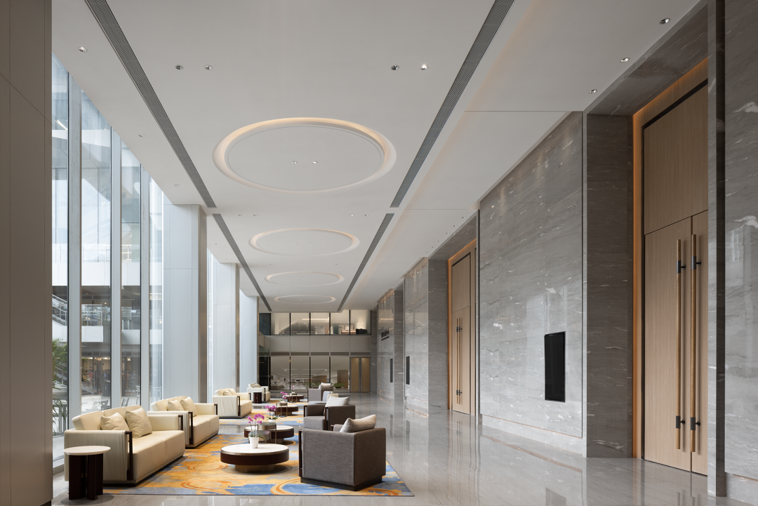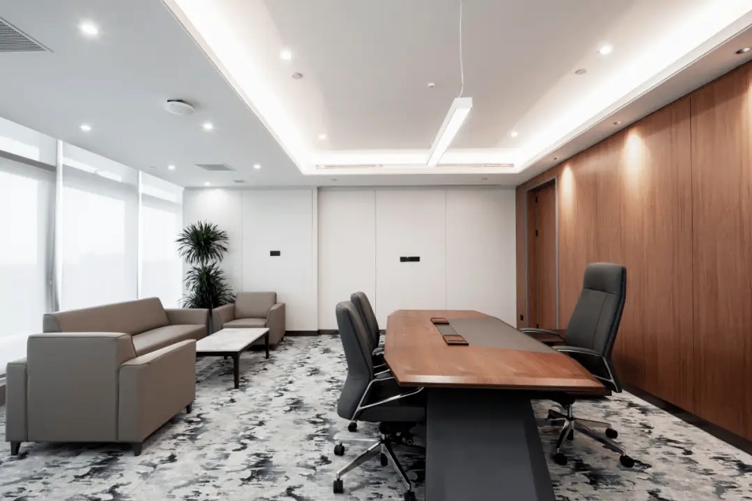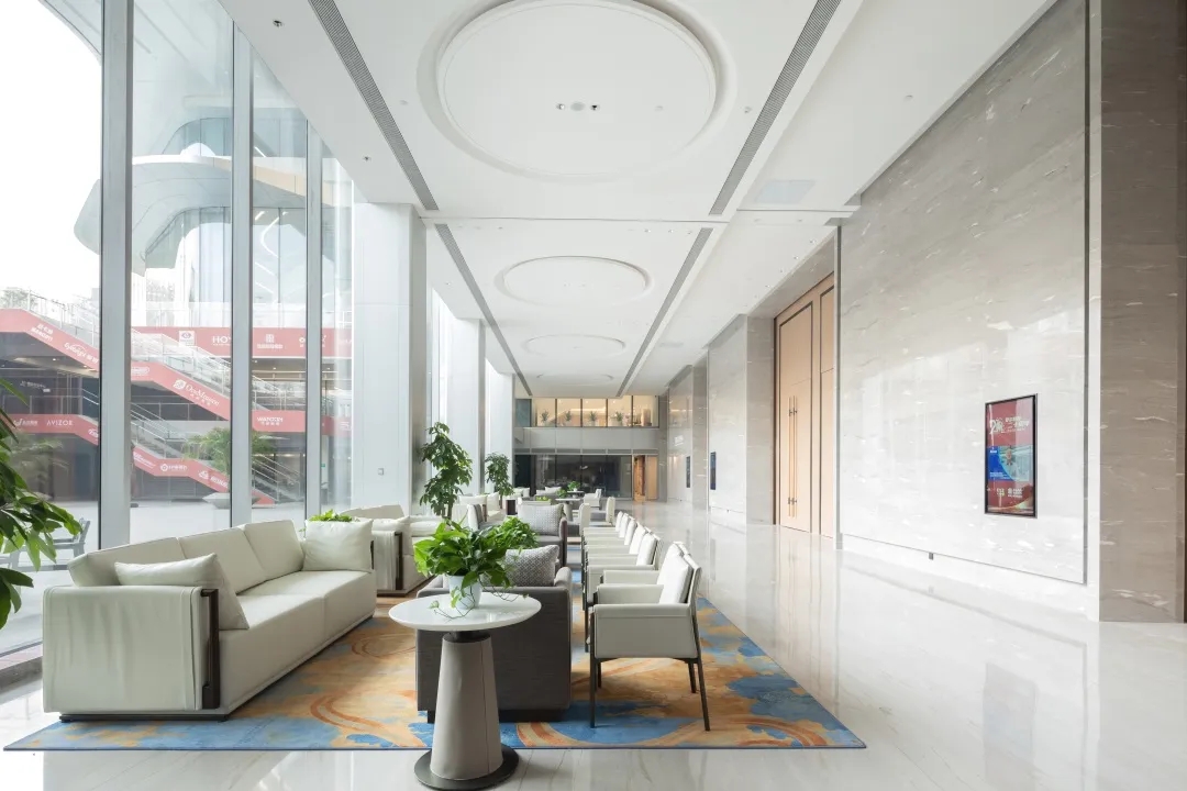 颠覆以往传统守旧的办公场所设计,从品牌理念与视觉设计到品牌体验空间的创建,打造国内眼科医疗领域的高阶办公地。从实用性与人性化角度出发,通过明亮的金属、轻盈的玻璃,带来多元空间体验,实现安全、高效、健康的办公环境,与简约大方、沉稳宁静的整体氛围。精心设计且具有视觉吸引力的大堂可以让人快速感知企业文化,直接影响着客户的第一印象,明亮宽阔的开放式办公区,便于交流沟通,面与面的隔开,保证一定的隐私性,融入绿灰色元素减少整个空间的压抑和枯燥,提高工作效率。大会议室前厅设有休闲区,在繁忙的工作之外能放松一下身心,劳逸结合,地毯使用绚丽的色彩来丰富整个休闲区域,增添活力。灯光多借助自然光,摆上舒适的沙发,简单的茶几,阳光穿过玻璃,无论是工作还是休息都会比较舒适惬意。大会议室注入了鲜明的活力,大面积线条感吊顶增加了氛围感,整铺地毯减少噪音,位置摆放具有结构性,方便出入也不显得拥挤。