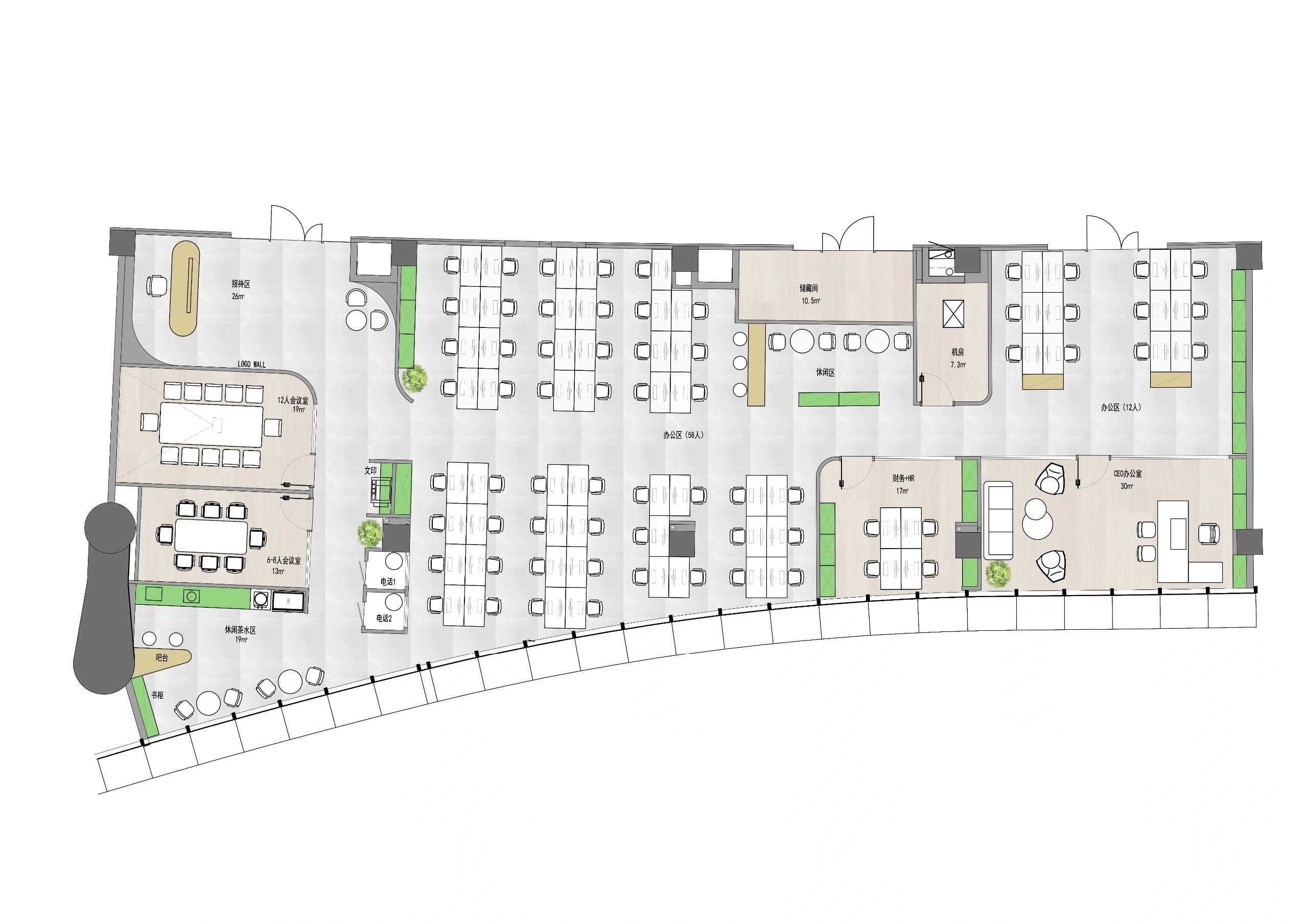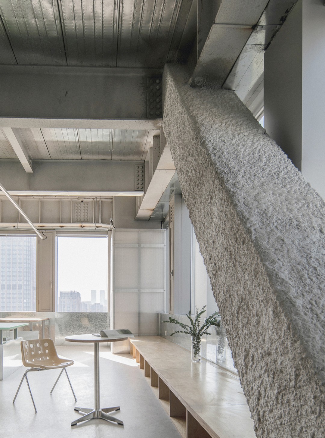 设计场地呈L型展开,梁柱纵横,场地净使用面积不足520平。命题不仅需要满足近百人的工作研发协作,同时希望通过加入一个丰富的超大体验的展陈沙龙交流空间,并且节材节料、经济高效是本次项目的重要指标。几言认为有限预算紧凑工期下的设计创新,绝非品质细节单一维度的较量,我们认为应该通过明确有效的空间决策手段创造一种感受的差异化打动人心,同时反向思考,尽可能将空间的不利条件最大化差异利用。关于空间策略:我们创造了三个清晰的空间状态:巨构尺度的办公坊+高度复杂的研发黑盒+沉浸互动的展示中枢,一起营造了原生自然,自由高效,场景变化的整体办公氛围,虽然项目处于林立的CBD楼宇中,我们希望高效办公之余是一种,松弛有度的场景状态,如同广场漫步,我们称它为“XRZLUX超级办公广场”!