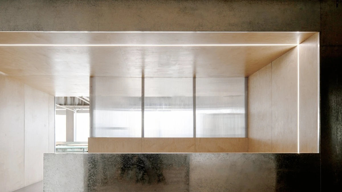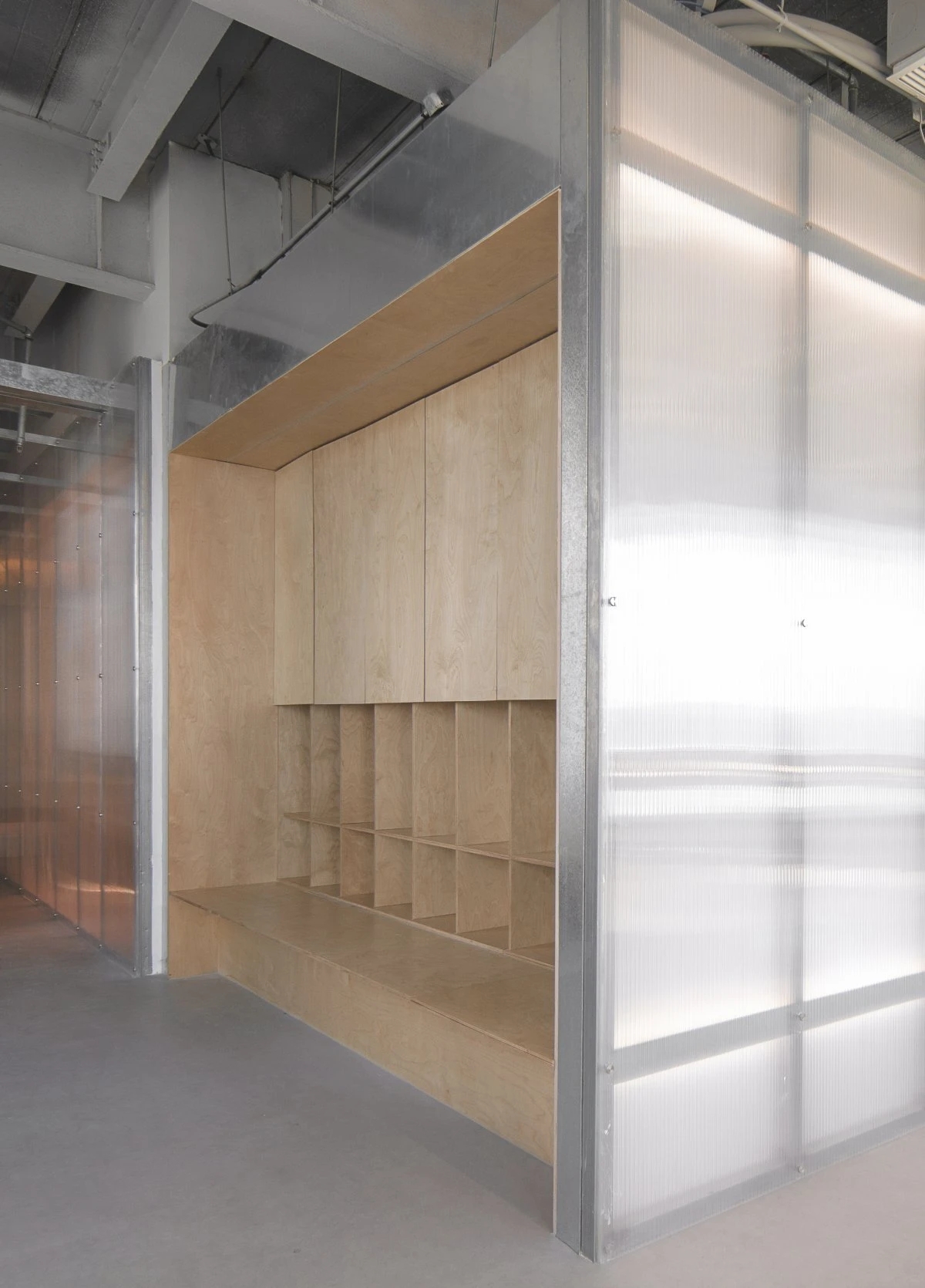 最后实现的XRZlux超级办公广场,一方面是精密的黑盒囊括了丰富复杂功能,同时黑盒入口多元,让空间神秘变换路径多元趣味需要探索。天然原生裸露的结构给空间创造了更松弛自然的感受,另外黑盒之外的办公空间高效布置,释放出大量的向阳空间,提供丰富的自由性。整体体验主次有序,松弛有度。除了办公之外,应对丰富的配套功能,以及丰富体验的展示需求。我们利用阳光板加镀锌管的构建方式营造了一个盒子的边界,边界将各项功能收入囊中,像精密芯片一样就精确的安置功能和路径,虚实组合丰富多元,我们称之为神秘黑盒。在黑盒中部我们利用九宫格布局,巧妙的让有效空间,路径更加丰富变换,实现更加丰富的展陈体验。核心展陈位于最中心,既是展览空间的一部分同时满足10-20人的沙龙交流可行性,是空间的中枢,也是品牌精神的传递所。