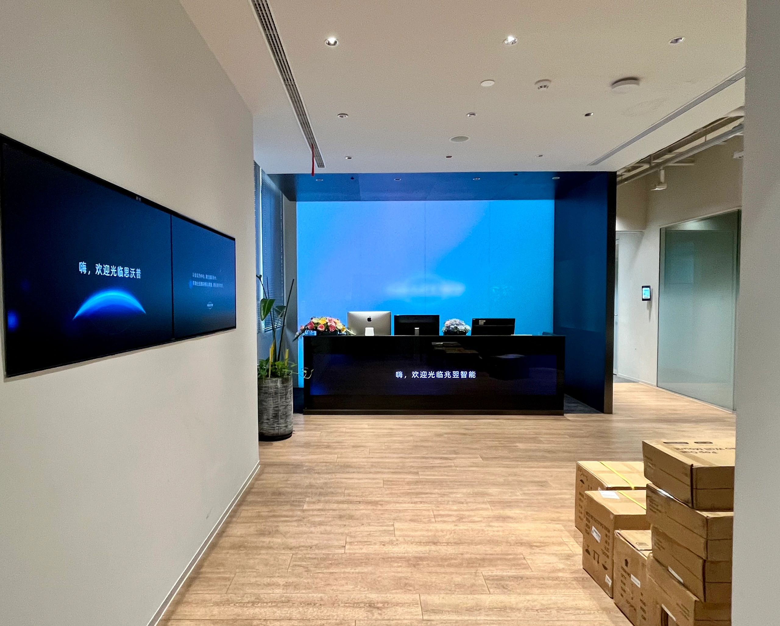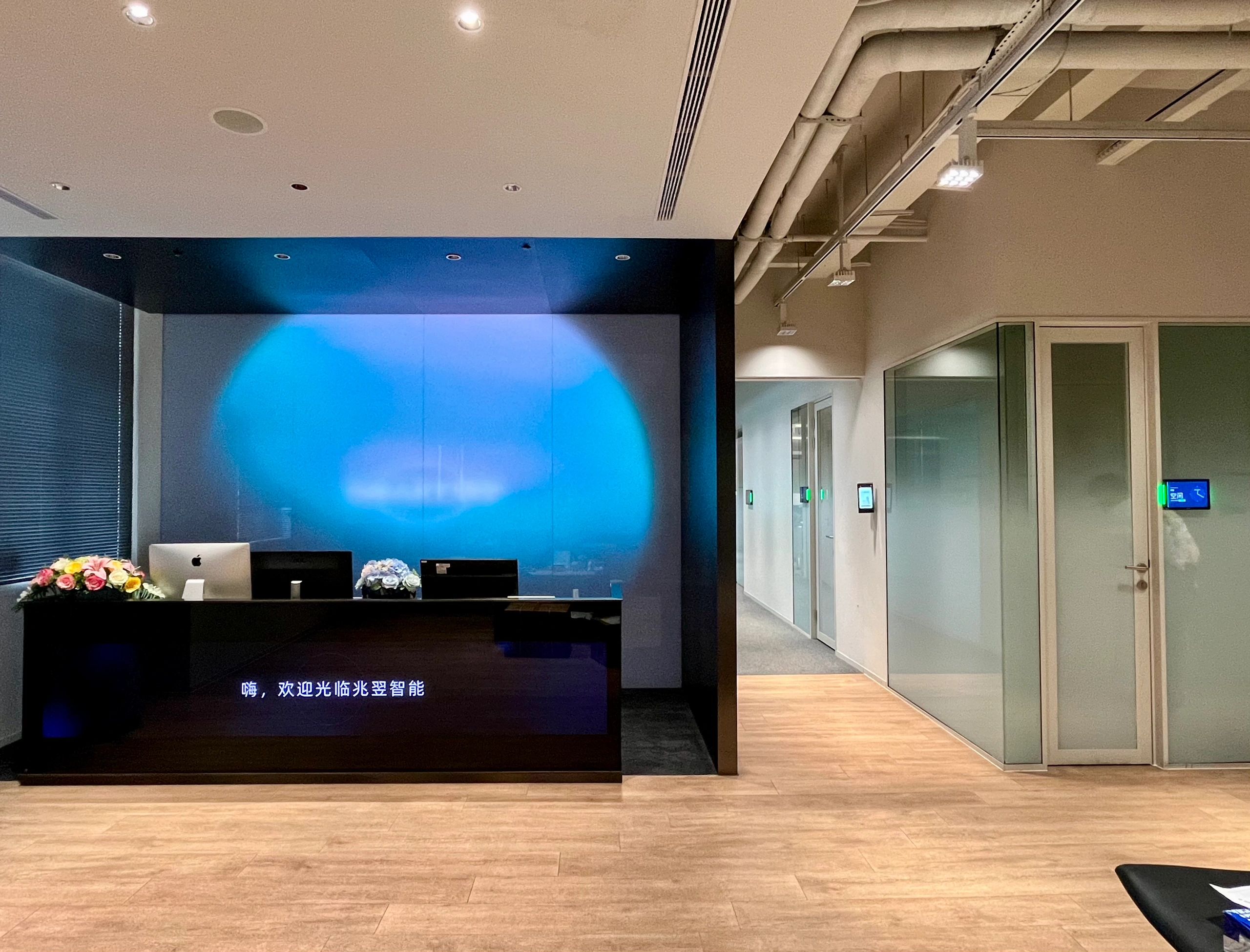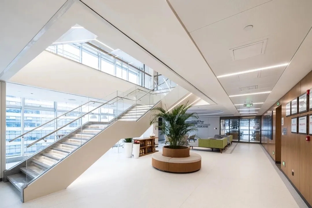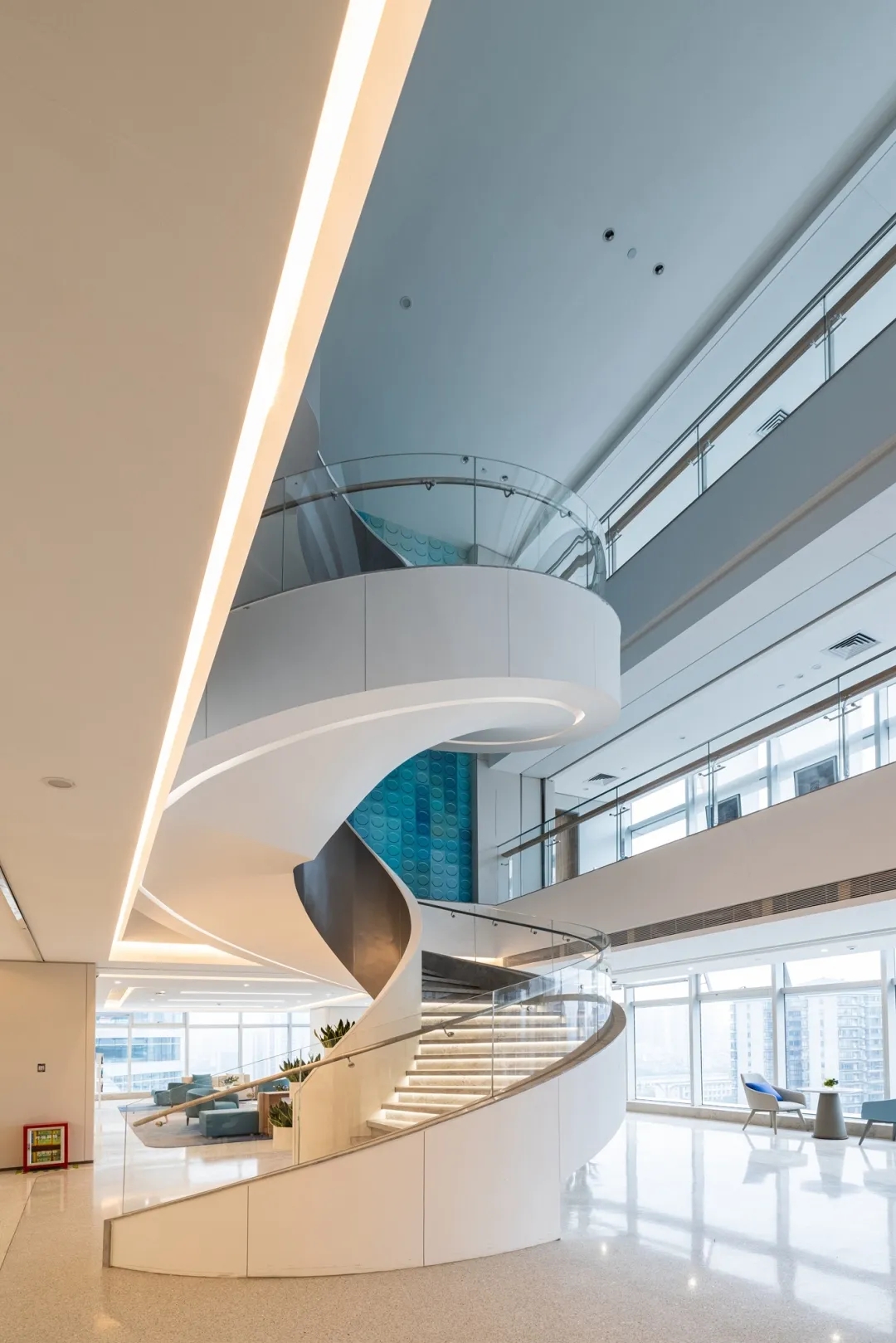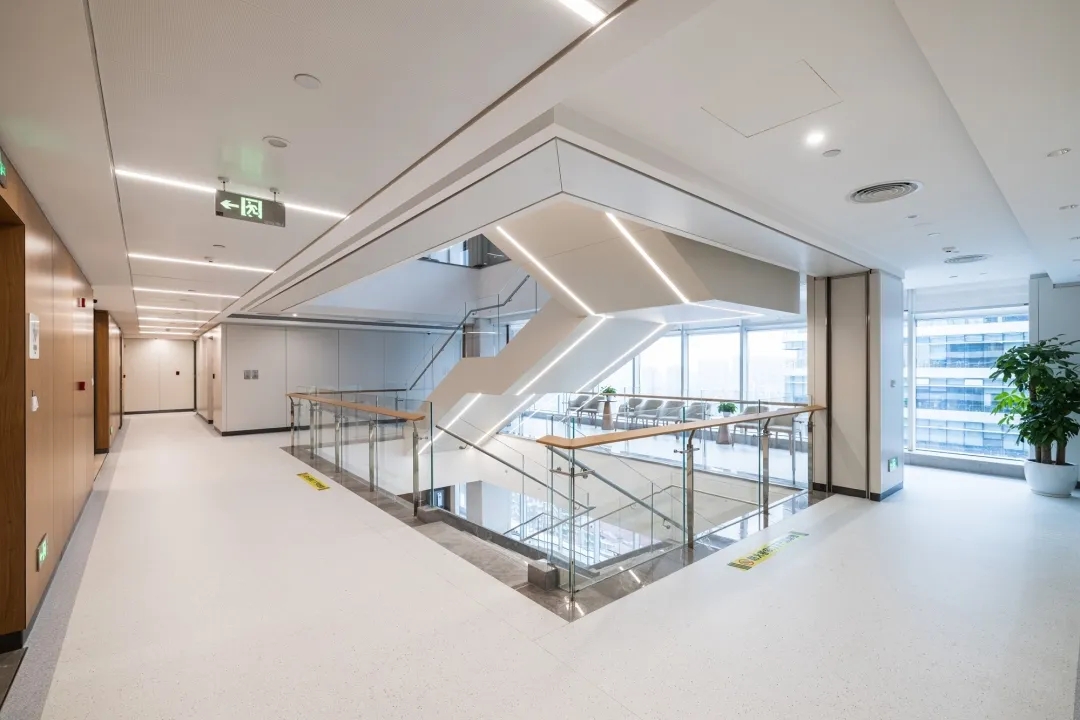 创新园区内一栋五层楼白色建筑内,作为照明公司的展厅与办公室,一楼的开放式庭园通过转角阶梯连接至二楼露台。