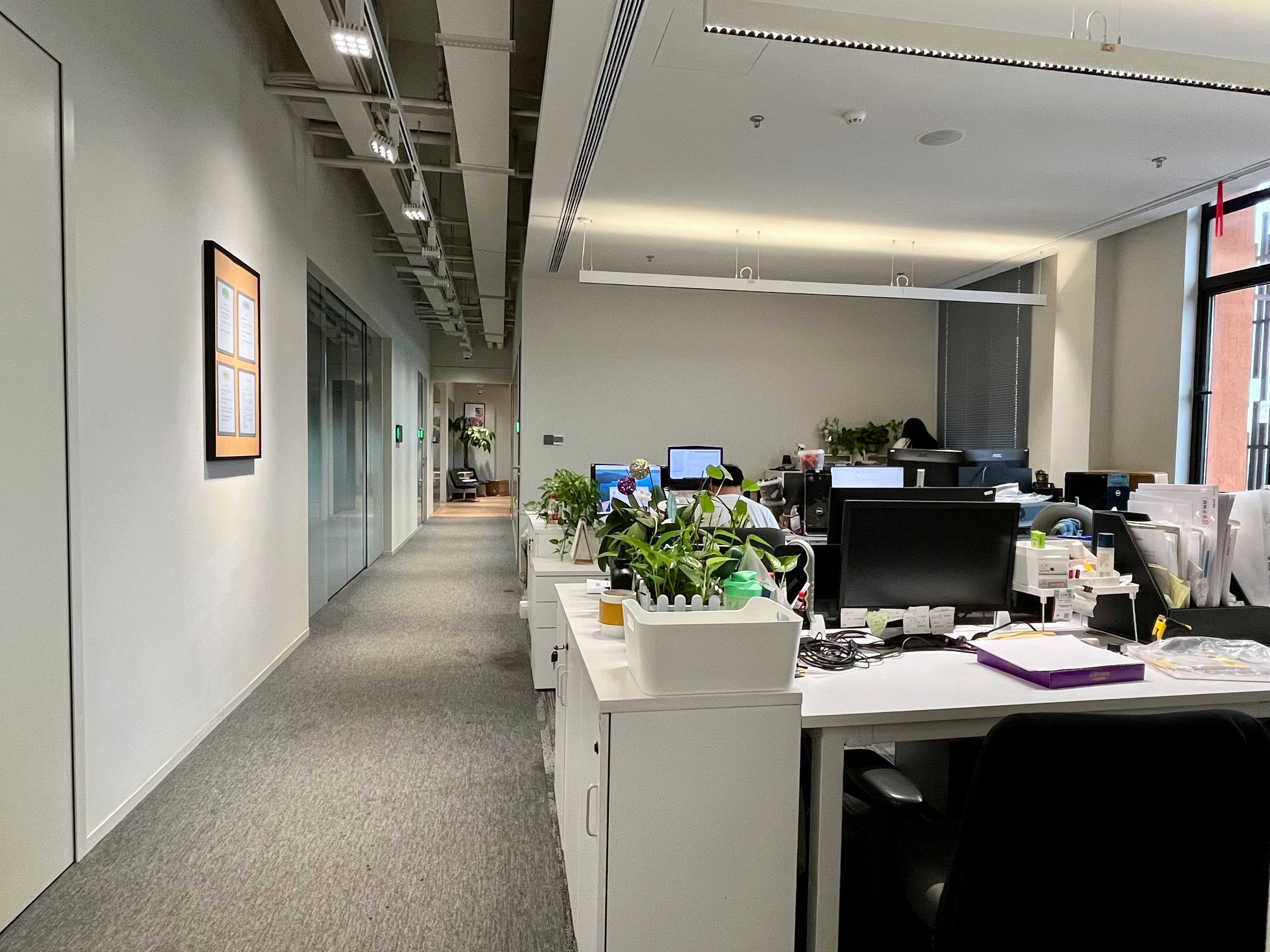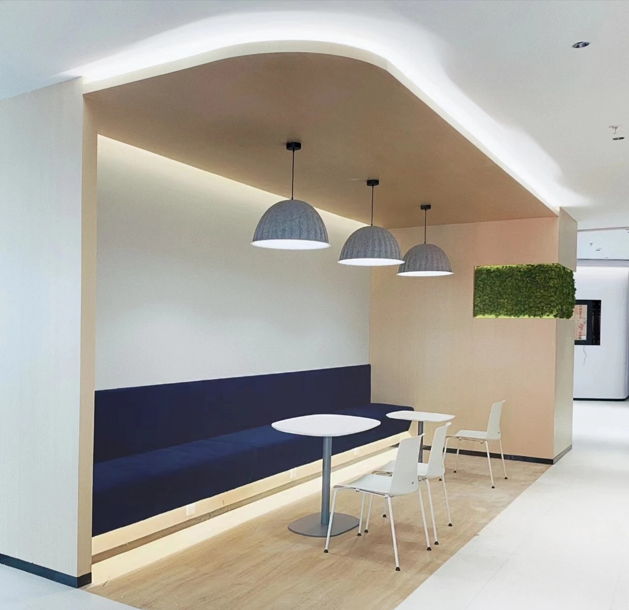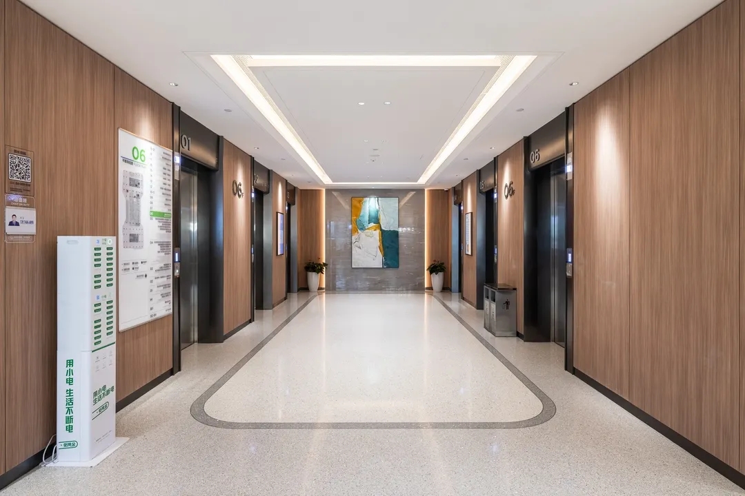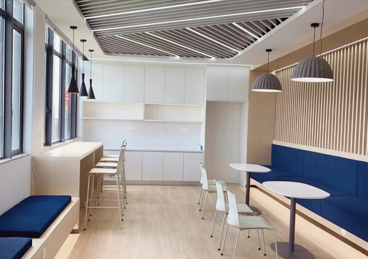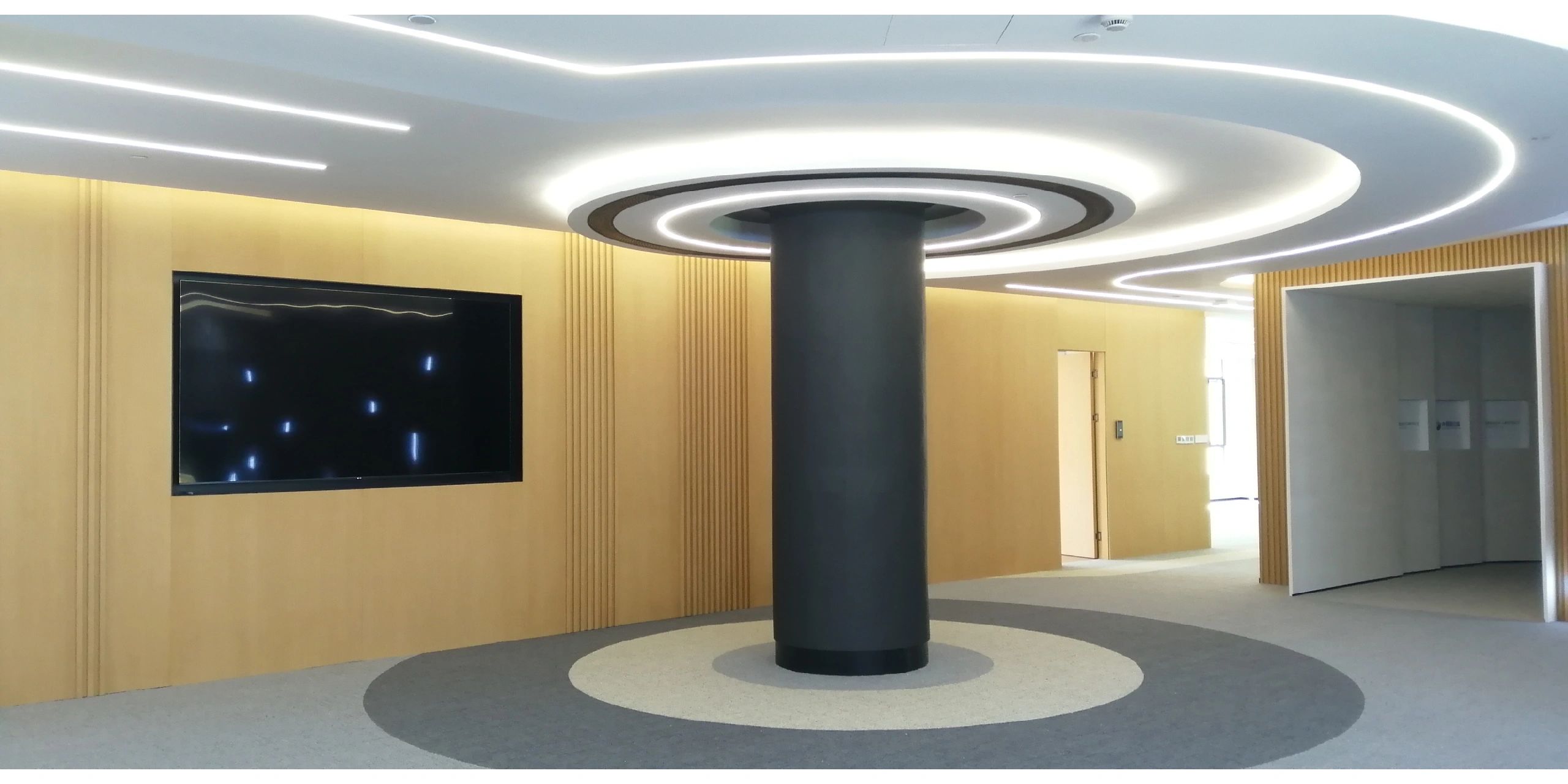 创新园区内一栋五层楼白色建筑内,作为照明公司的展厅与办公室,一楼的开放式庭园通过转角阶梯连接至二楼露台。