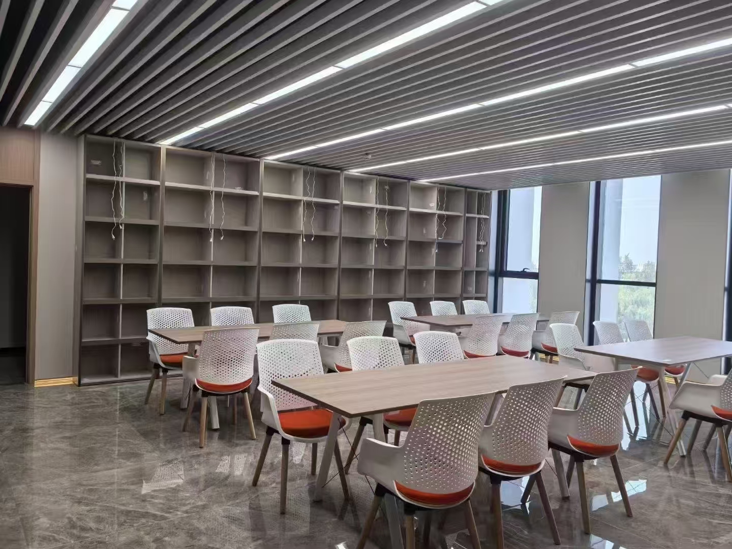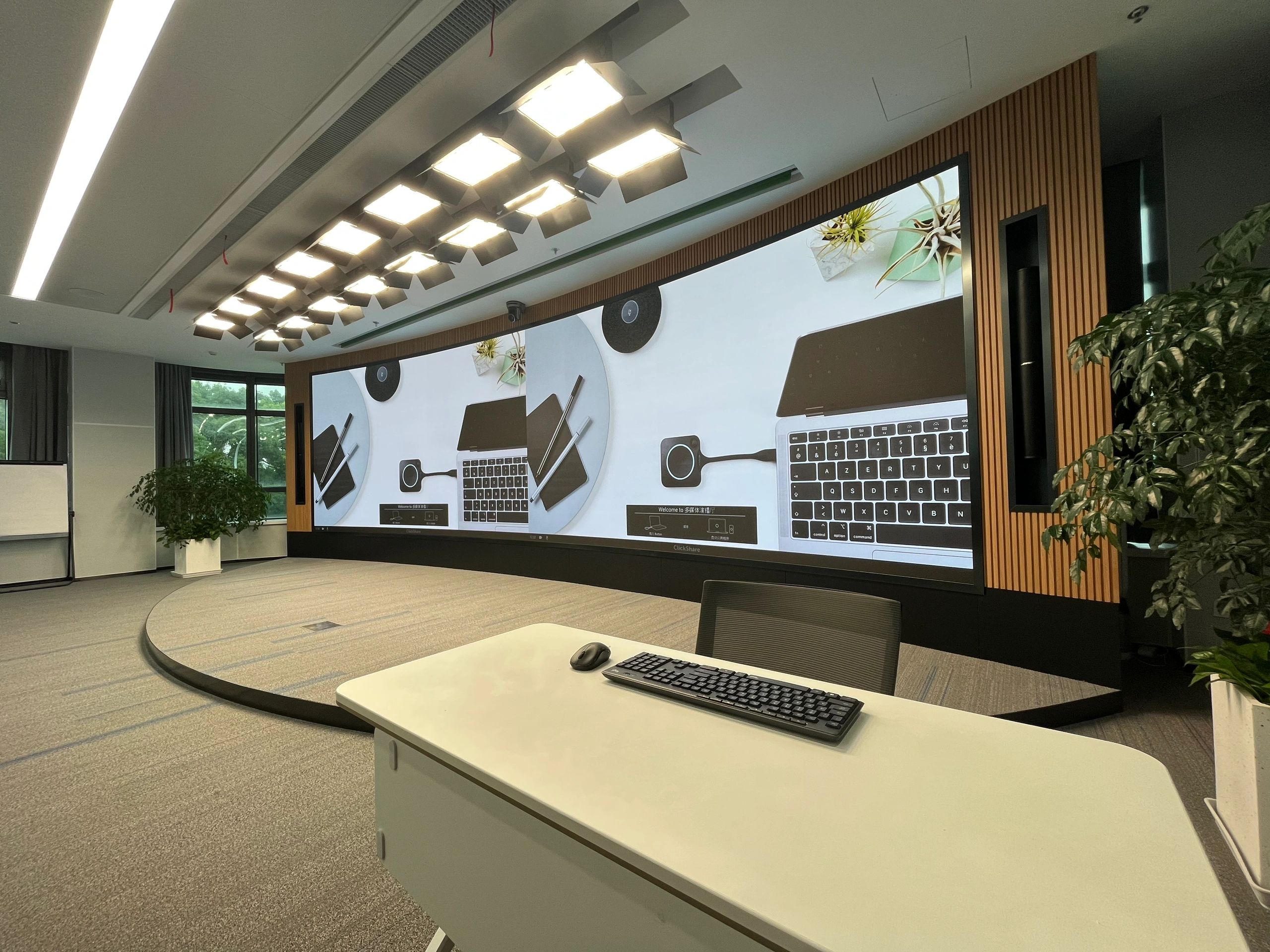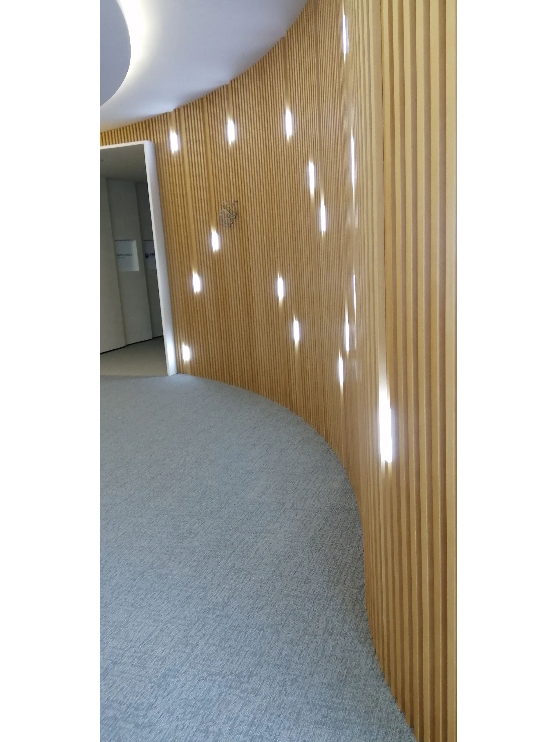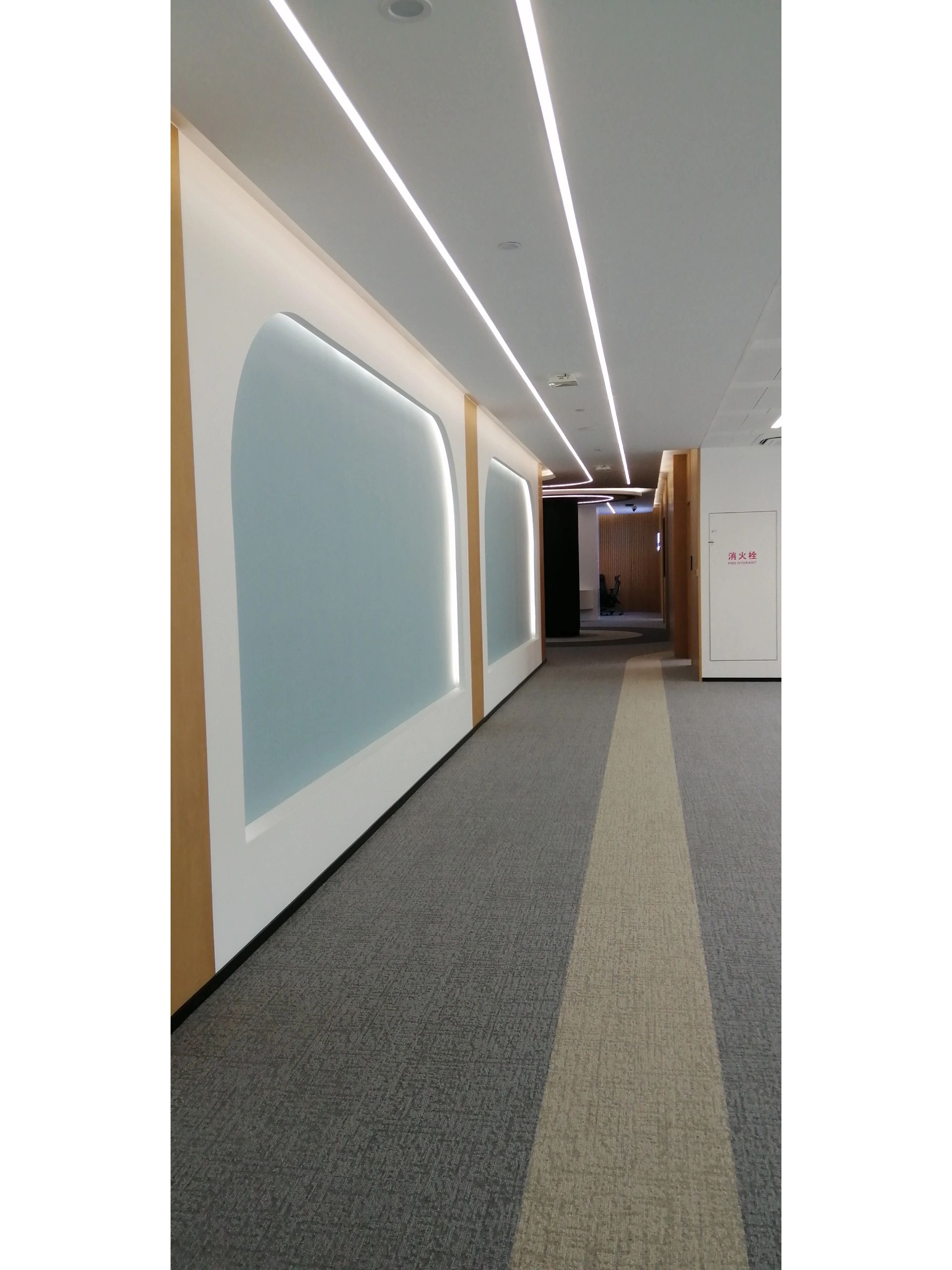 创新园区内一栋五层楼白色建筑内,作为照明公司的展厅与办公室,一楼的开放式庭园通过转角阶梯连接至二楼露台。