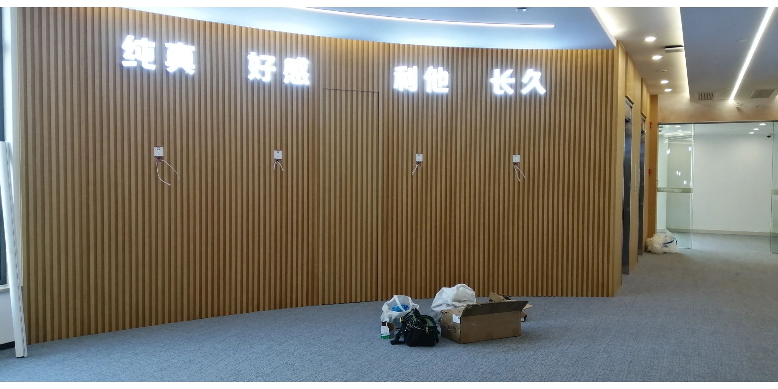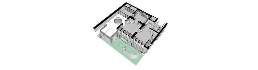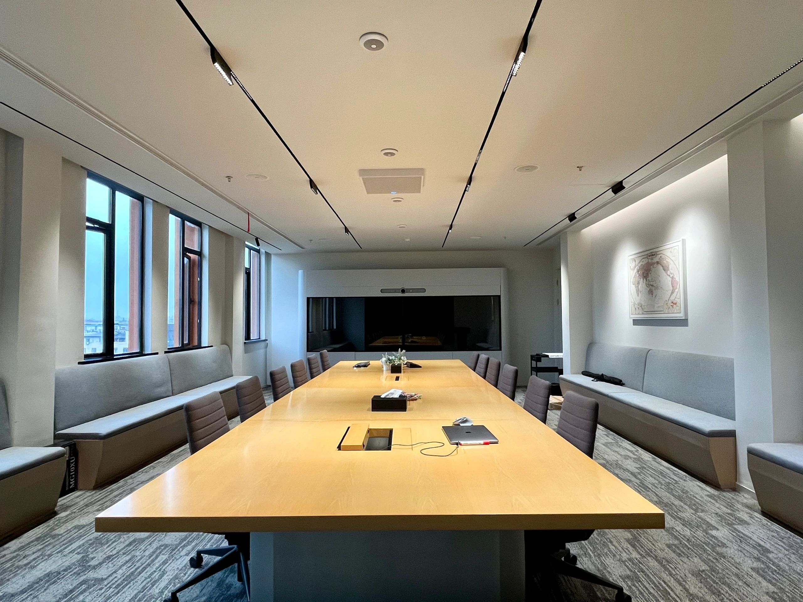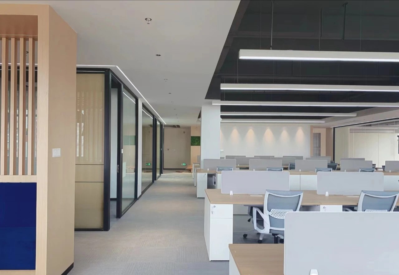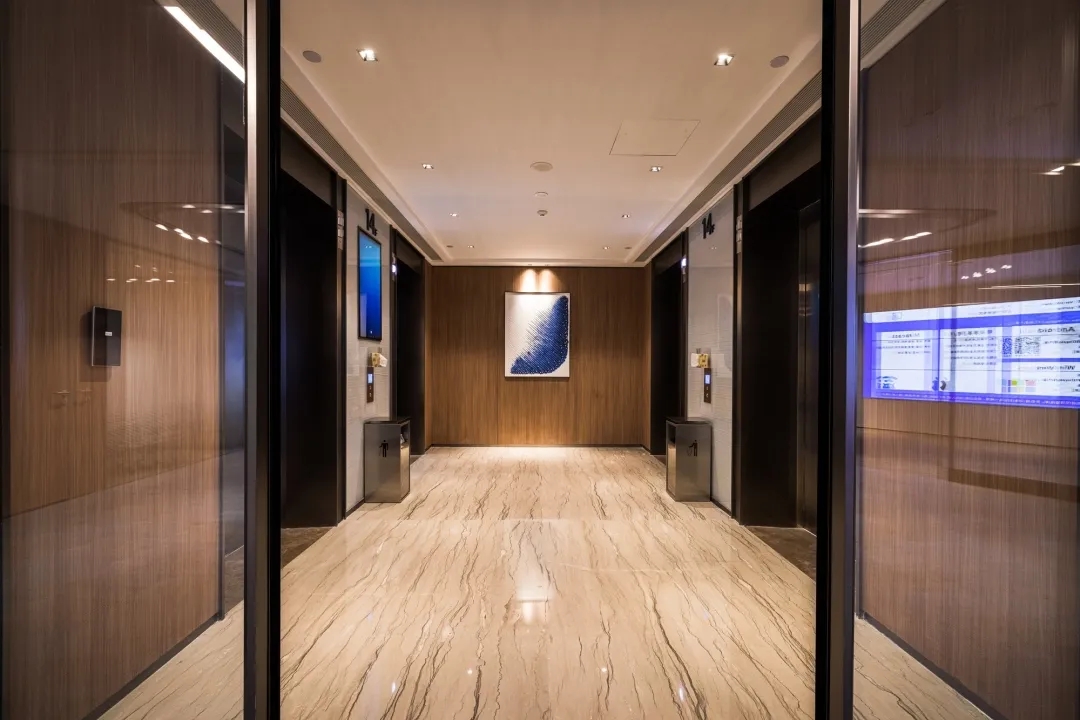 创新园区内一栋五层楼白色建筑内,作为照明公司的展厅与办公室,一楼的开放式庭园通过转角阶梯连接至二楼露台。
