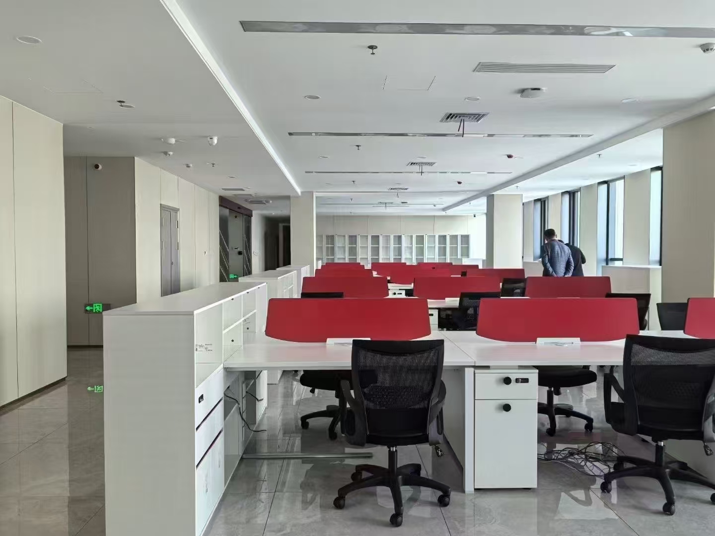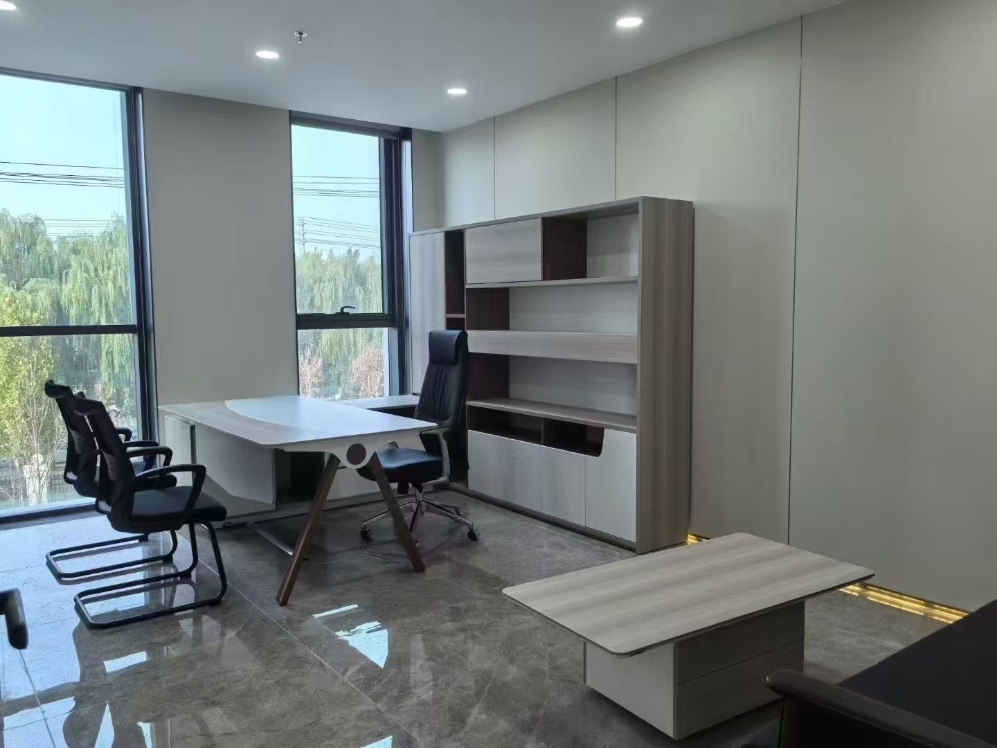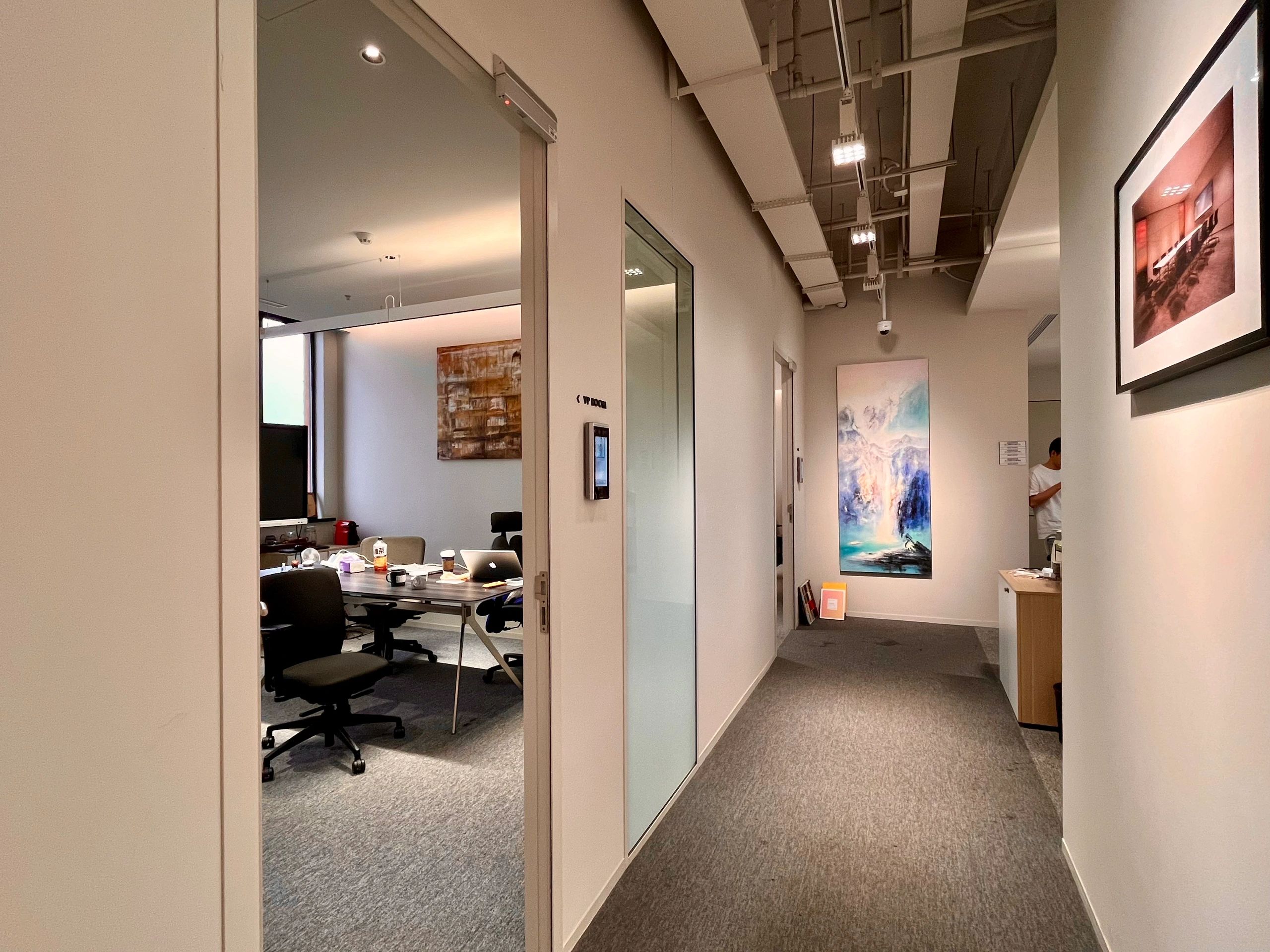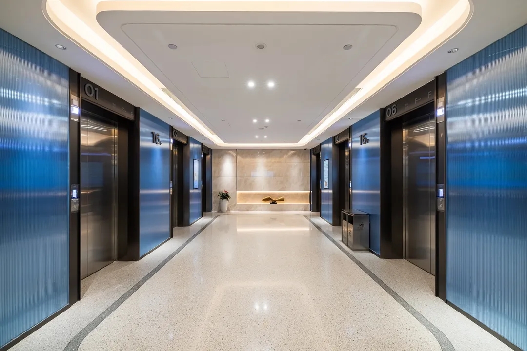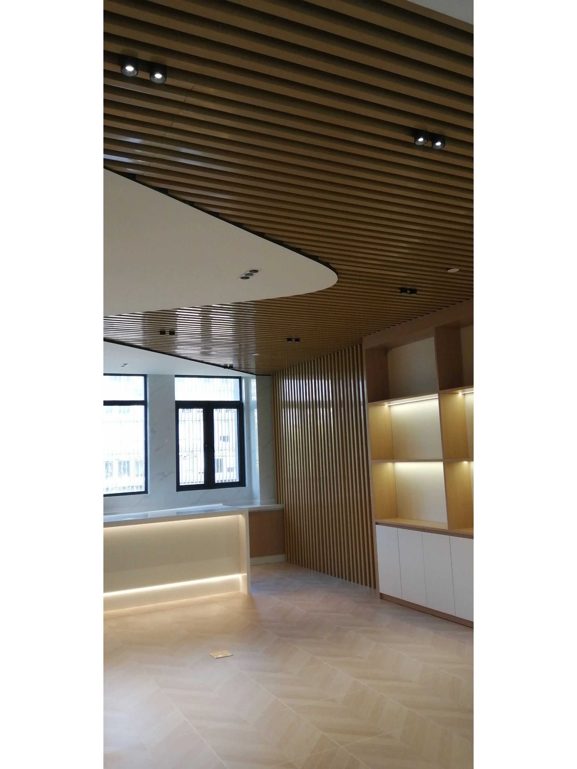 创新园区内一栋五层楼白色建筑内,作为照明公司的展厅与办公室,一楼的开放式庭园通过转角阶梯连接至二楼露台。