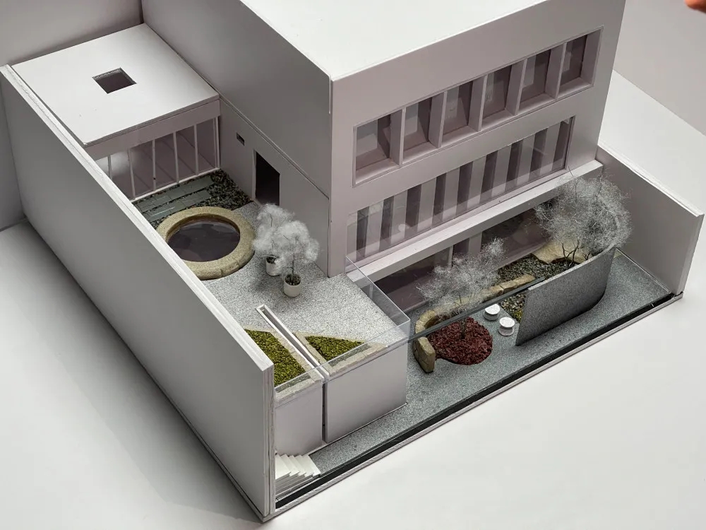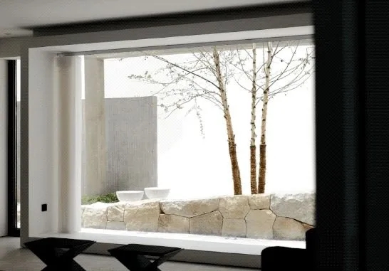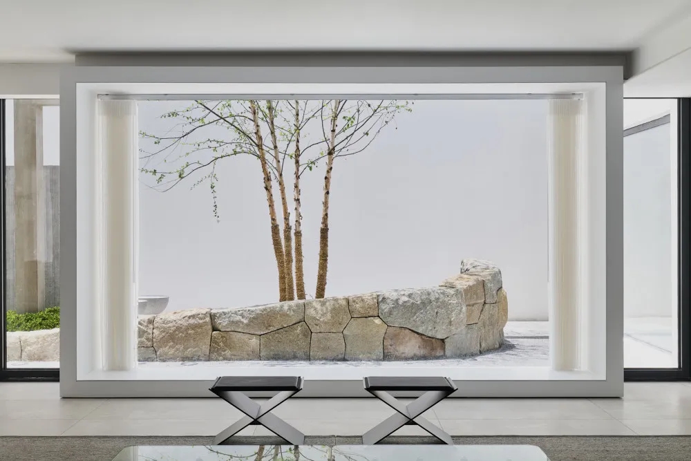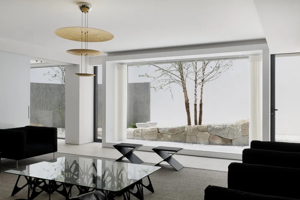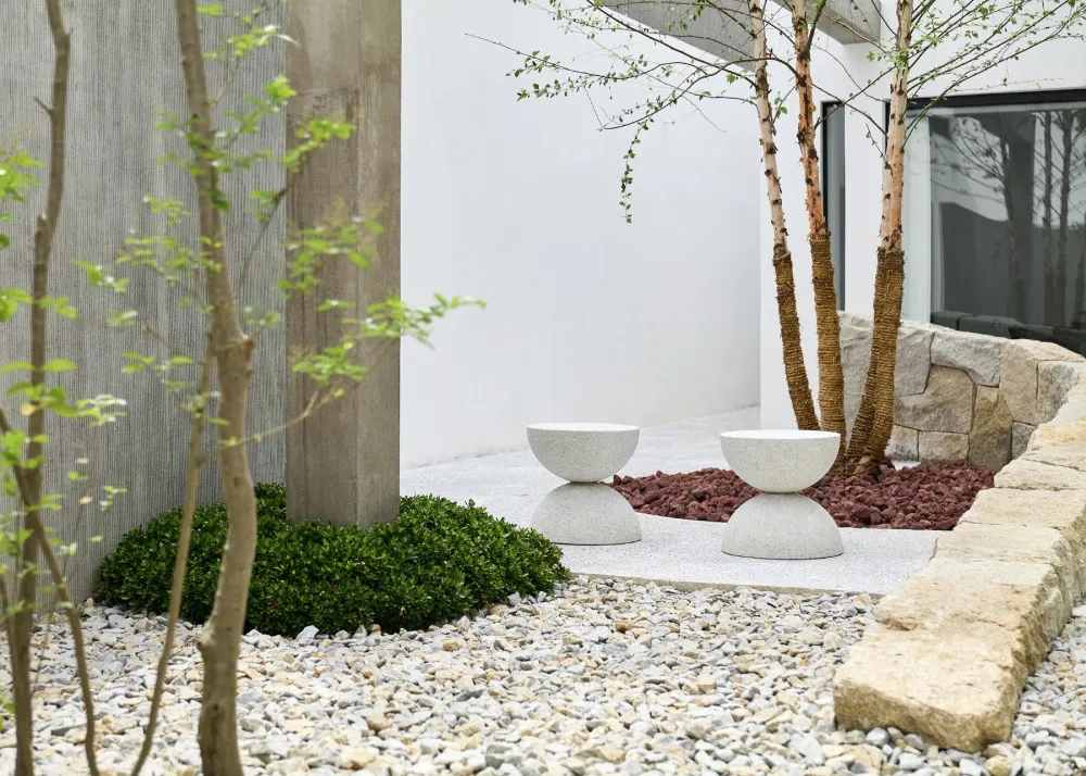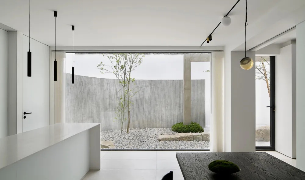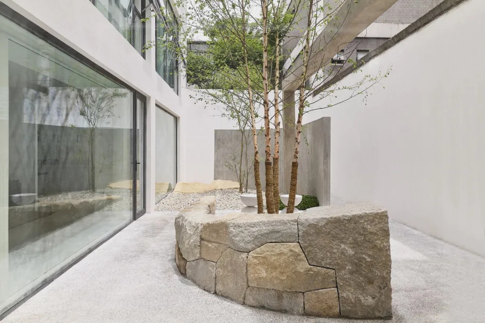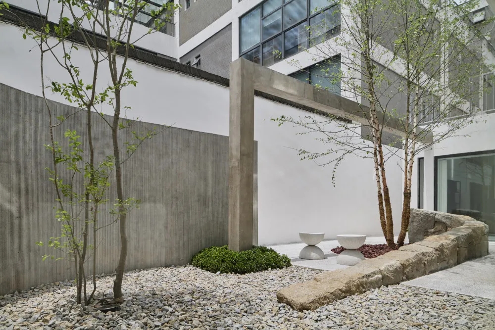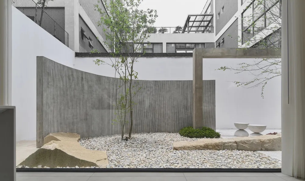 庭园在拥有天光云影的同时,由于建筑本身极富几何秩序,以及室内爽利简洁的线条为庭园设计提供灵感,将空间氛围延续。