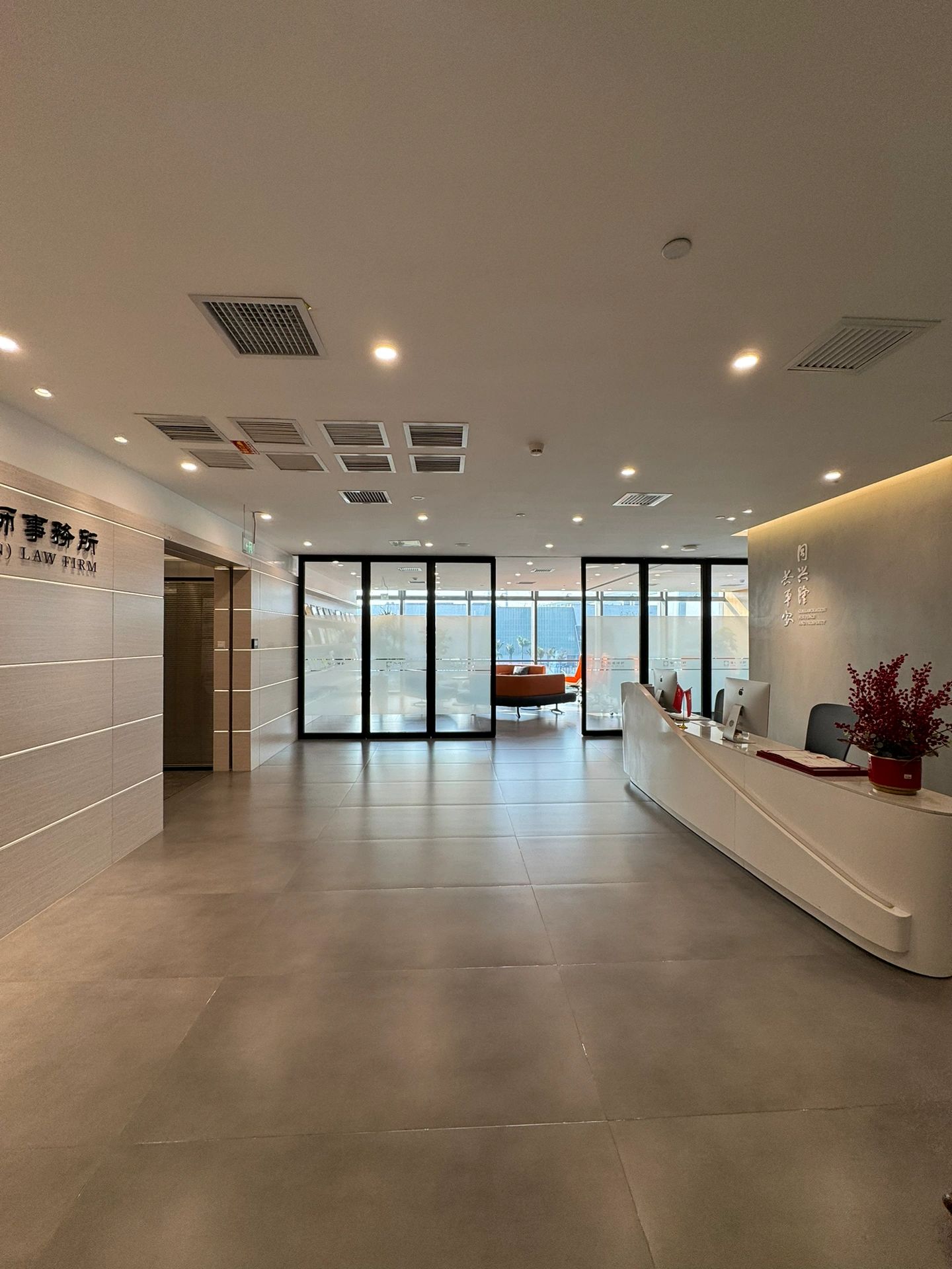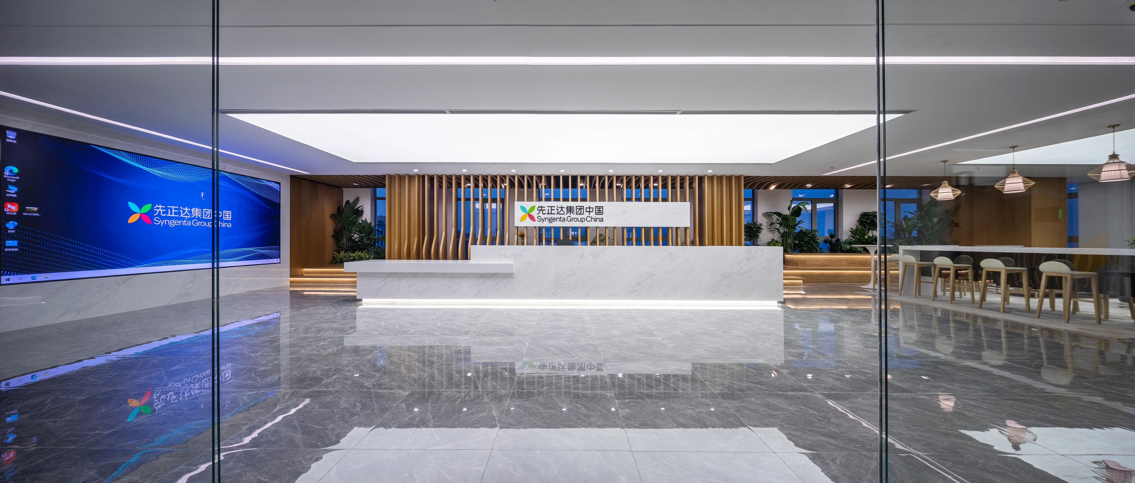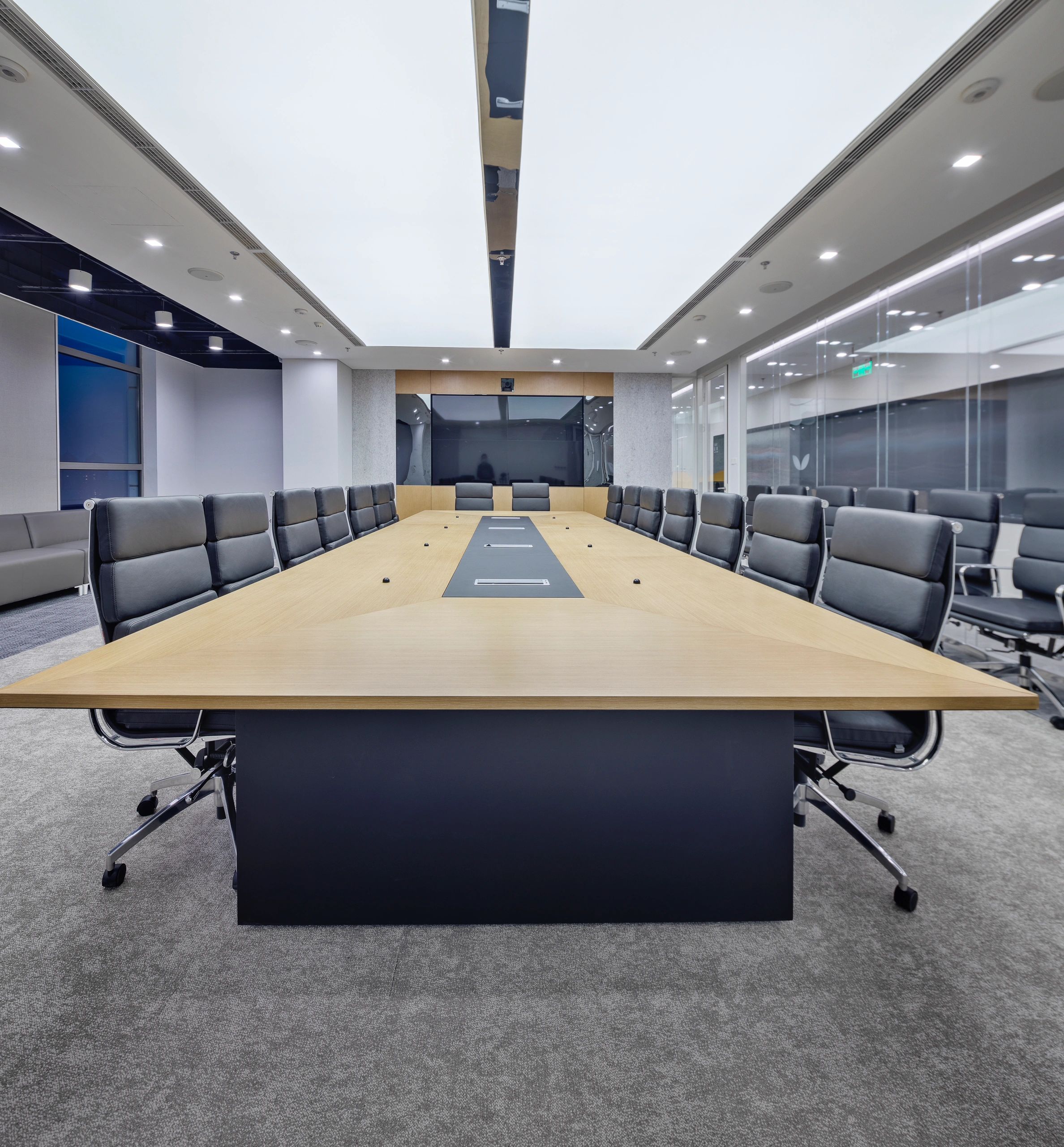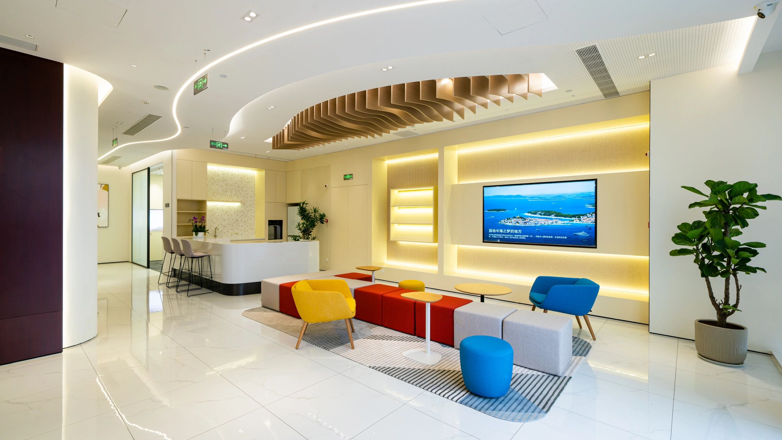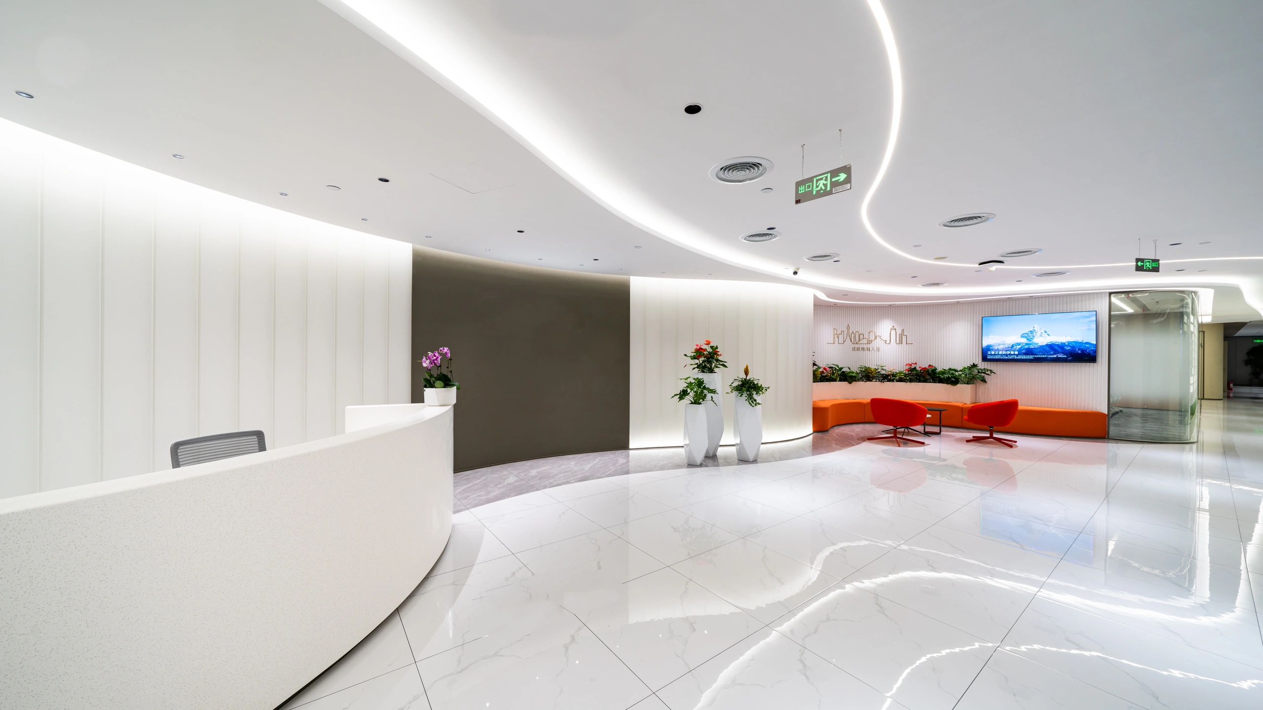本次设计的主题:“水波”。从一下电梯厅,引入眼帘就是上下两层的水波纹LOGO墙面,大小不一的波浪一浪推着一浪,在统一的节奏下又有着细小的变化,而且正好巧妙的延申出前台。再往大厅的左侧到茶水区,波浪型的折板在天花上的运用,即开放又有变化,而且在形式上,正好解决外建筑折叠不规则的幕墙。