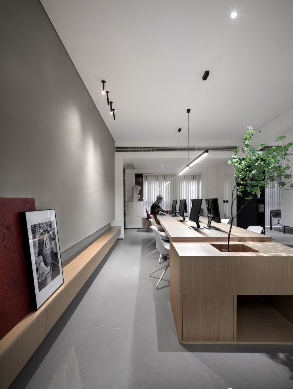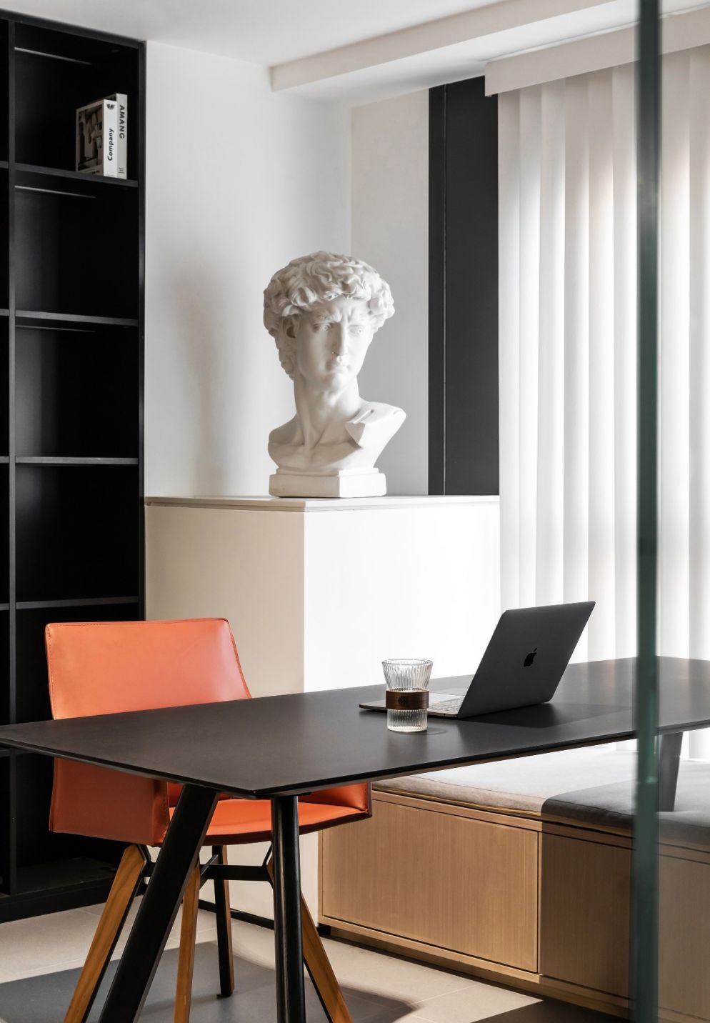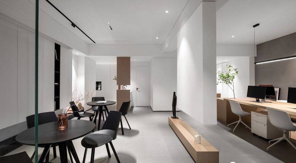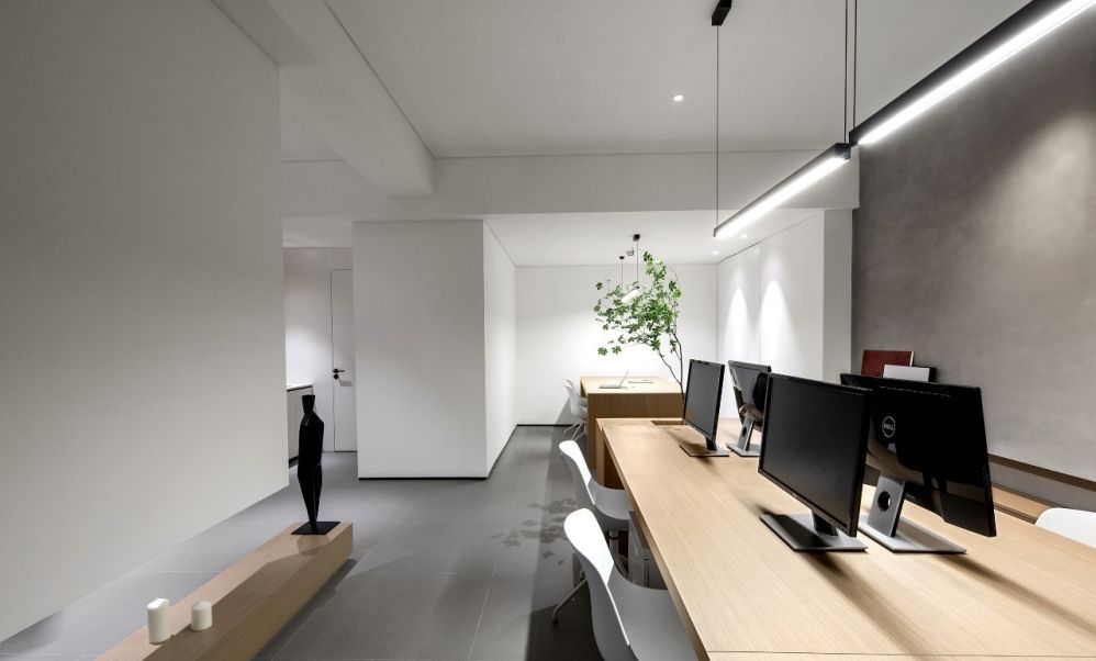 整体颜色以黑、木、白为主,不做多一分的装饰,虚实留白,方寸之地亦显空间之宽。暖调木纹台面办公桌与冷调的水泥灰背景,冷暖适度。