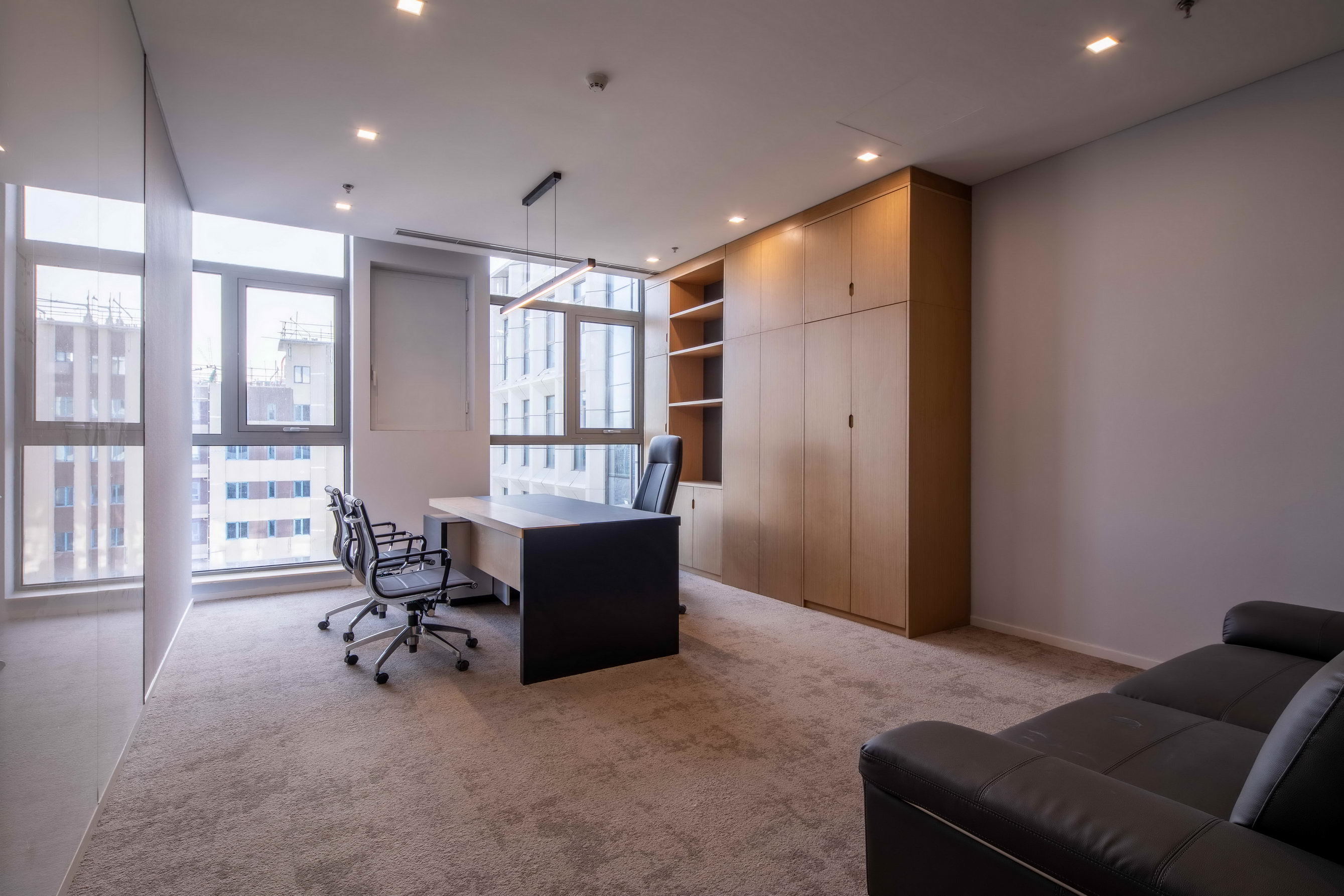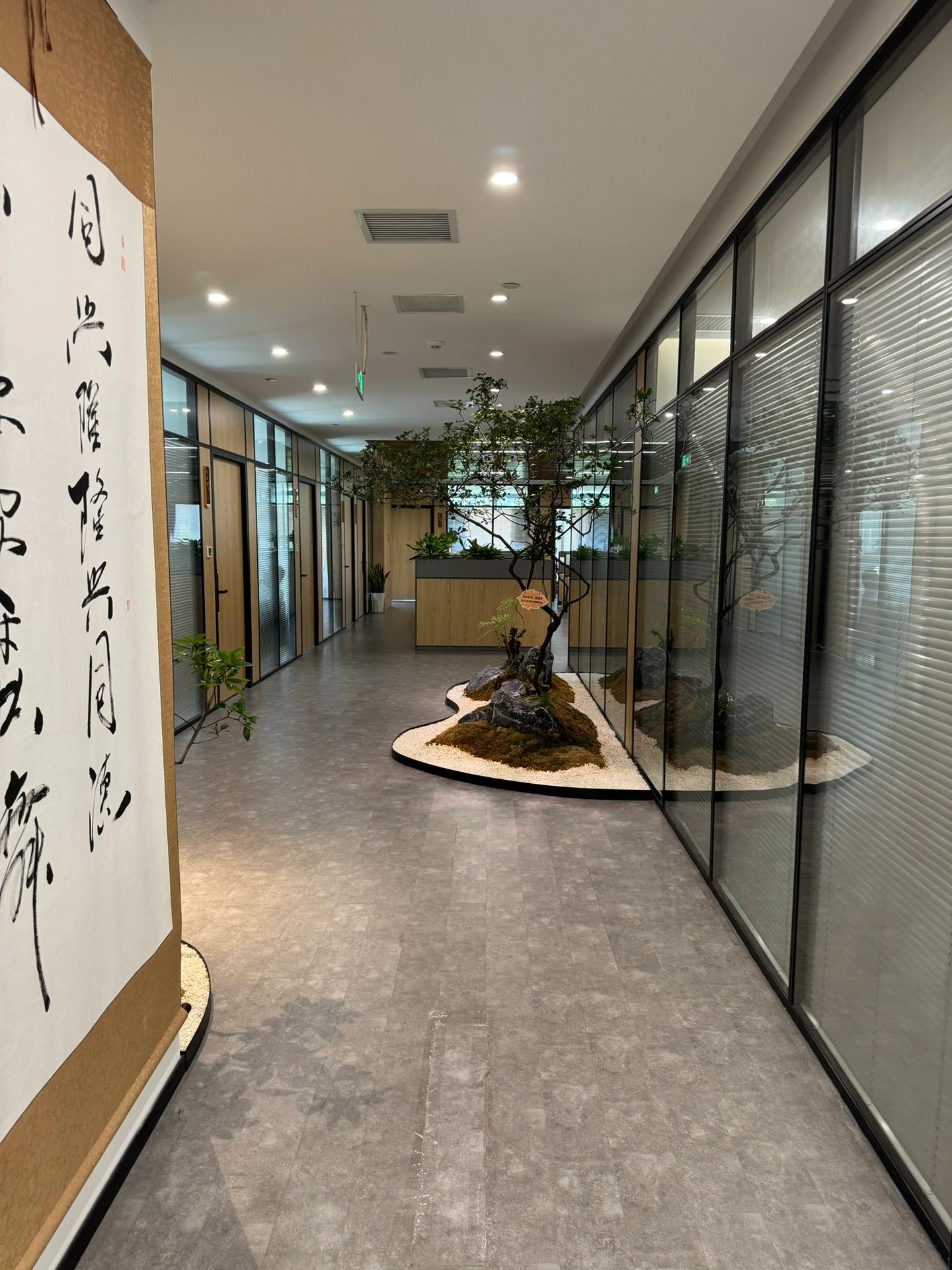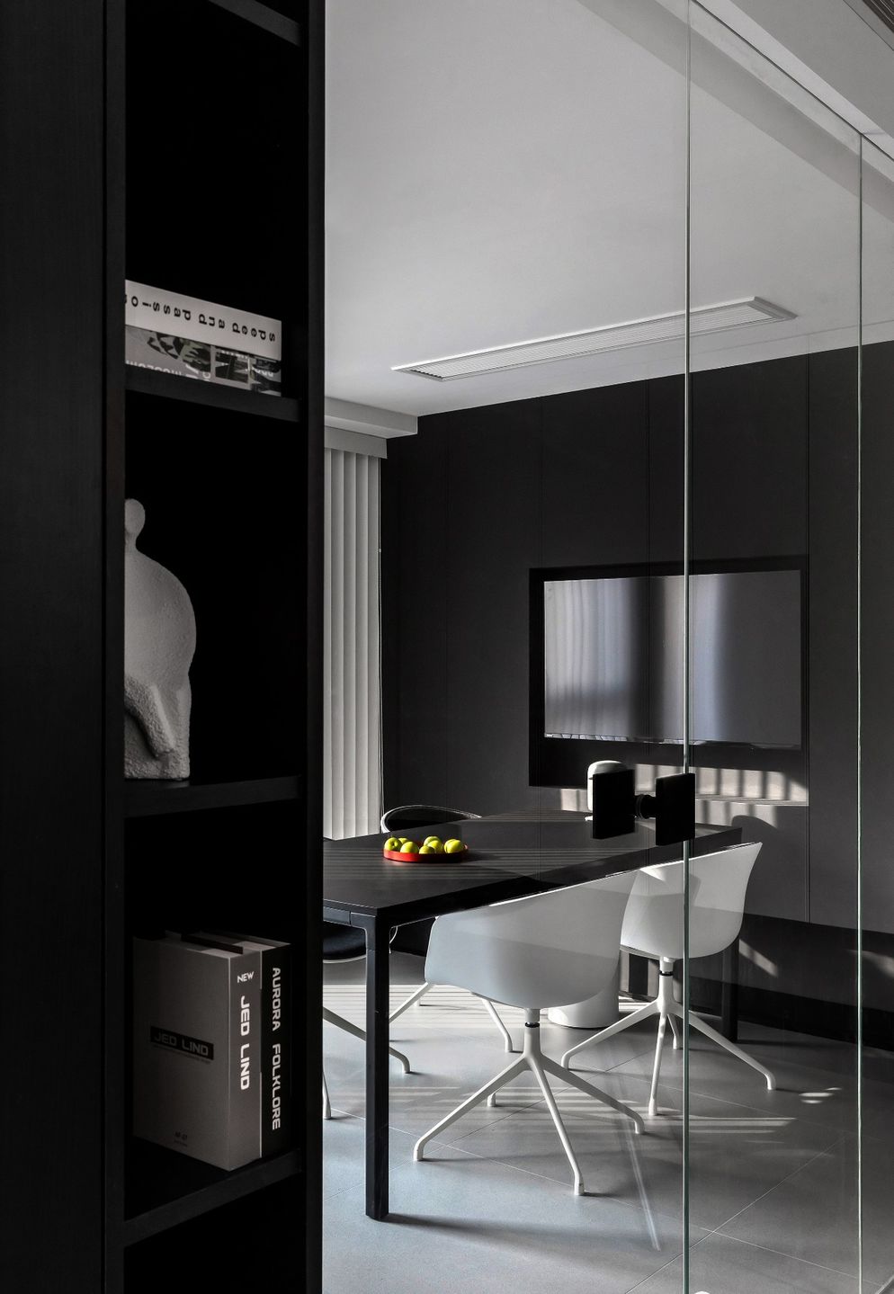 整体颜色以黑、木、白为主,不做多一分的装饰,虚实留白,方寸之地亦显空间之宽。暖调木纹台面办公桌与冷调的水泥灰背景,冷暖适度。