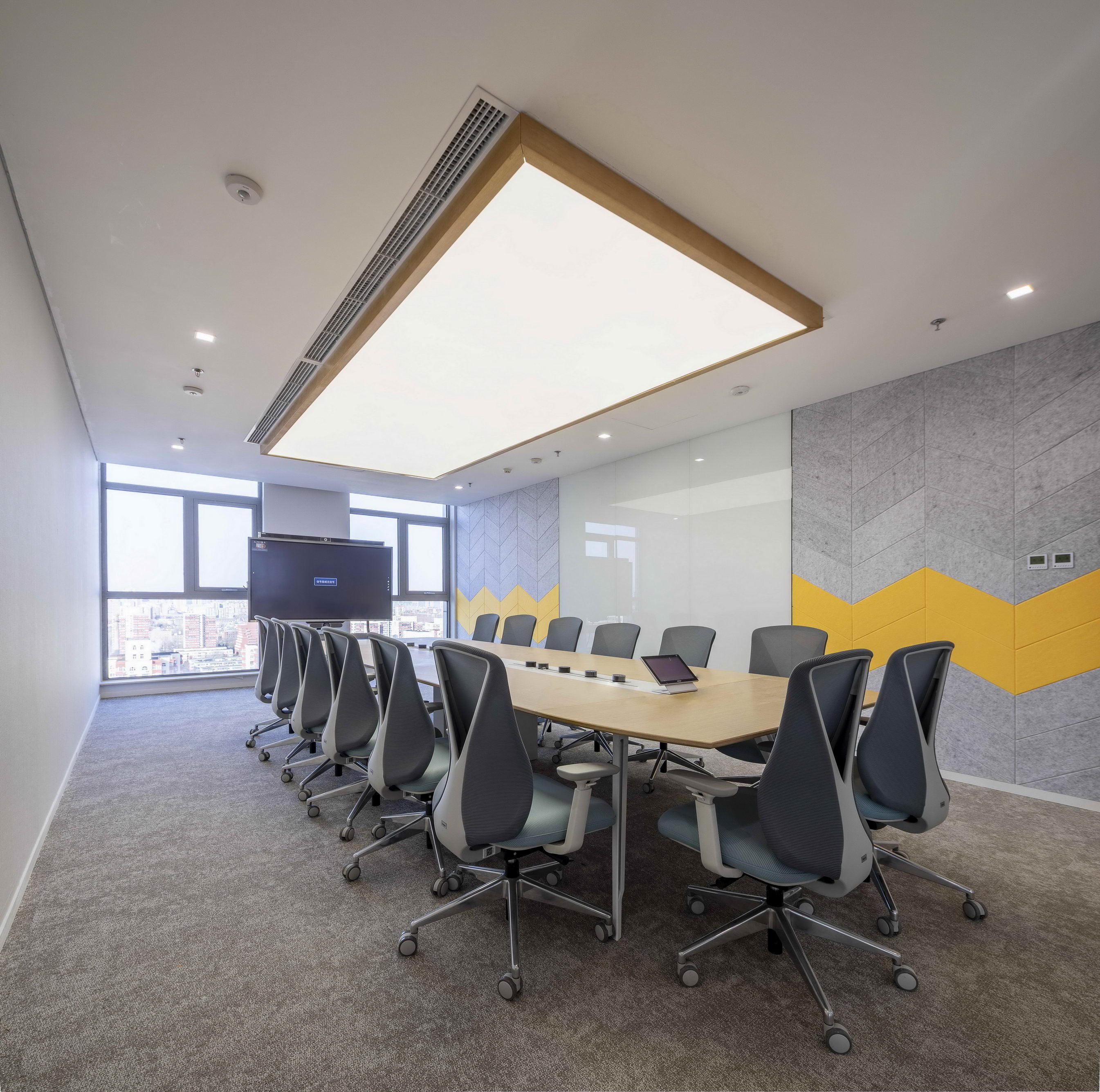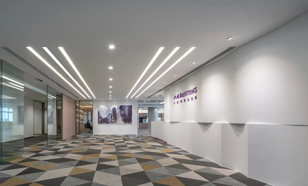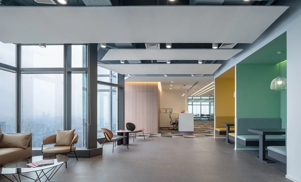 另外还有一个需求就是希望空间有色彩。这是因为长沙的气候为多雨天,阴雨绵绵灰色的城市色调怎给人有郁闷之感。从以上两个方面考虑,设计中采用大量色彩材料的运用,从前厅的拼色编制地毯、到茶水区的彩色卡座,到活动家具的搭配,都是这一需求的具体体现,还有办公区浅蓝色天花处理,都是在往明快、活力的办公氛围引导。