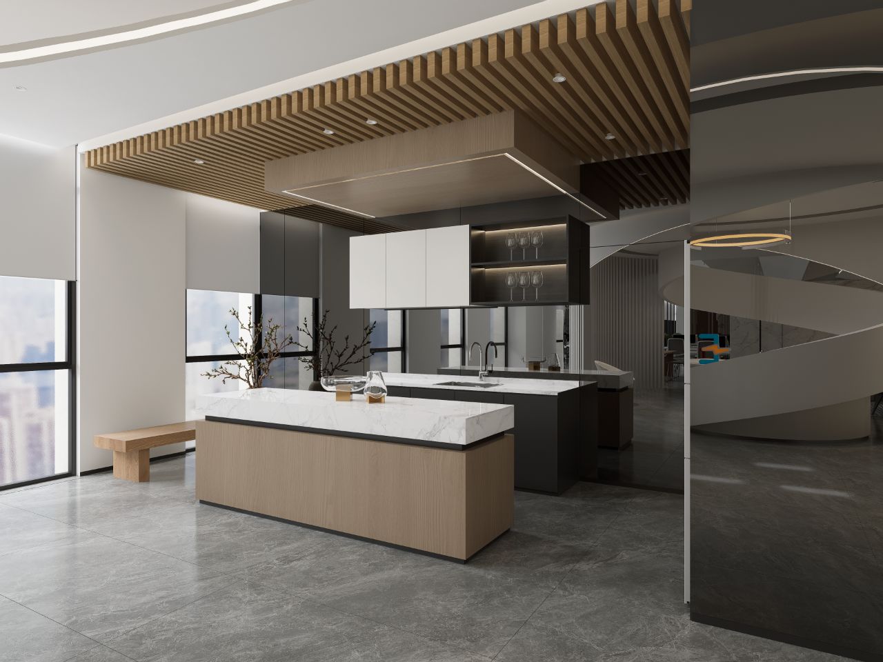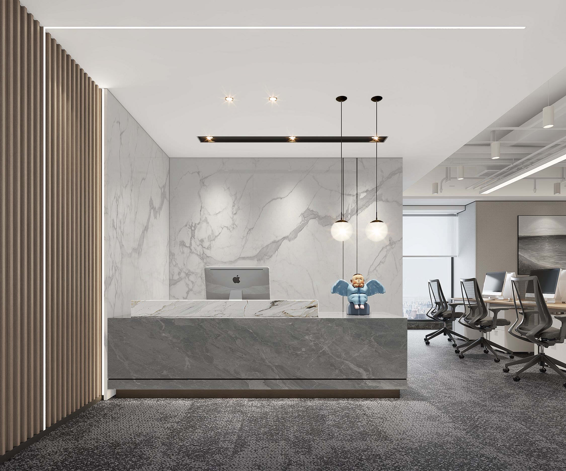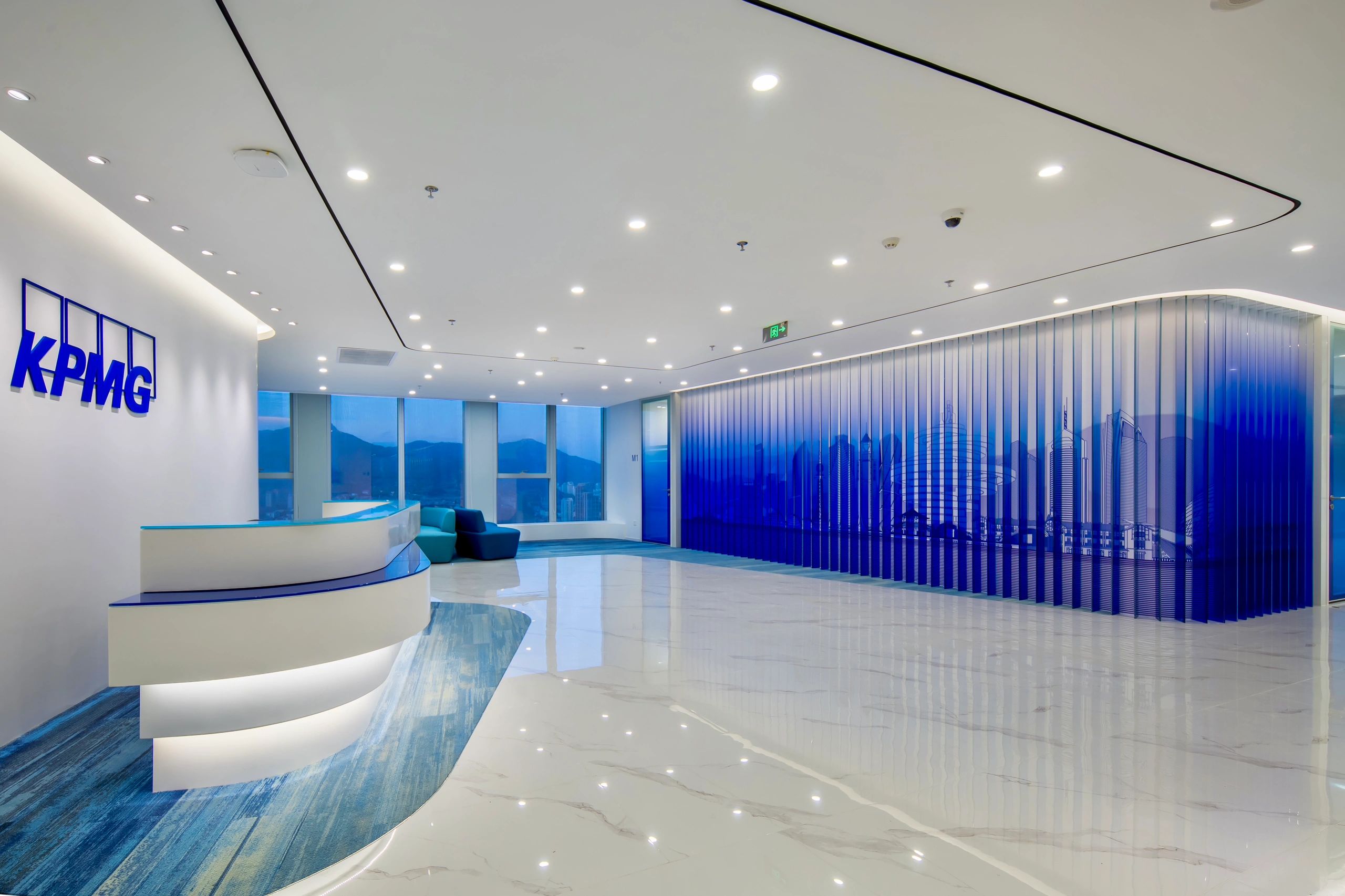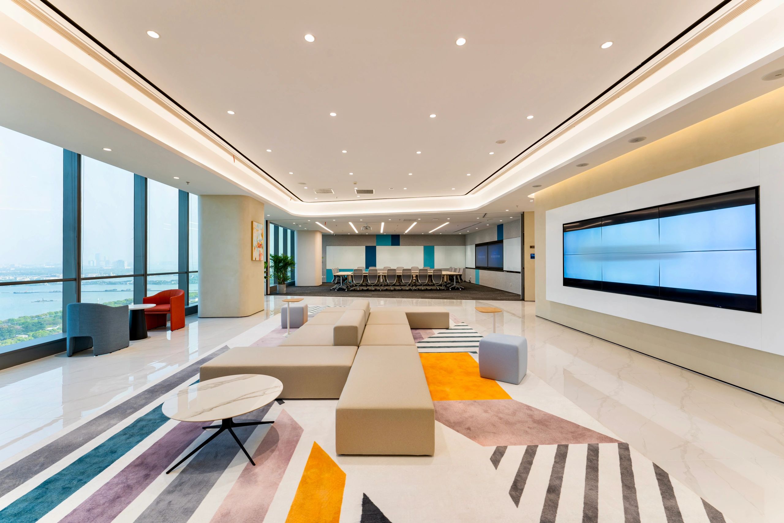 前厅纵深感营造出明亮大气的视觉效果,弧形+直线的设计简约而不简单。彩色地毯将严肃的空间弱化,蓝色与原木色的搭配不仅提升空间的明亮度,更营造了宁静,温暖的工作环境。