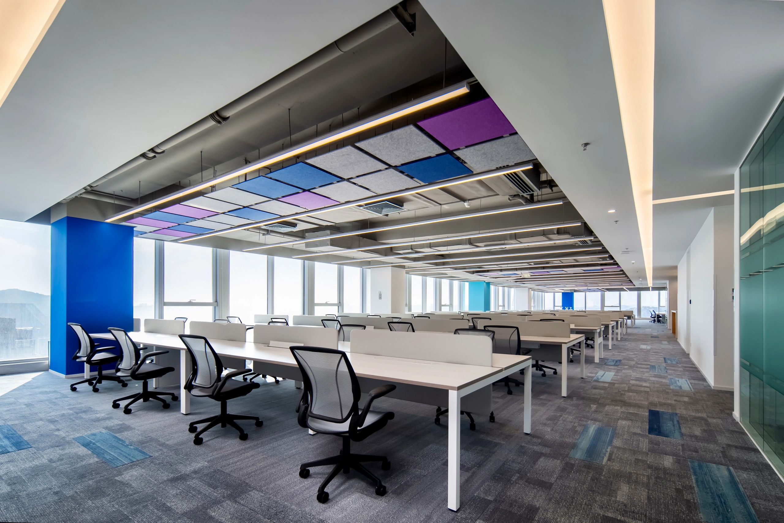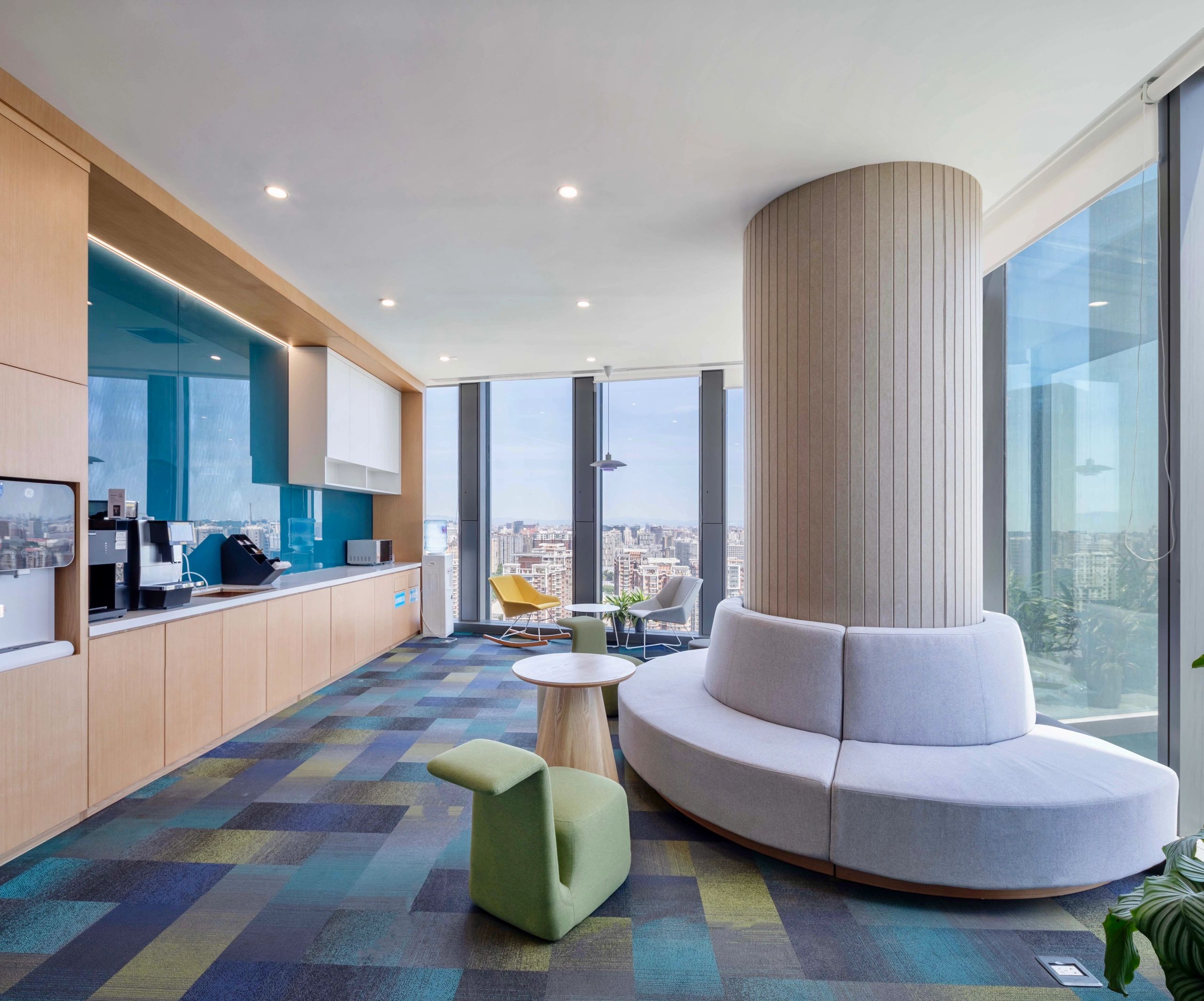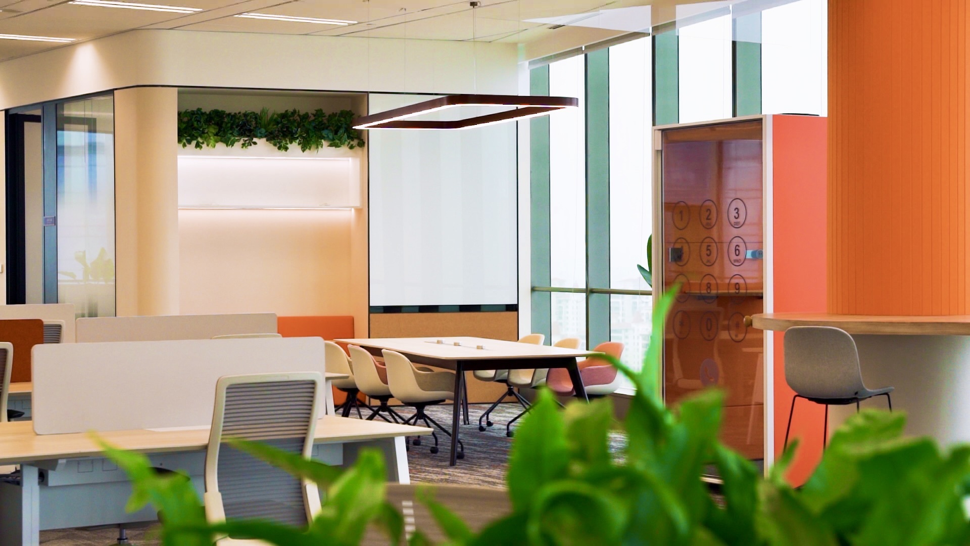 办公空间的充足高度提供了明亮、光线充足的区域,非常适合融入天然植物。墙壁上的活绿色植物、天花板上的植物和花箱、木纹装饰膜等亲自然元素与家具相结合,并根据区域功能不同的材料、纹理、家具和颜色,以鼓励注意力、放松和创造力,让人们在一个空间内享受多重体验。