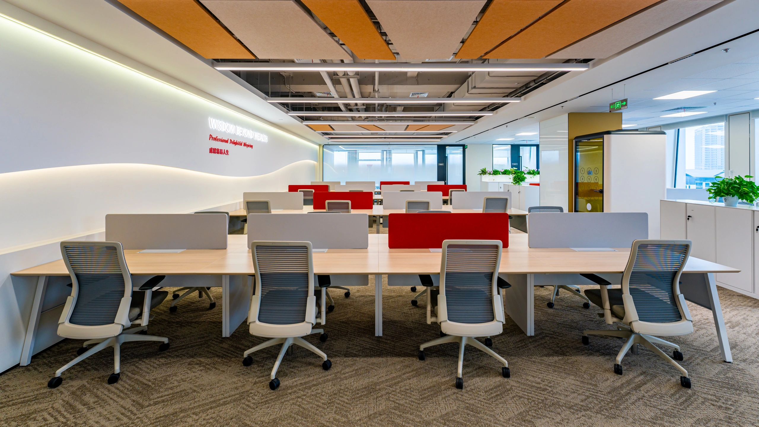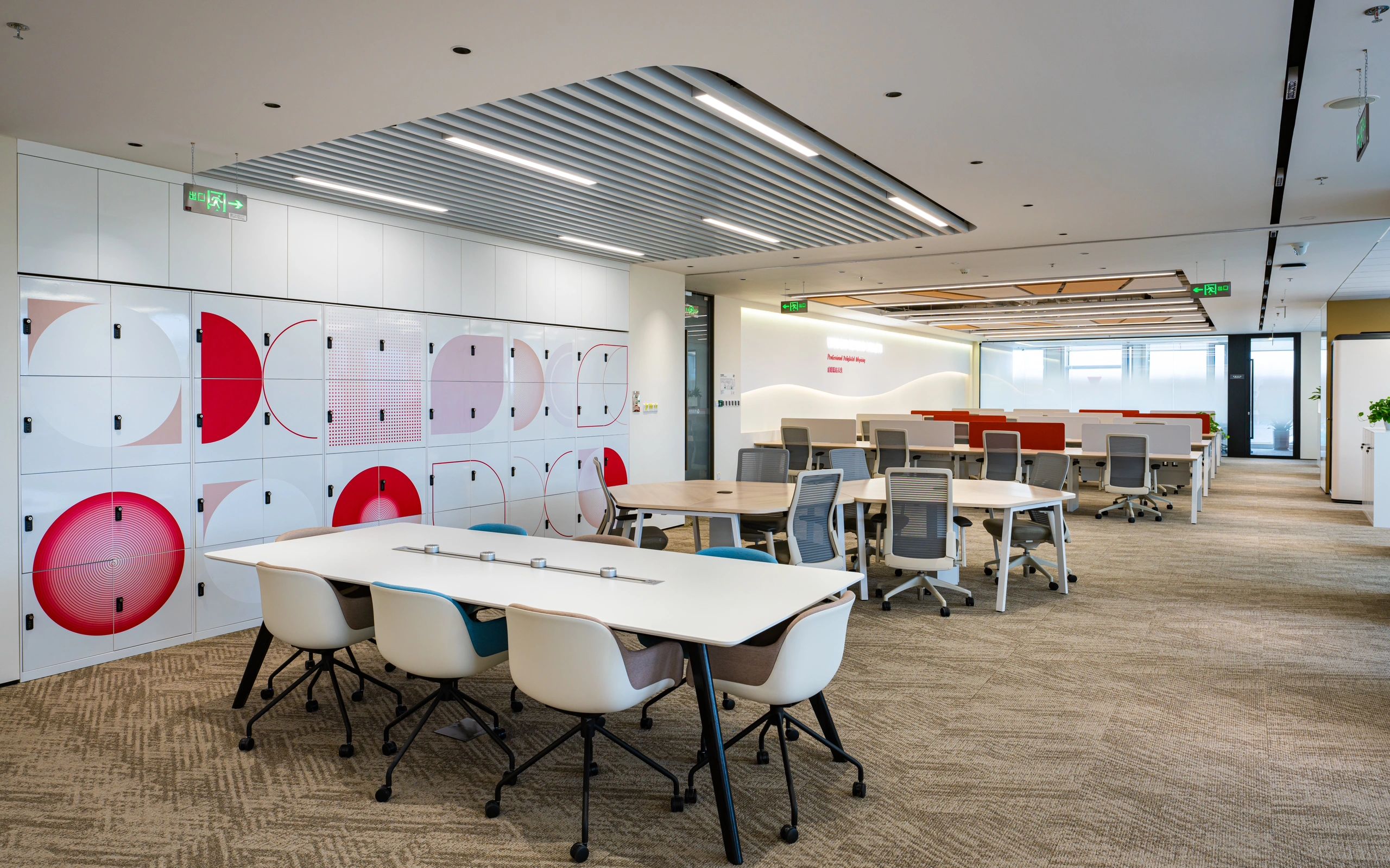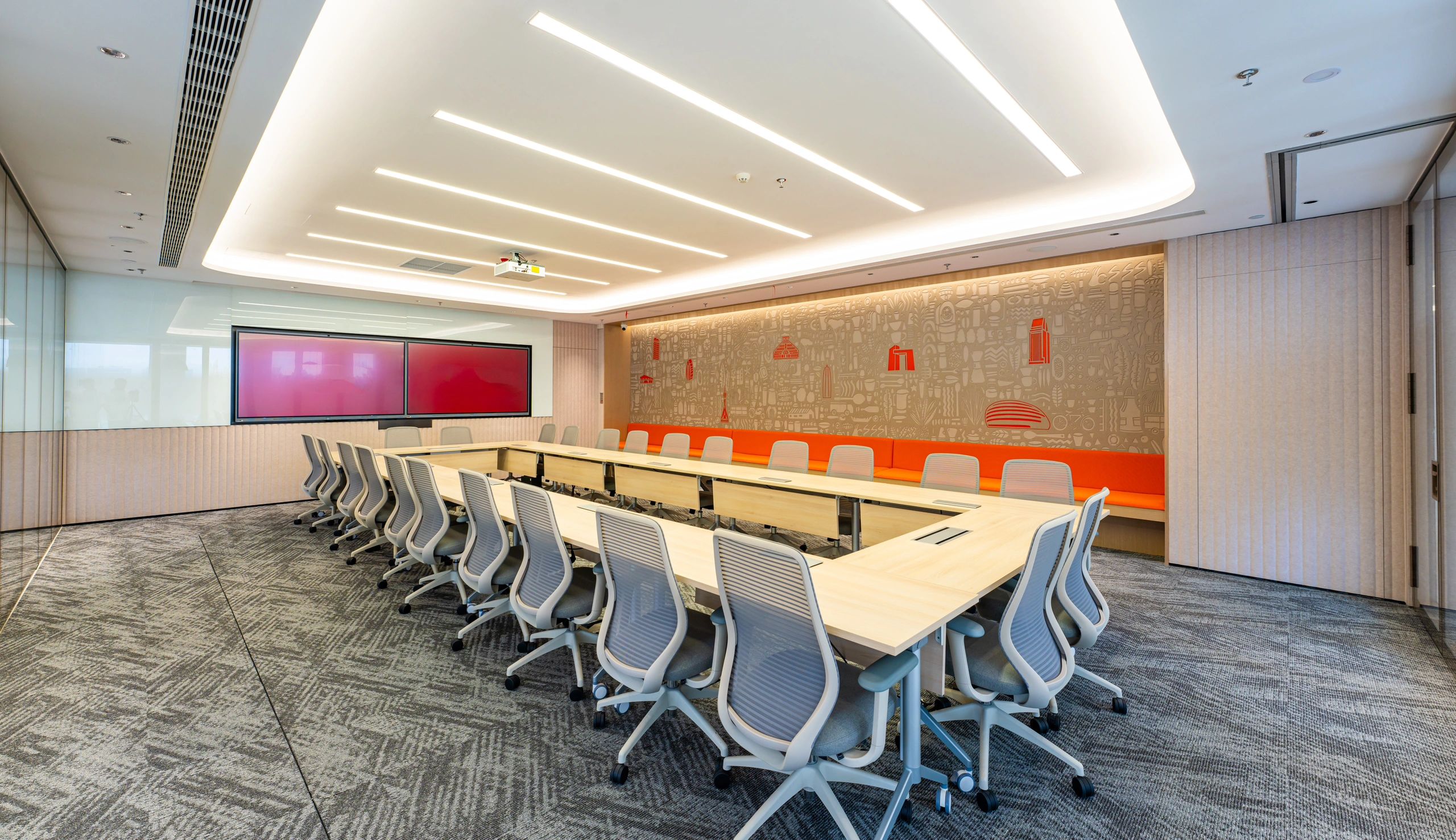 设计上融入具有当地文化特色前台文化墙,历史墙展现企业深厚发展底蕴。不同形式的会议室满足各类需求,裸顶+部分吊顶的设计把降本增效进行到底。