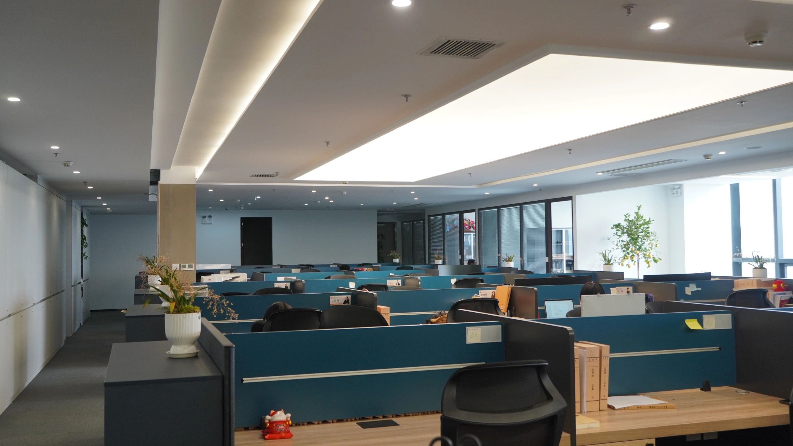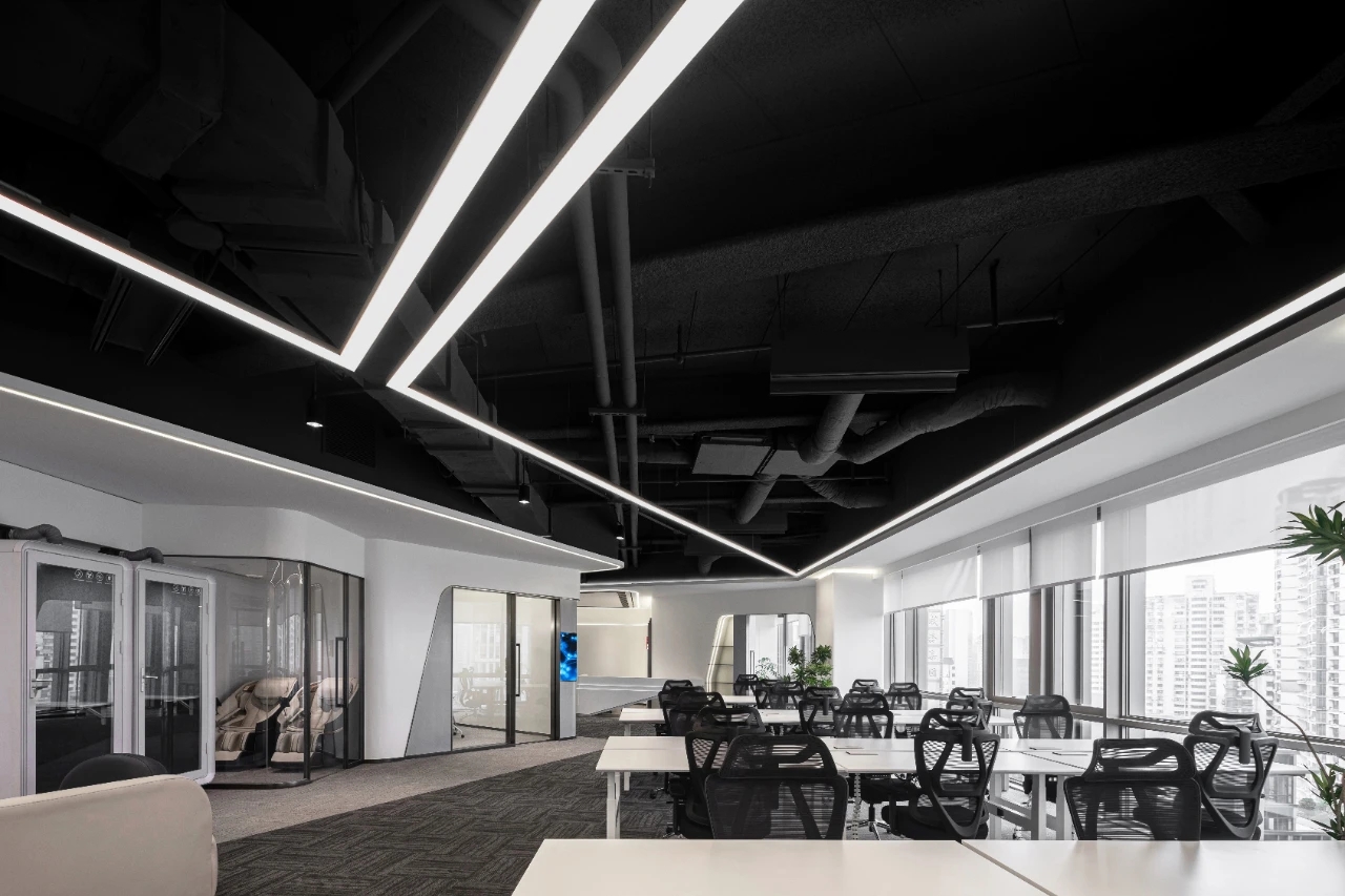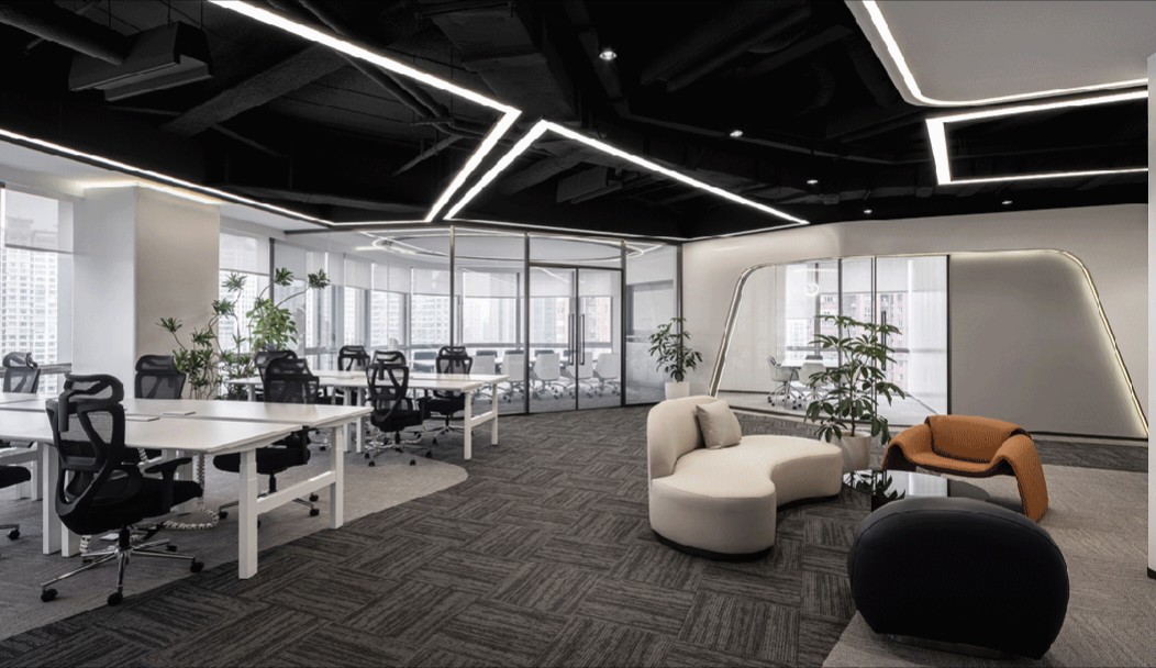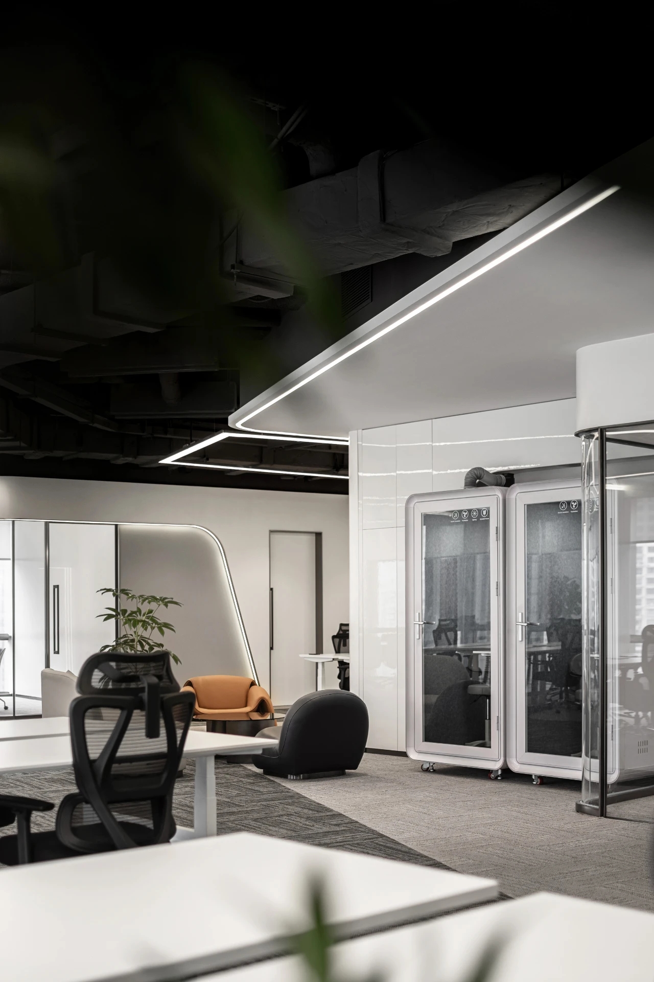 办公空间的氛围设置不止于平面布局,更在于三维整体。灯作为光的发生器,成为秩序的有力表达者。它们如同优雅的线条画家,在工业感十足的天花间勾勒出简洁而富有张力的几何线条。不仅增加了空间的导向性,也提升了办公空间整体的美观度与科技感,更在无形中渲染了秩序感,促进工作效率与创造力激发。工作区采用高级灰与白色为主色调,白色桌柜、墙面与灰色地毯,让空间更加自然放松。简约自由的布局更考验材料的取舍。地面颜色的深浅则作为不同区域的象征界限,分而不隔,开阔通透。