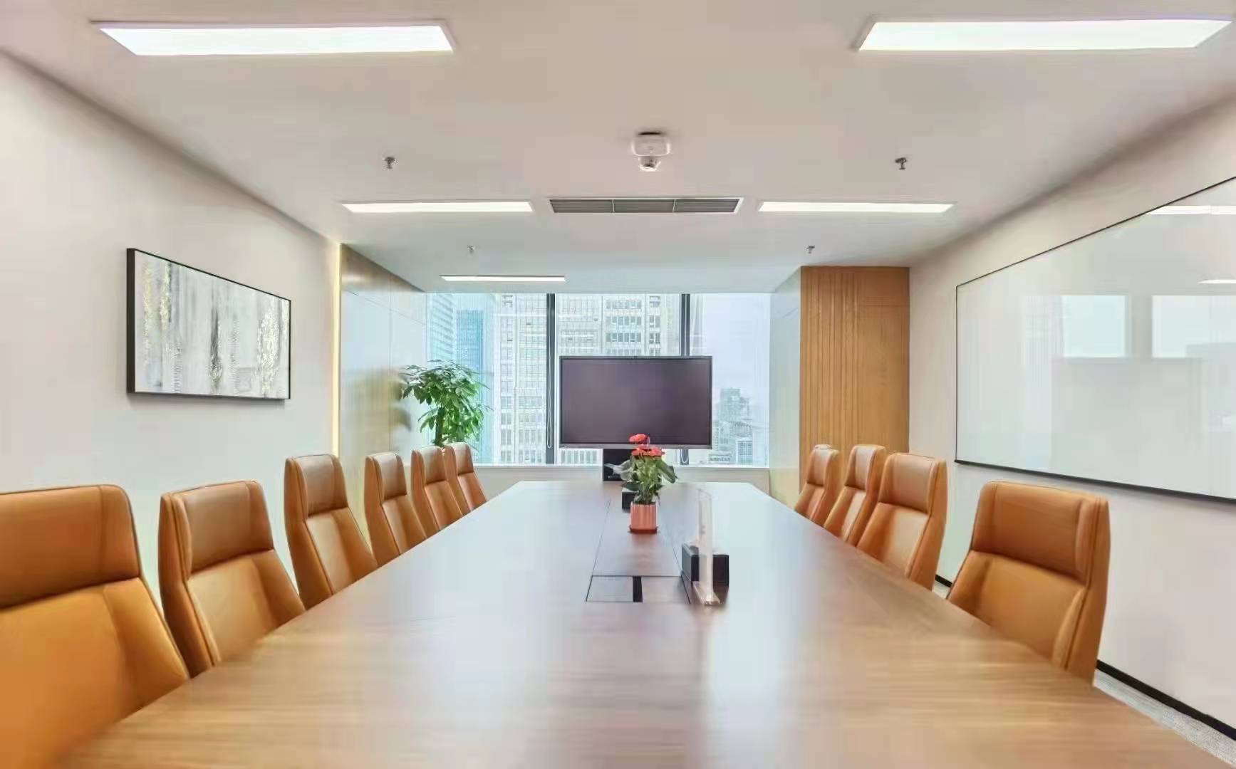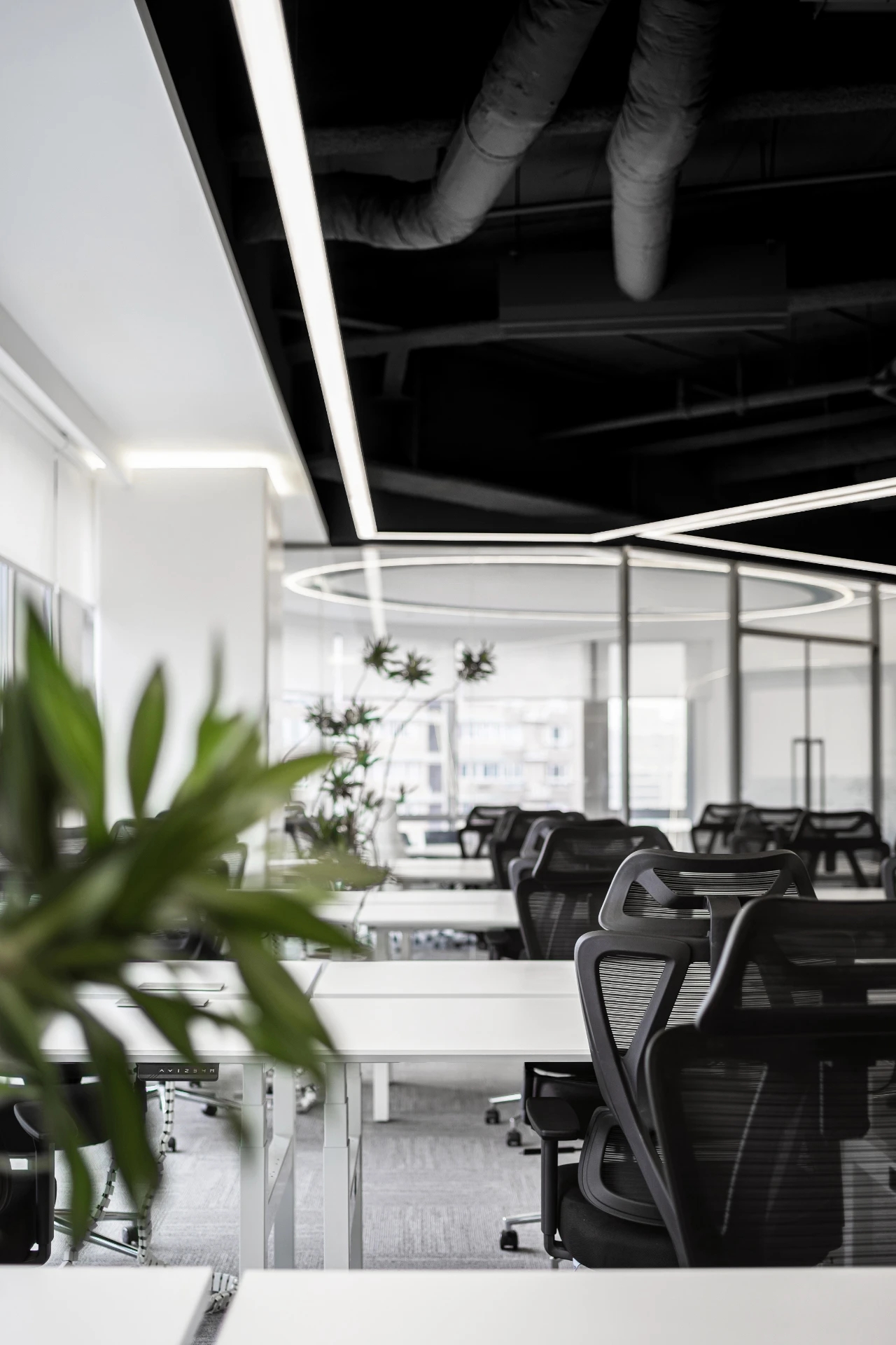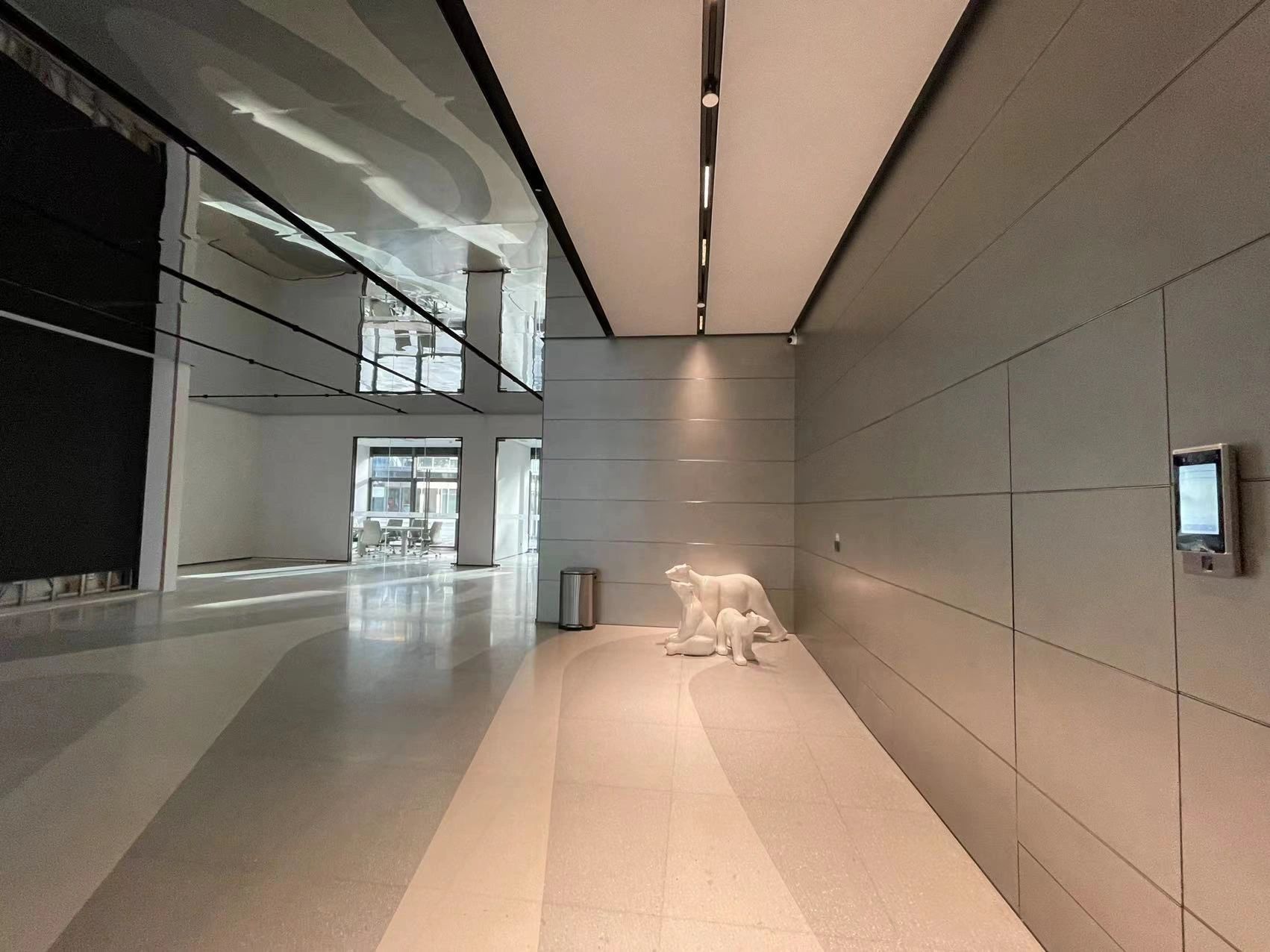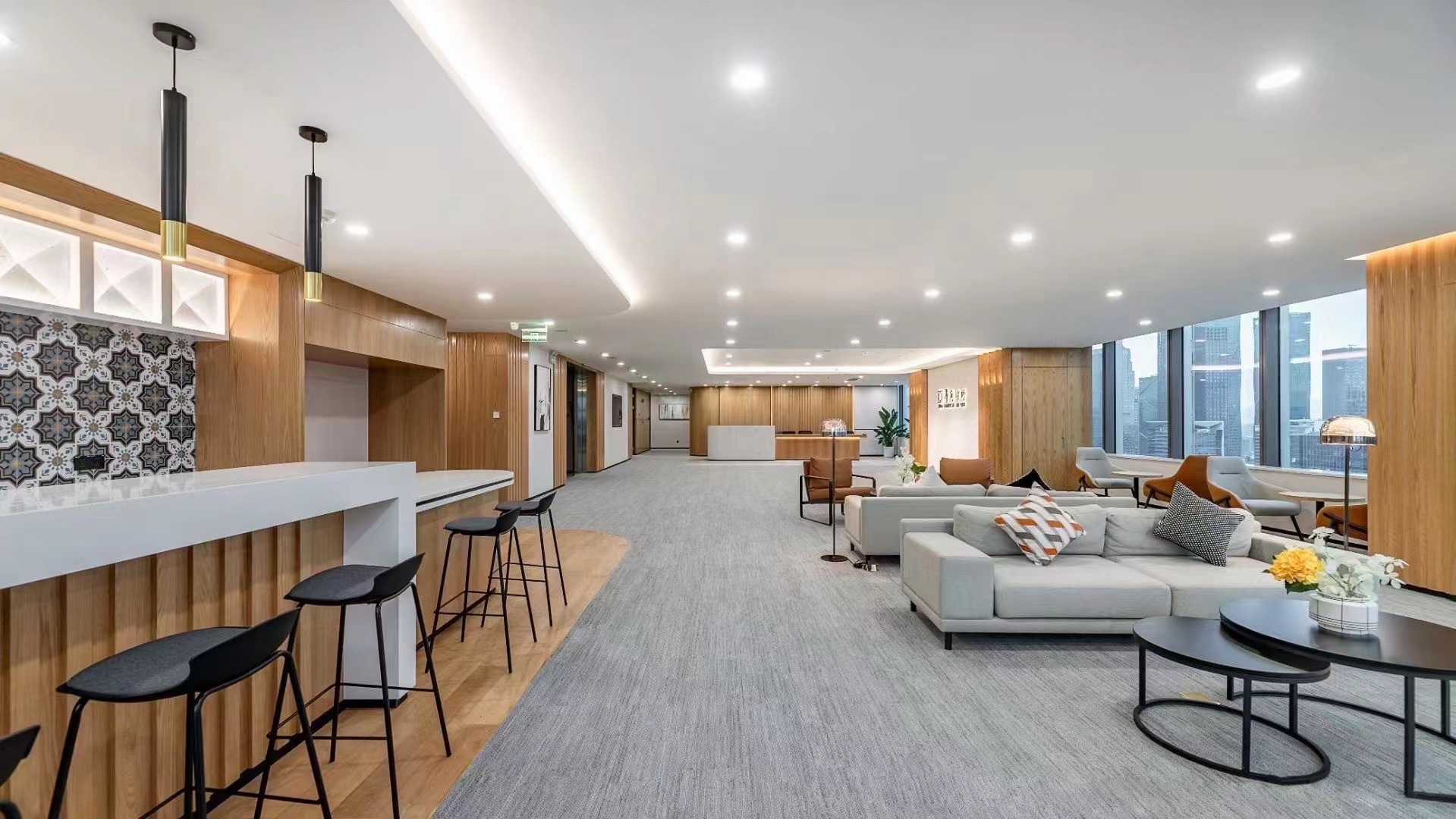 办公空间的氛围设置不止于平面布局,更在于三维整体。灯作为光的发生器,成为秩序的有力表达者。它们如同优雅的线条画家,在工业感十足的天花间勾勒出简洁而富有张力的几何线条。不仅增加了空间的导向性,也提升了办公空间整体的美观度与科技感,更在无形中渲染了秩序感,促进工作效率与创造力激发。工作区采用高级灰与白色为主色调,白色桌柜、墙面与灰色地毯,让空间更加自然放松。简约自由的布局更考验材料的取舍。地面颜色的深浅则作为不同区域的象征界限,分而不隔,开阔通透。