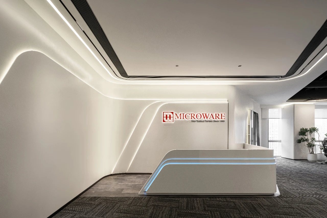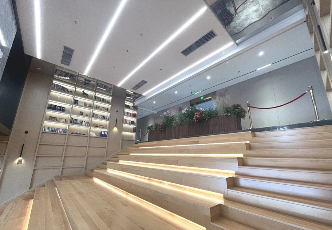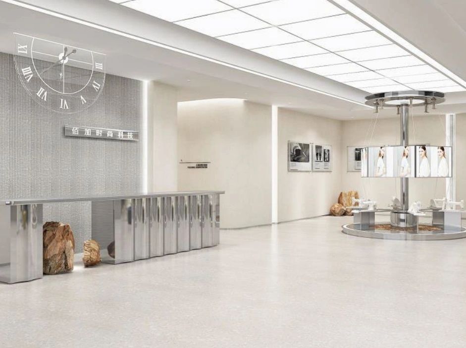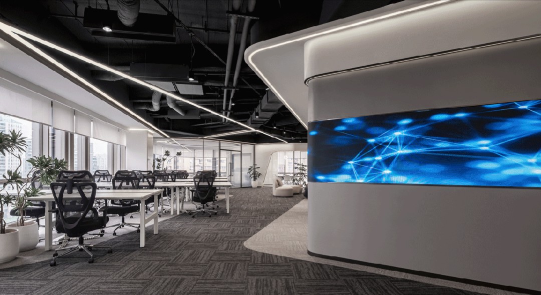 前台区域的设计流畅而富有动感,与周围围合界面形成和谐对话,强化了空间的社交属性。纯白的总基调简约不失质感,细节之处利用线条利落衔接,共同诠释了知性简约与质感并存的基础手法。步入其间,电子大屏与空间的线条铺开氛围语言,营造出独特的科技美学。为了更充分表达,材料上运用丝光漆、金属及不锈钢,形成视觉冲击。顶部的设计直接裸露水泥及管道结构,给空间增添了工业气息。灯光随着轨道形成充满秩序感的线条,让人感受到企业的节奏、时尚气息和高效文化。
