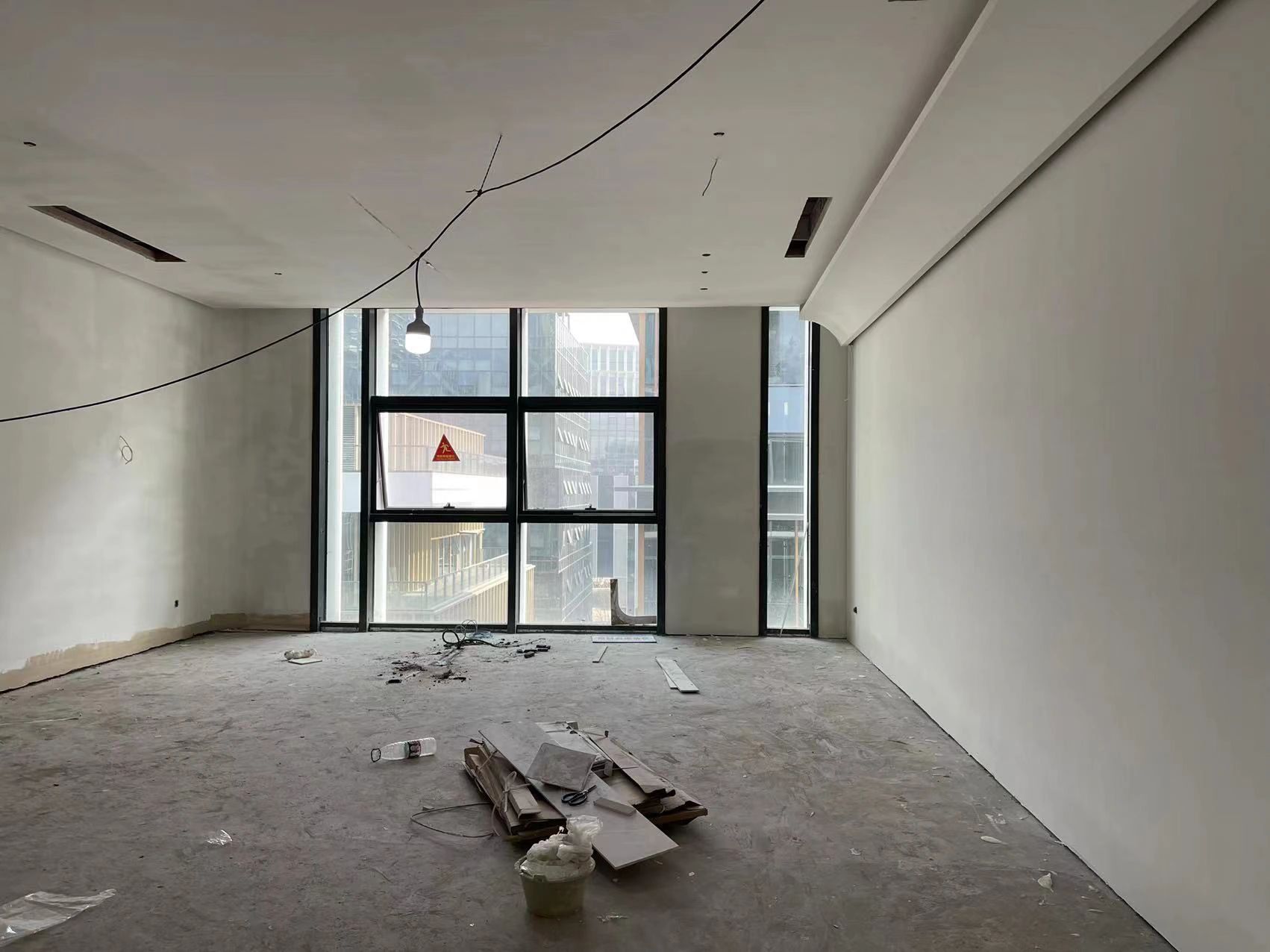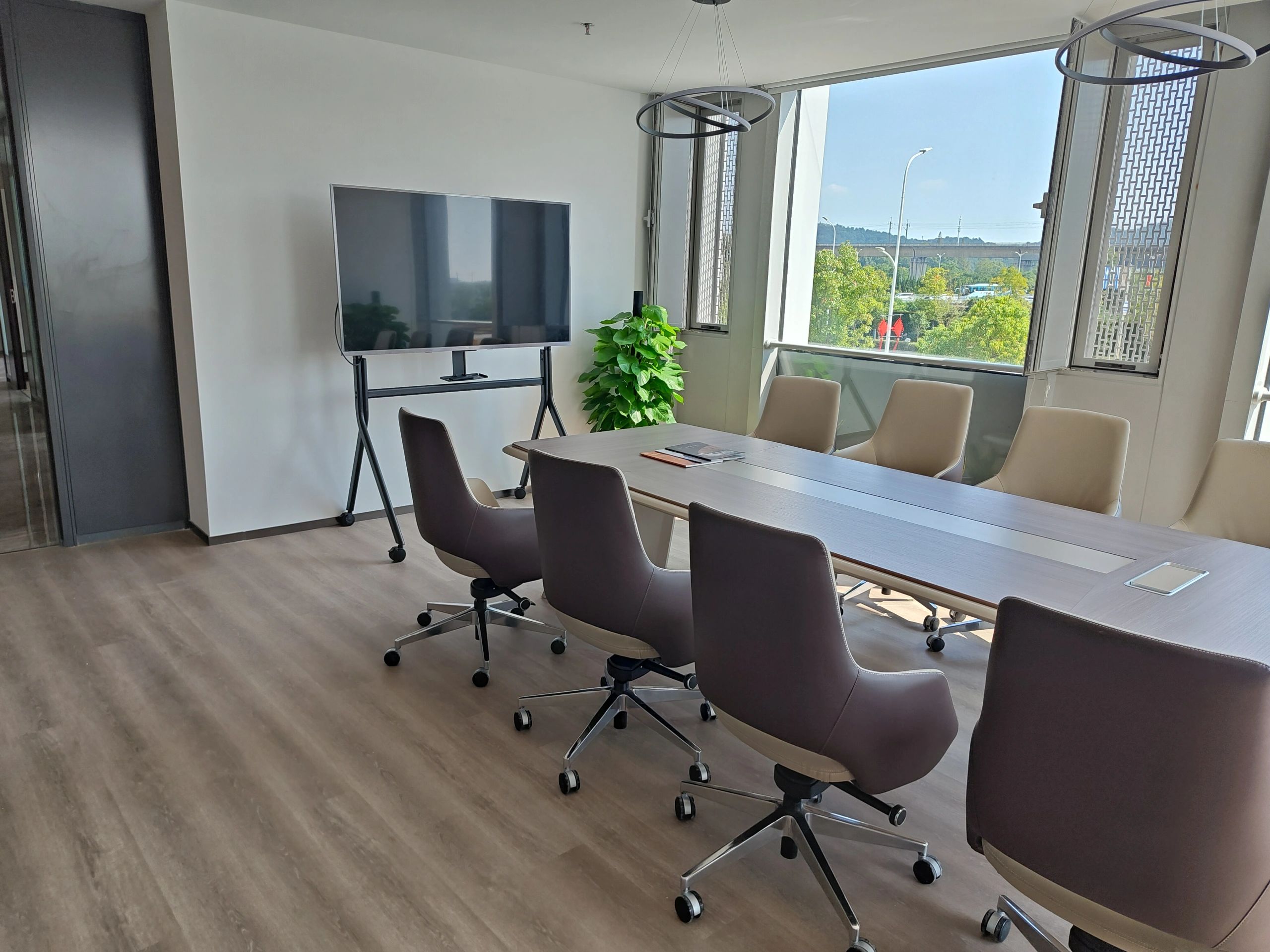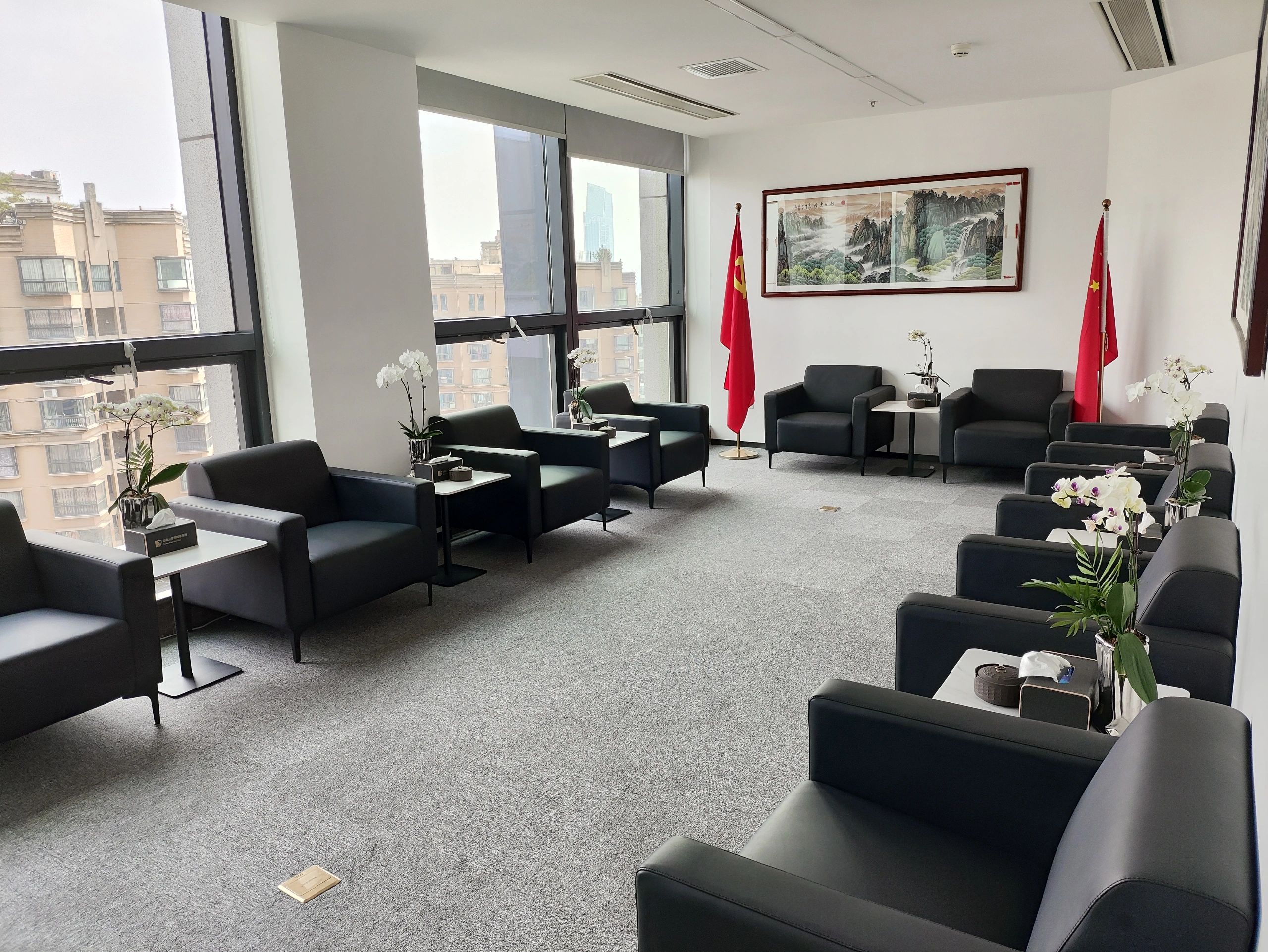 工作区采用高级灰与白色为主色调,白色桌柜、墙面与灰色地毯,让空间更加自然放松。简约自由的布局更考验材料的取舍。地面颜色的深浅则作为不同区域的象征界限,分而不隔,开阔通透。