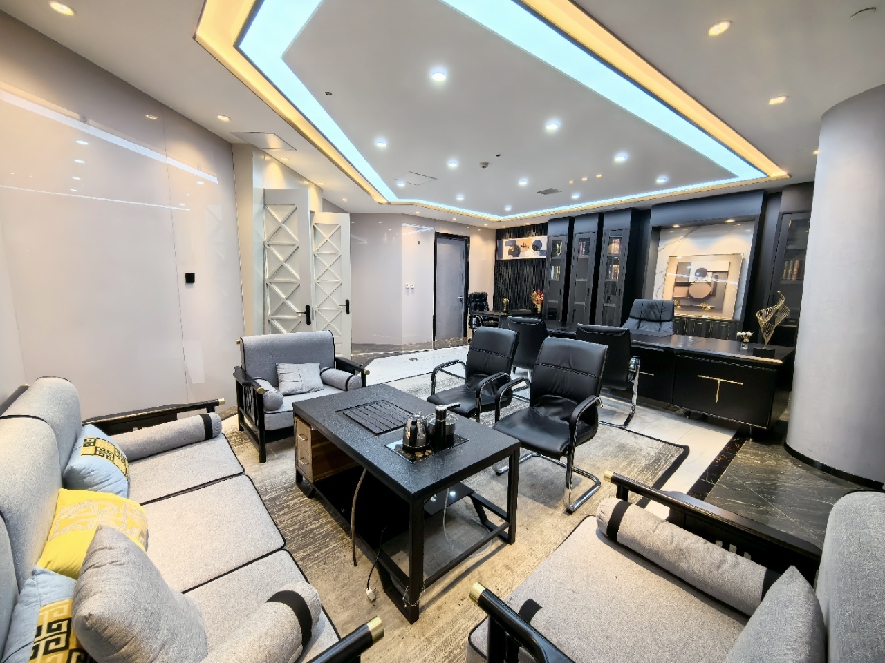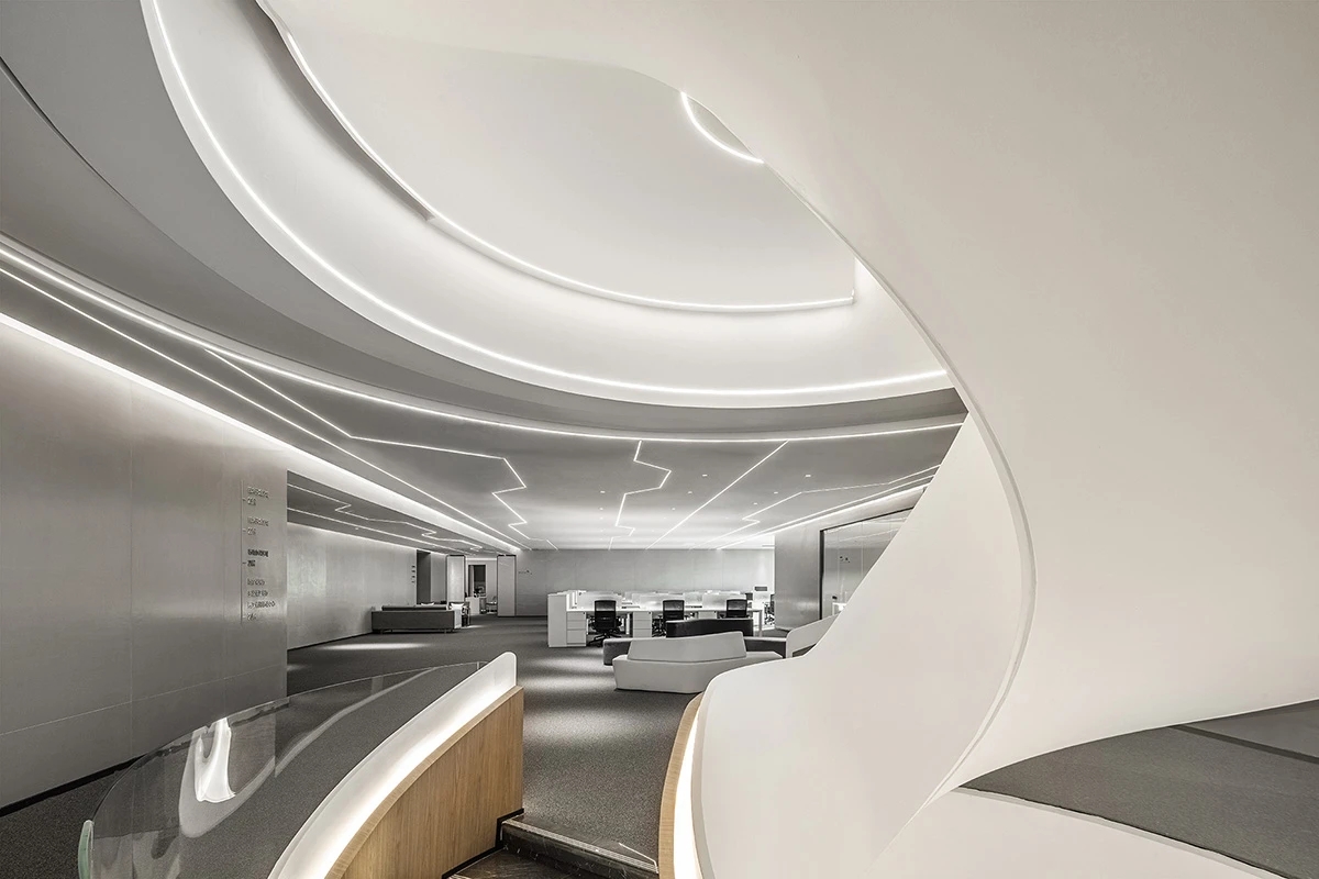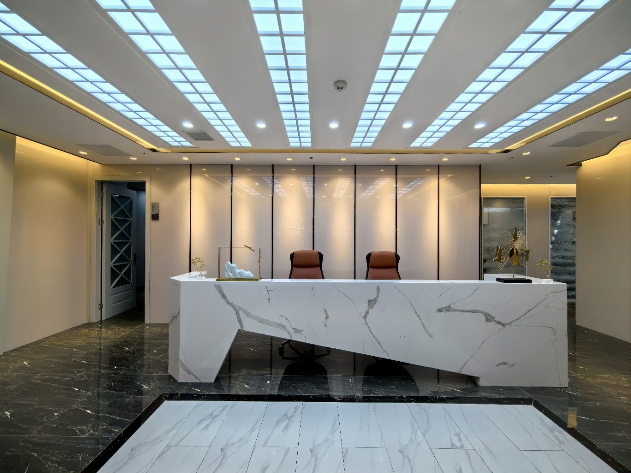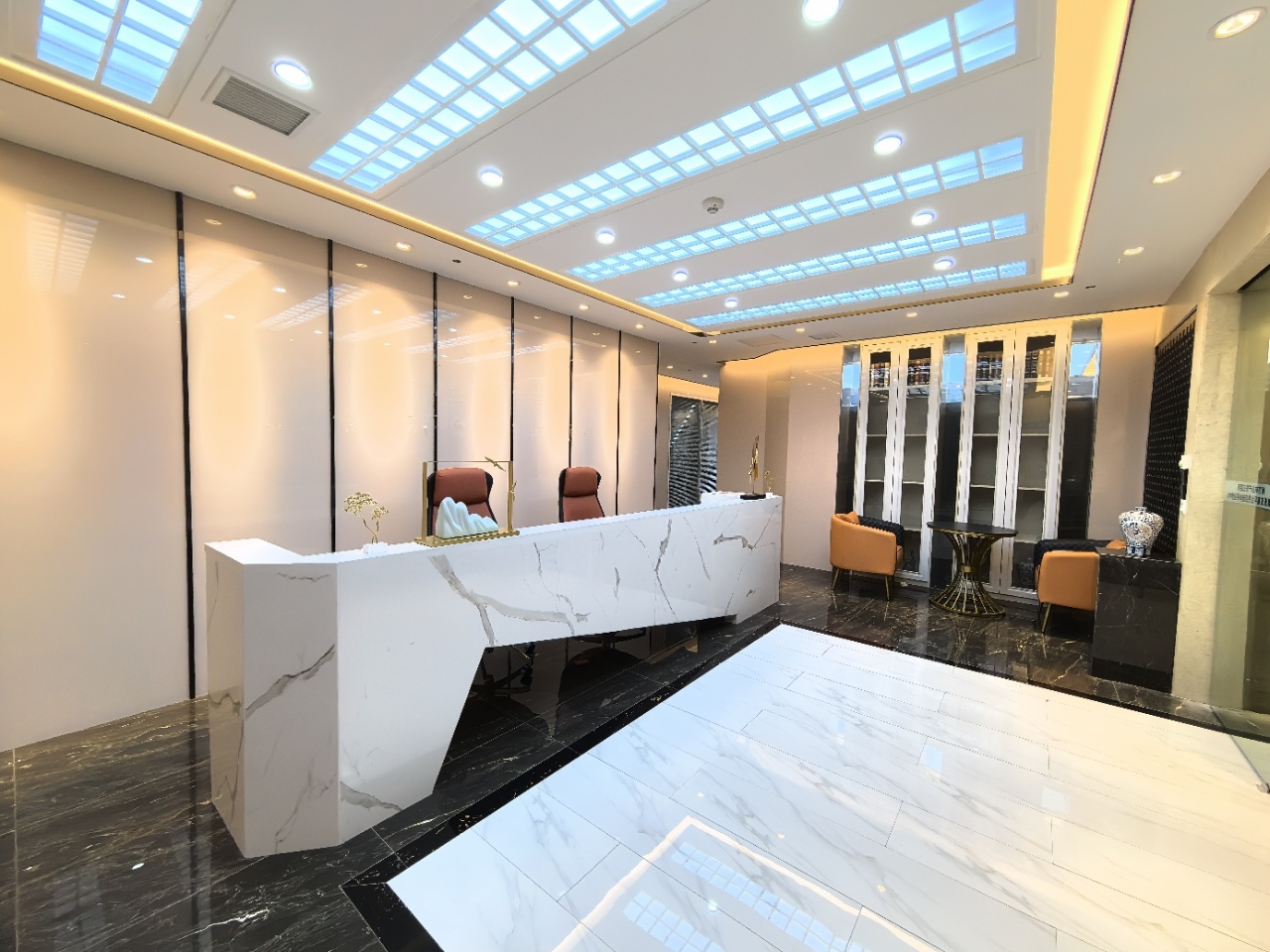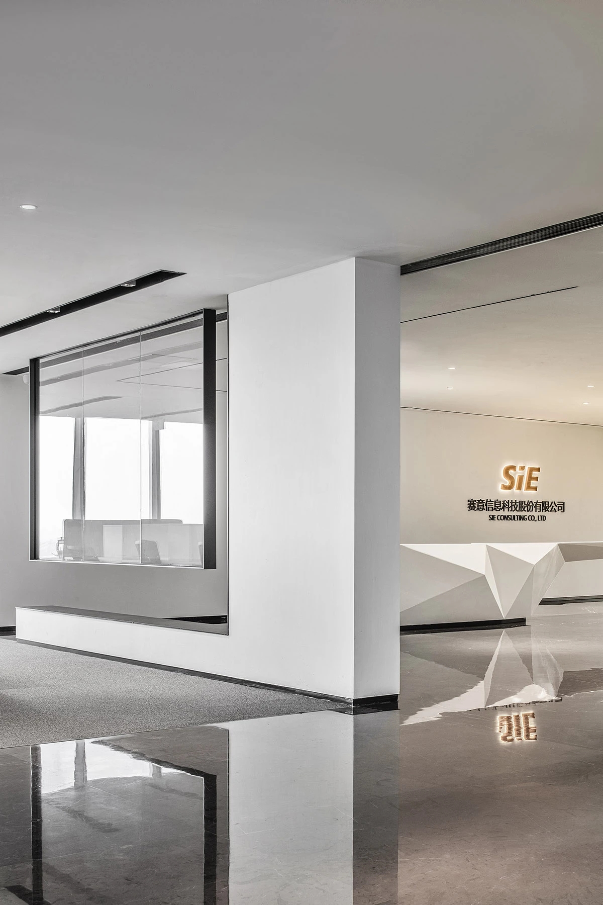 前厅接待区的整体空间纯净而简练,黑白色调反而更凸显超现实氛围,仿佛置身于科技对话未来的场景。几何构成感的前台极具视觉张力,与纯白的背景墙碰撞出别样的空间趣味感。