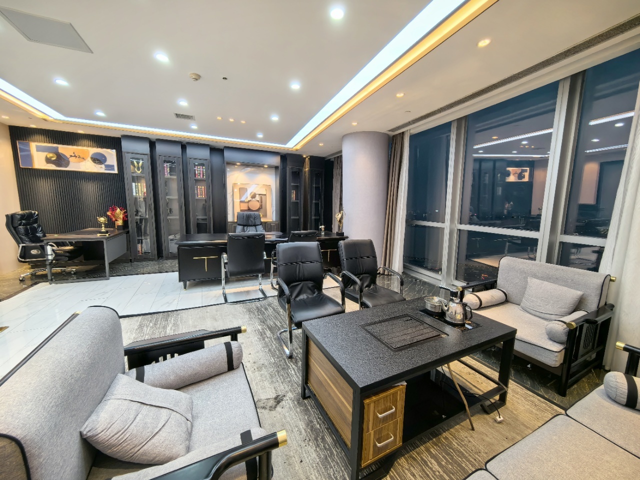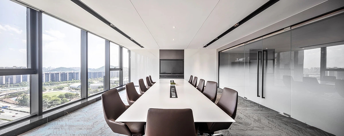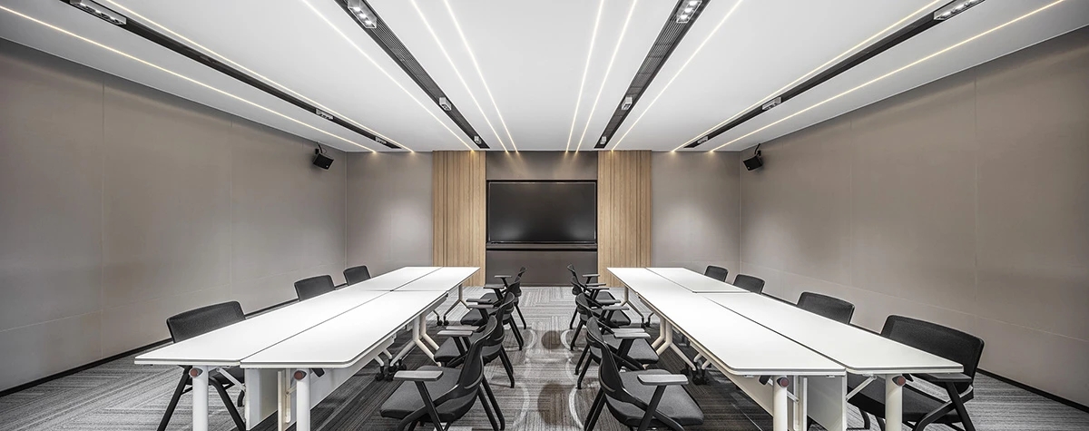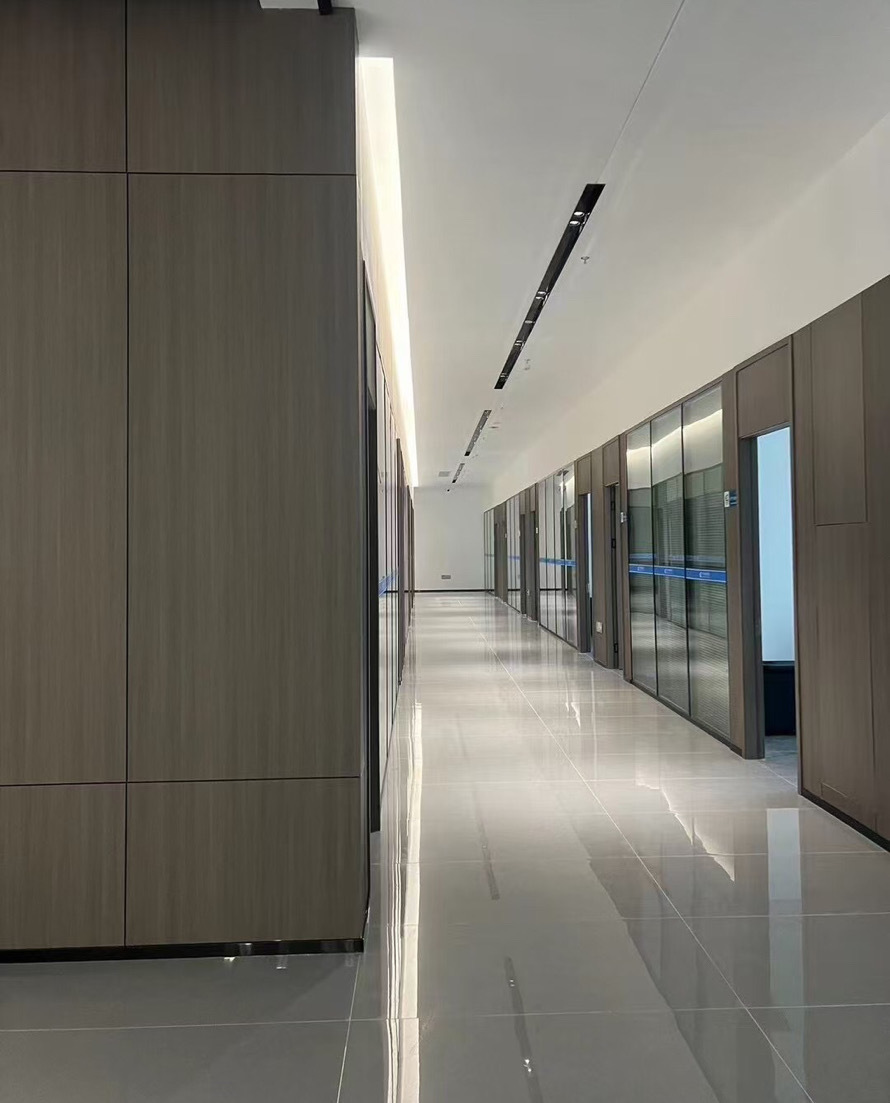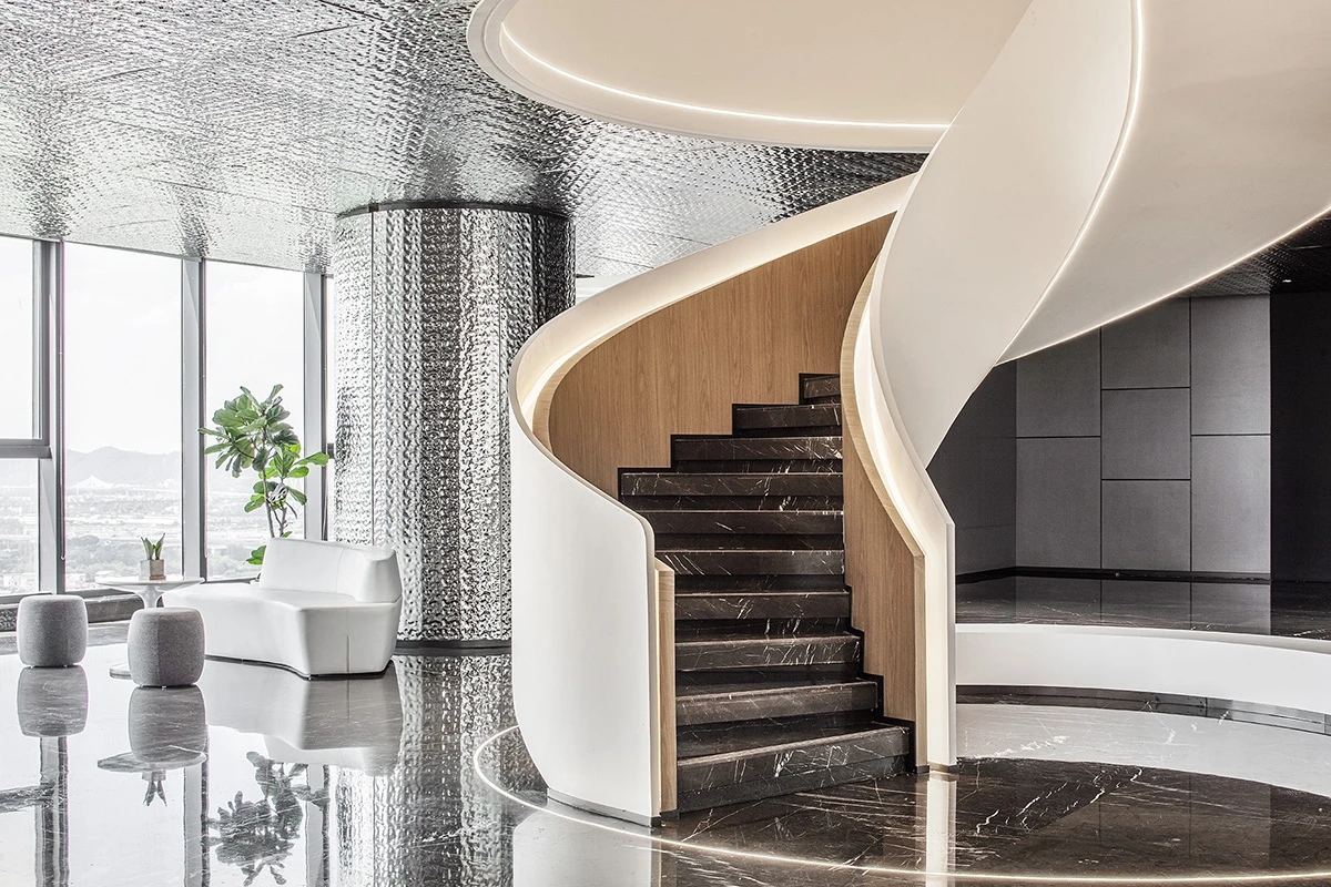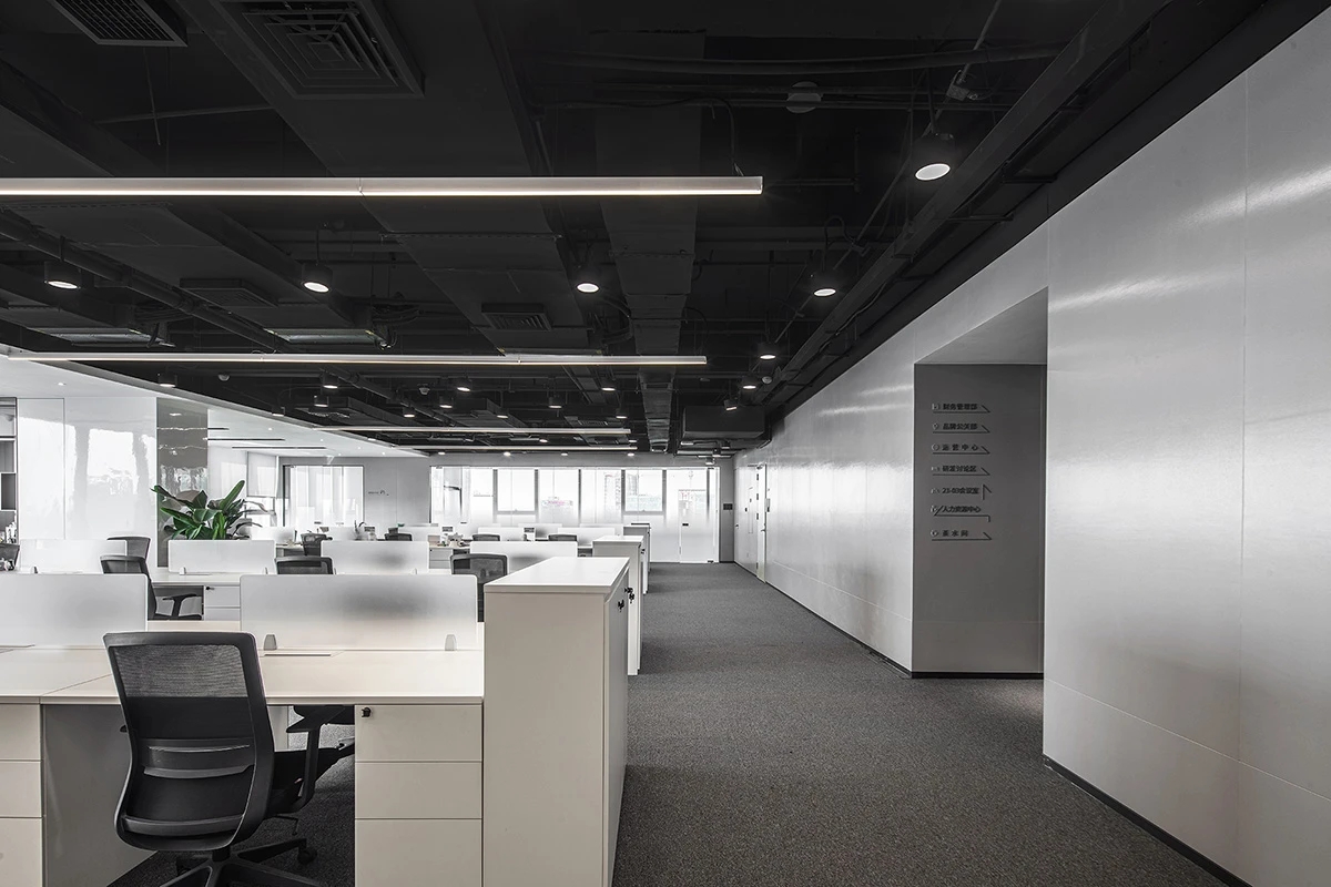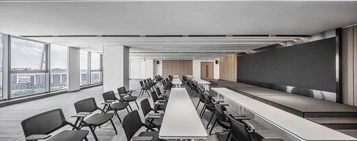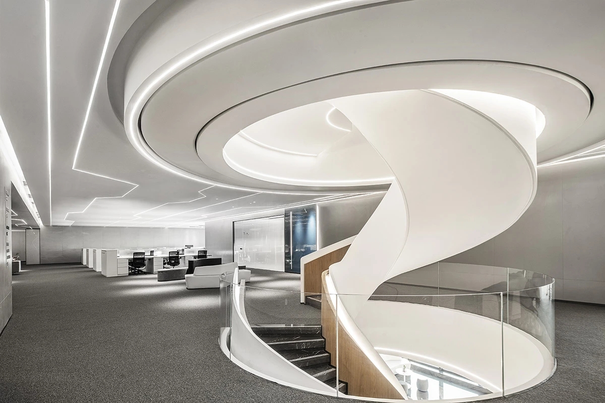 前厅接待区的整体空间纯净而简练,黑白色调反而更凸显超现实氛围,仿佛置身于科技对话未来的场景。几何构成感的前台极具视觉张力,与纯白的背景墙碰撞出别样的空间趣味感。
