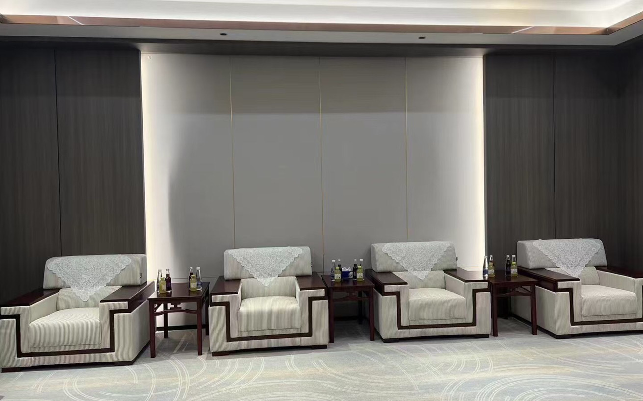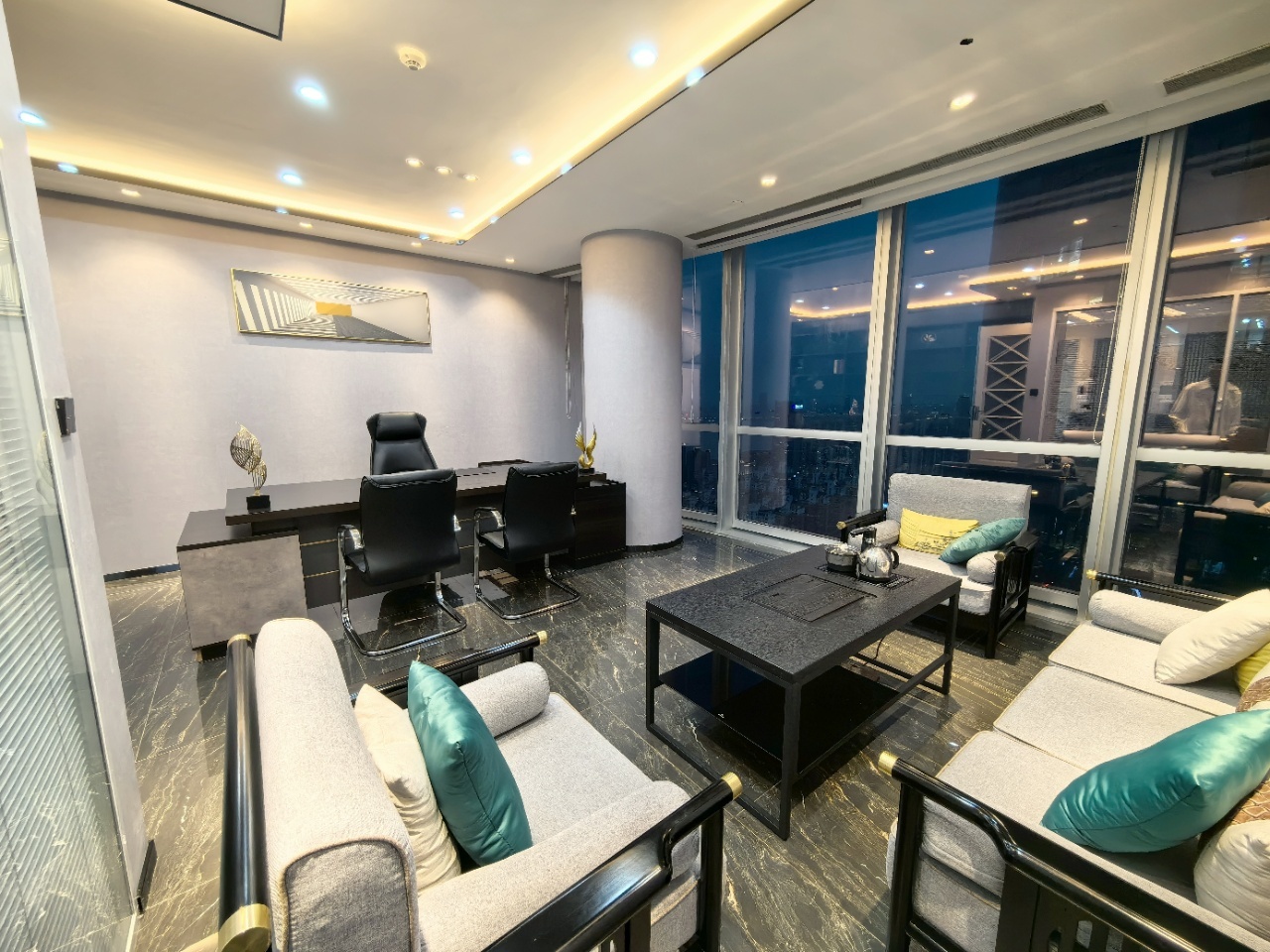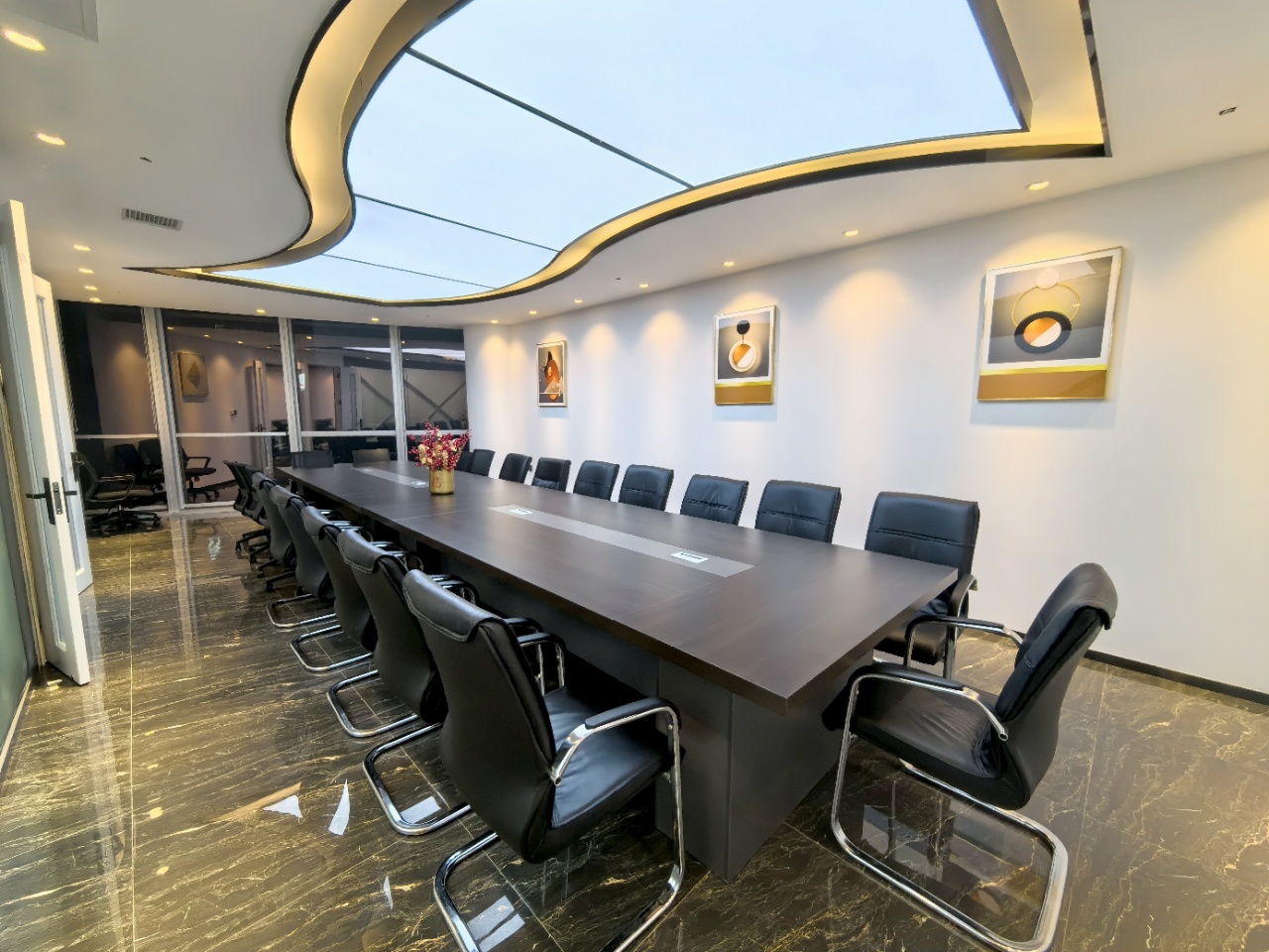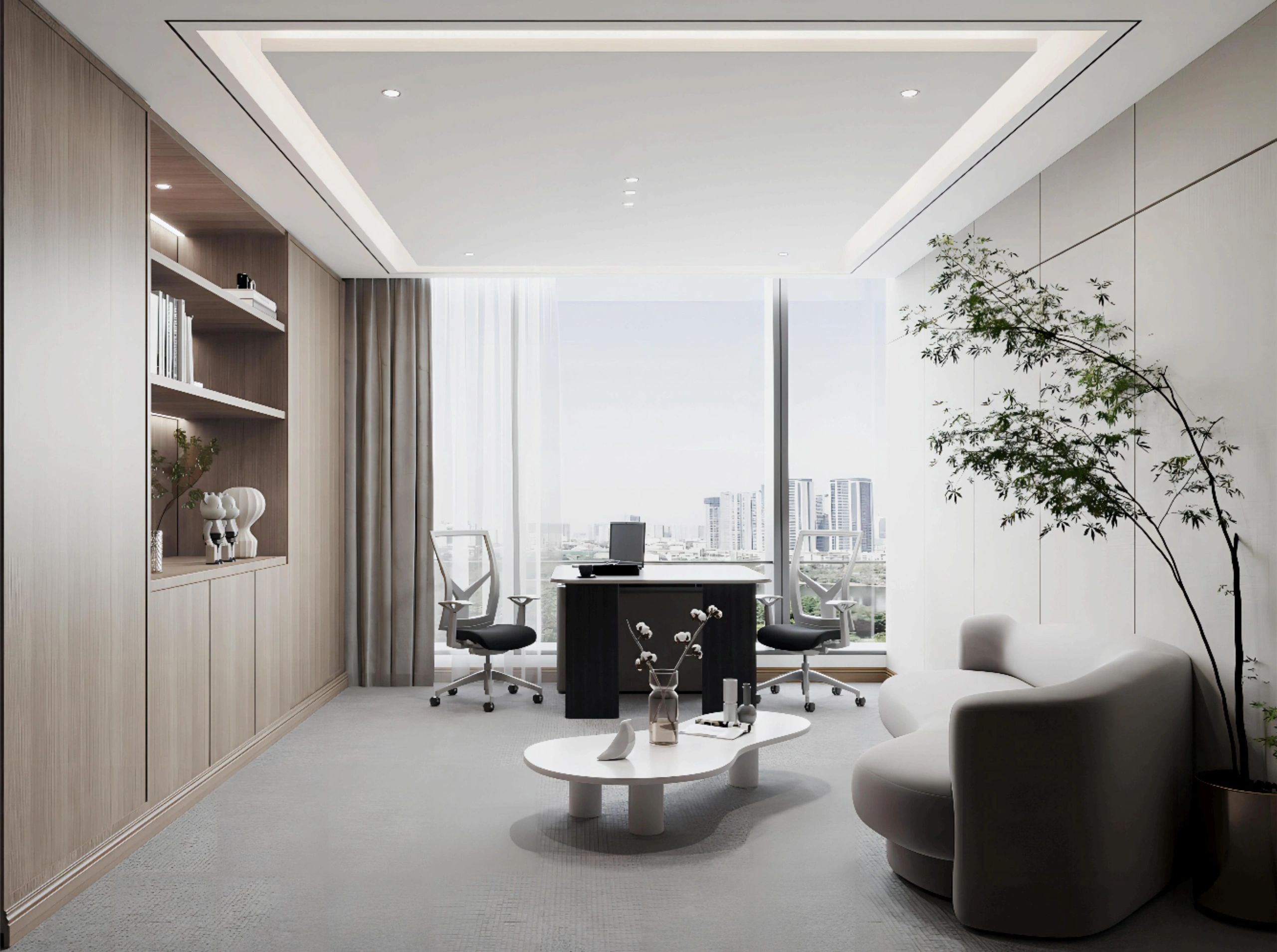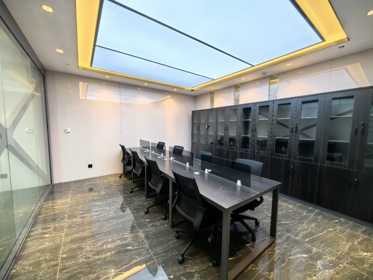 前厅接待区的整体空间纯净而简练,黑白色调反而更凸显超现实氛围,仿佛置身于科技对话未来的场景。几何构成感的前台极具视觉张力,与纯白的背景墙碰撞出别样的空间趣味感。