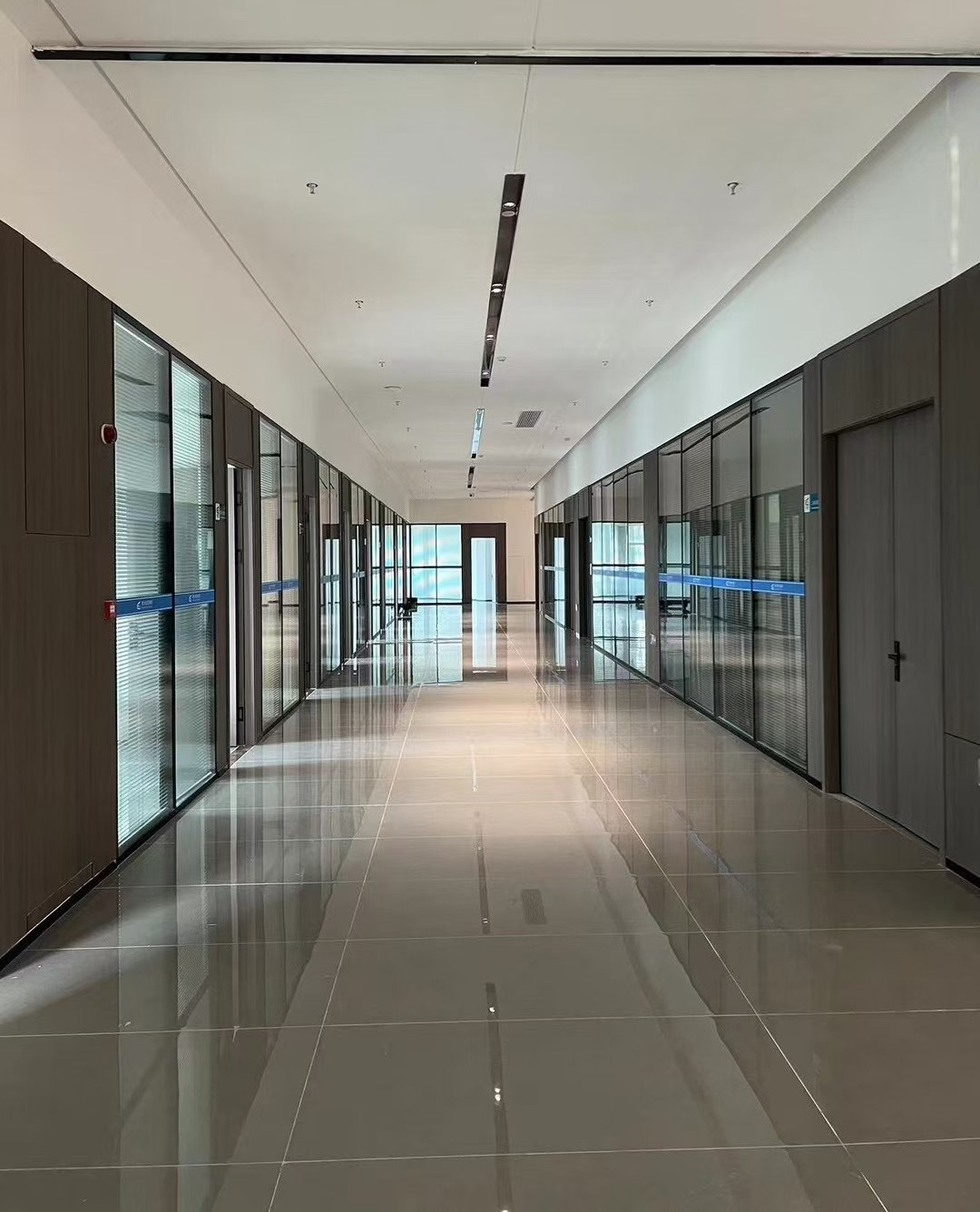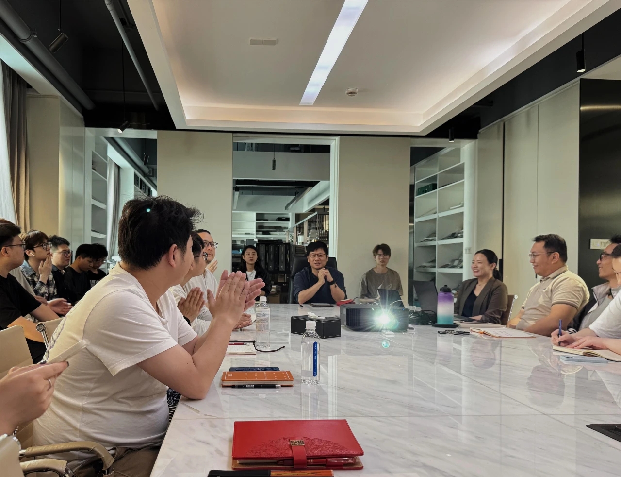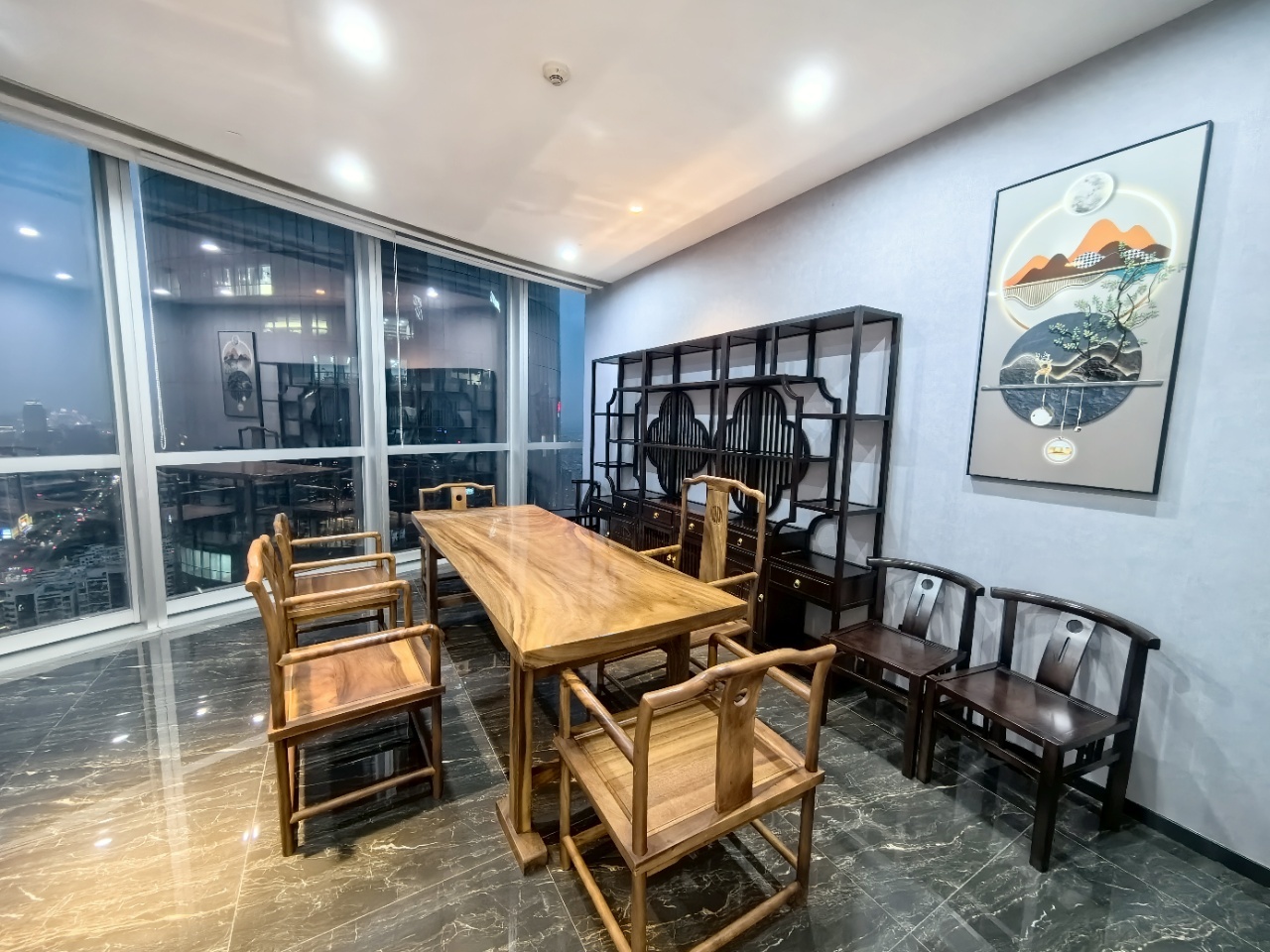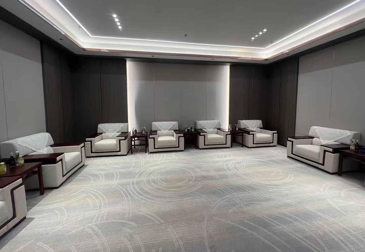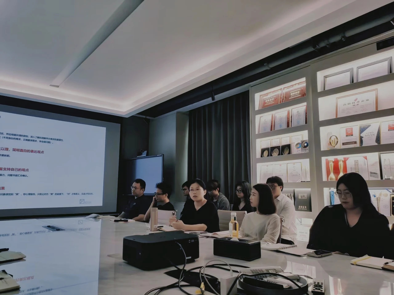 前厅接待区的整体空间纯净而简练,黑白色调反而更凸显超现实氛围,仿佛置身于科技对话未来的场景。几何构成感的前台极具视觉张力,与纯白的背景墙碰撞出别样的空间趣味感。