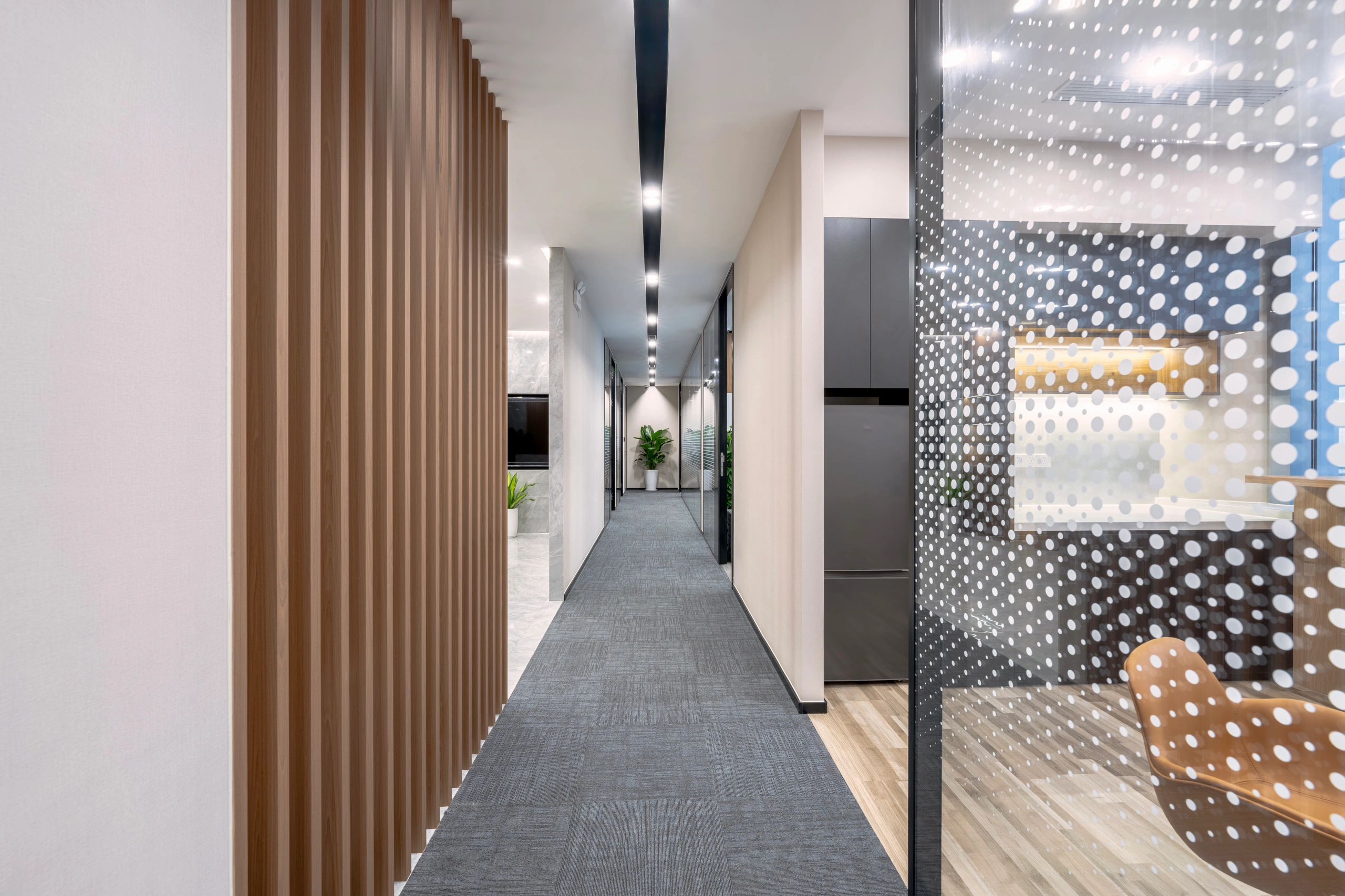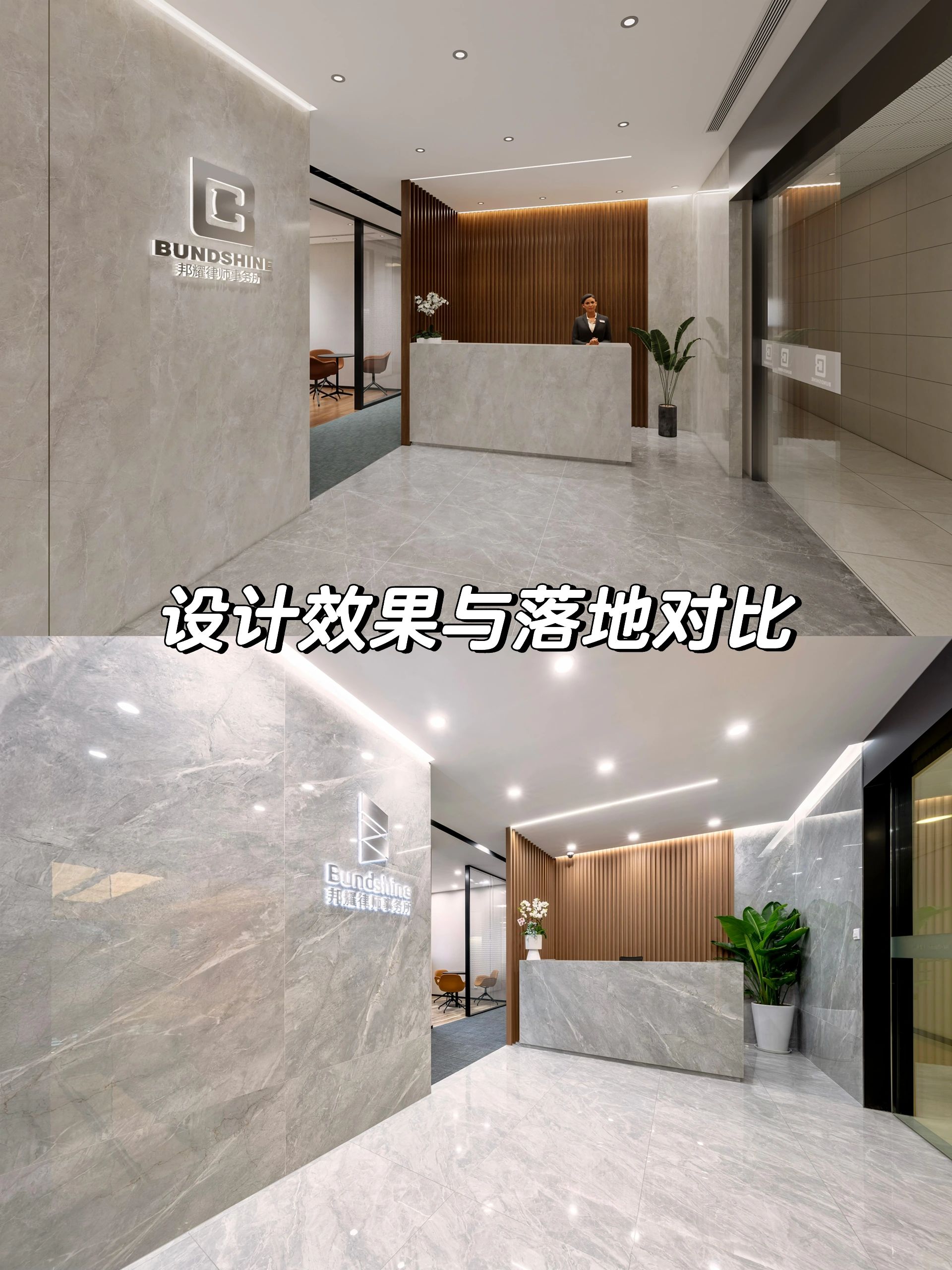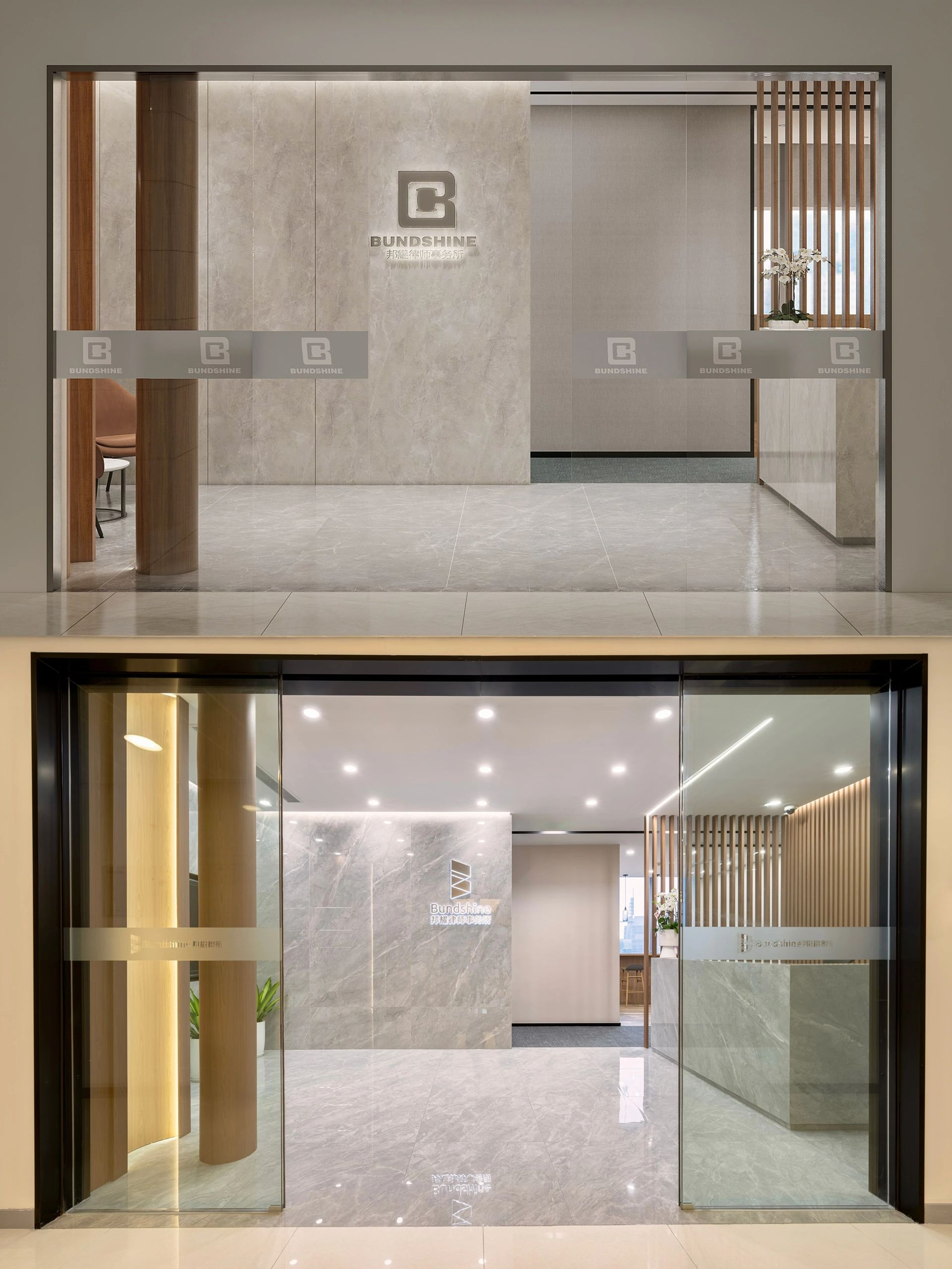 前厅设计为保证一定通透性,对使用区域和接待区域的区分。我们采用一半实体LOGO墙,和一半虚体格栅墙。虚实结合,保留了一半的内部私密性,同时也保留了采光通透性和动线引导性。