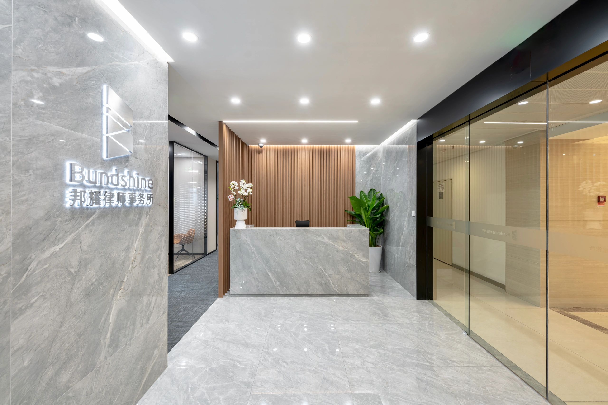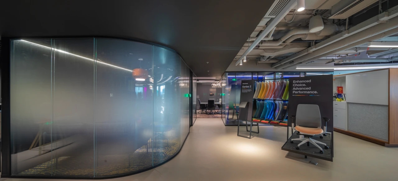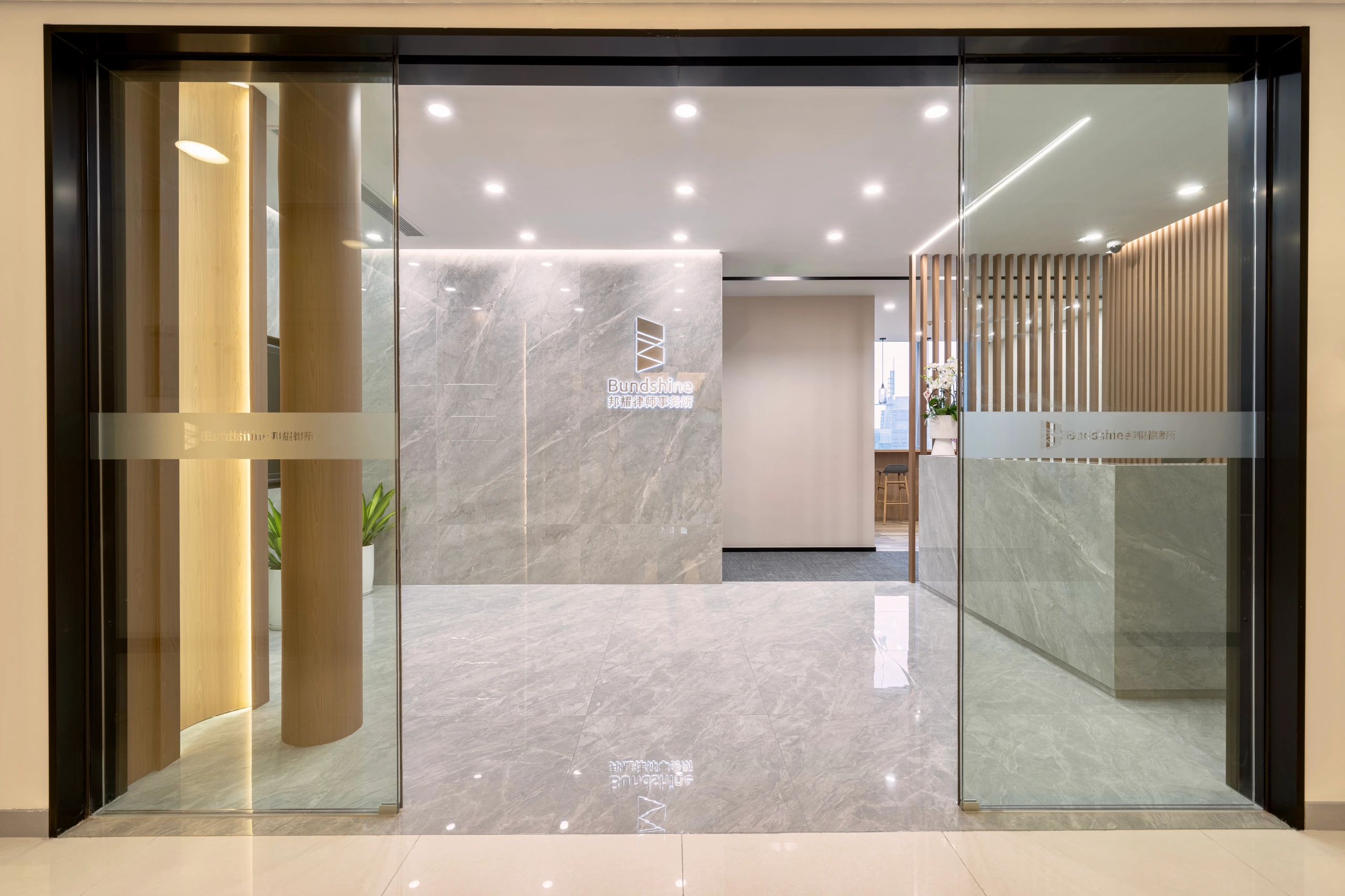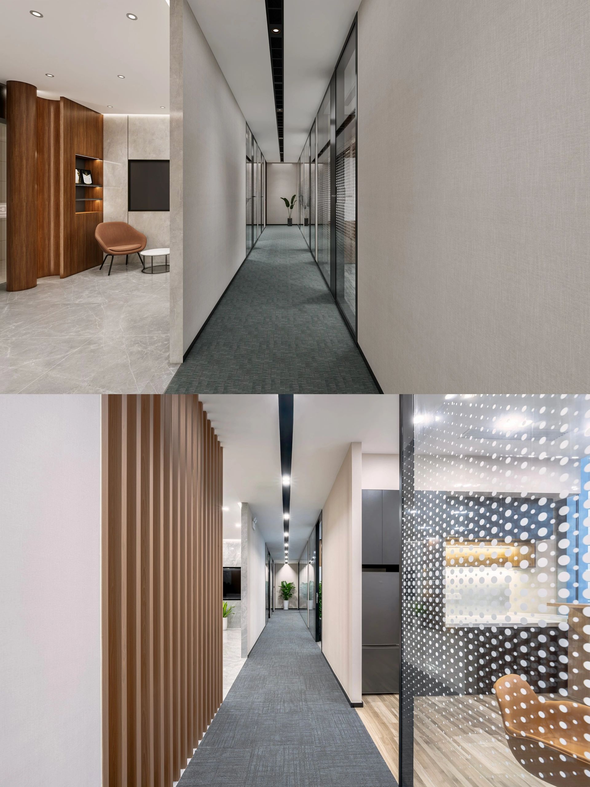 前厅设计为保证一定通透性,对使用区域和接待区域的区分。我们采用一半实体LOGO墙,和一半虚体格栅墙。虚实结合,保留了一半的内部私密性,同时也保留了采光通透性和动线引导性。