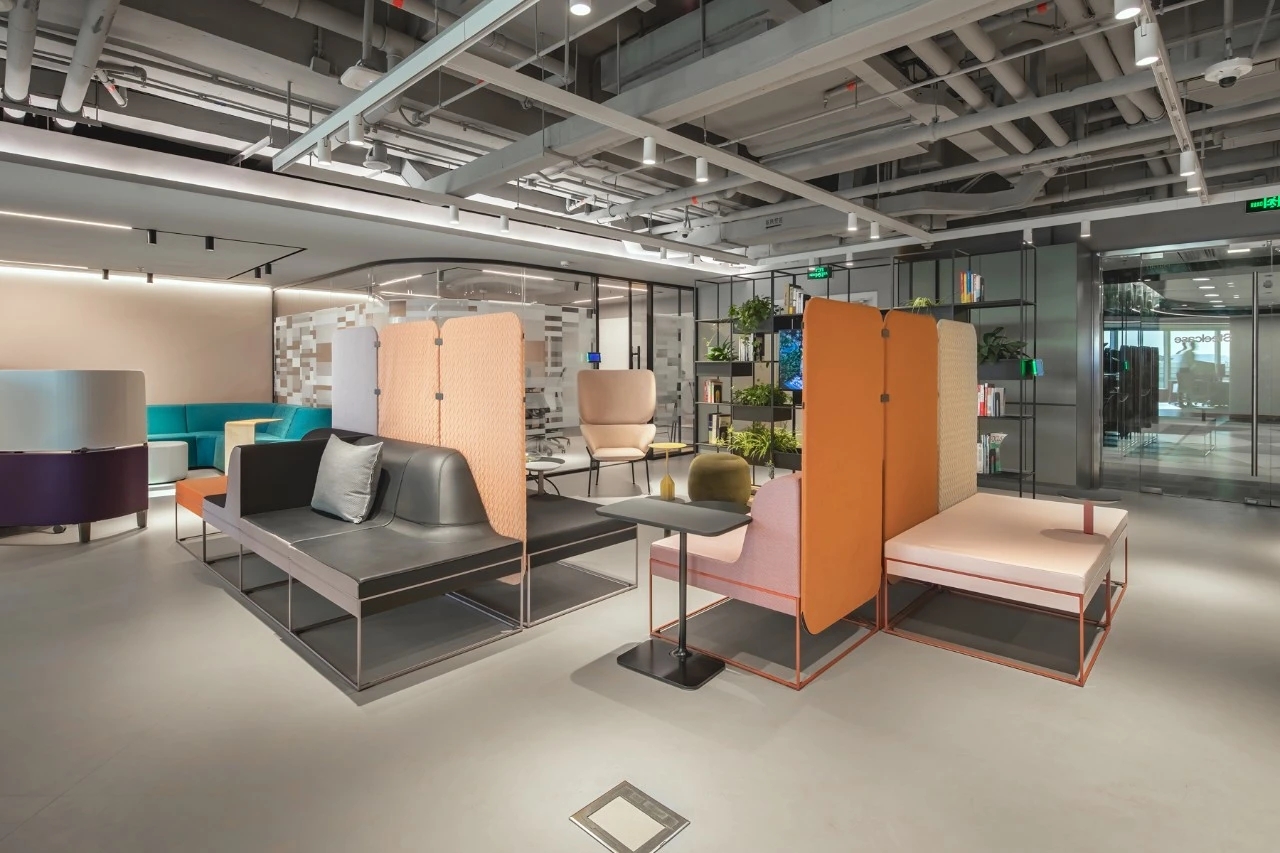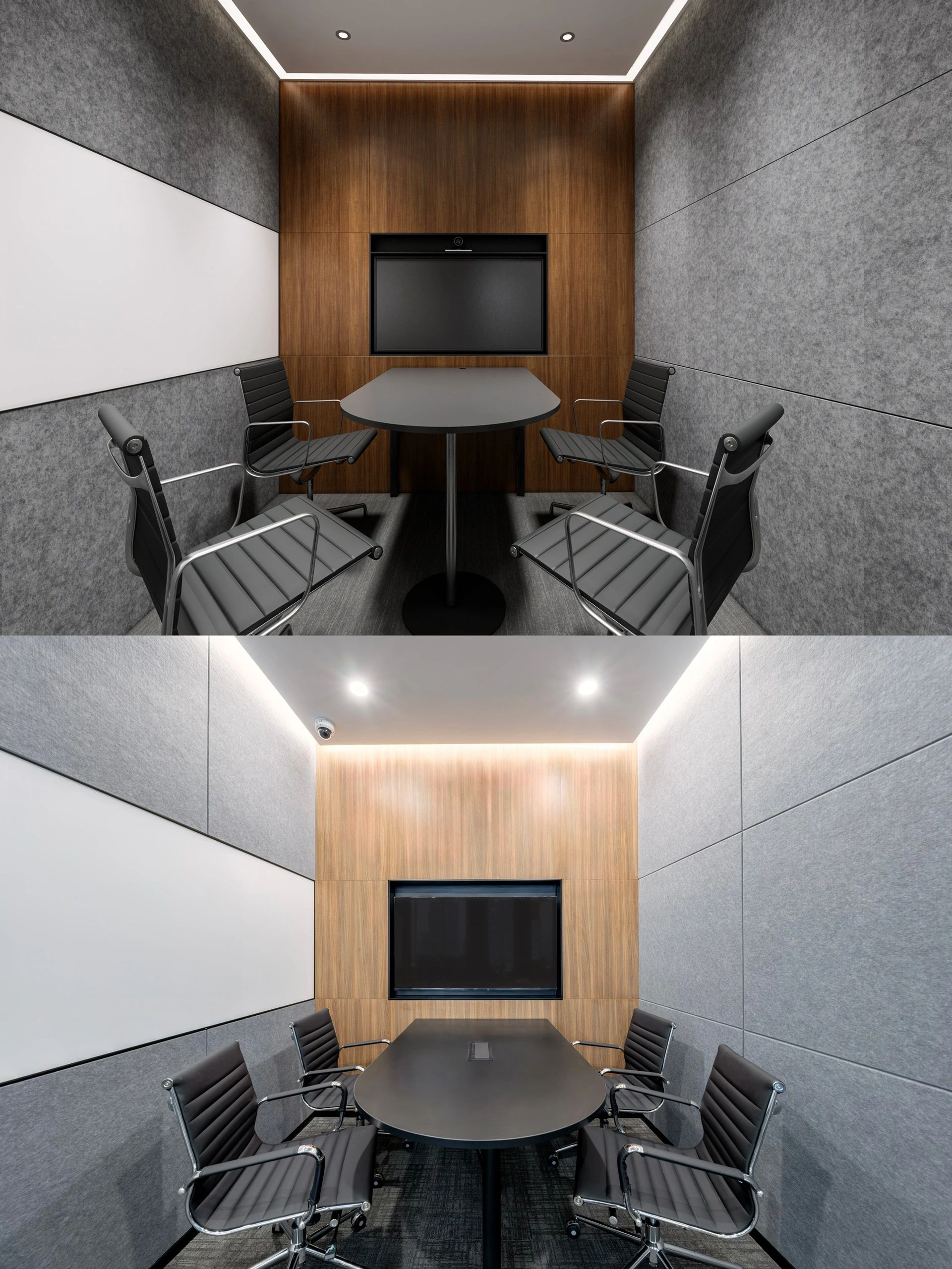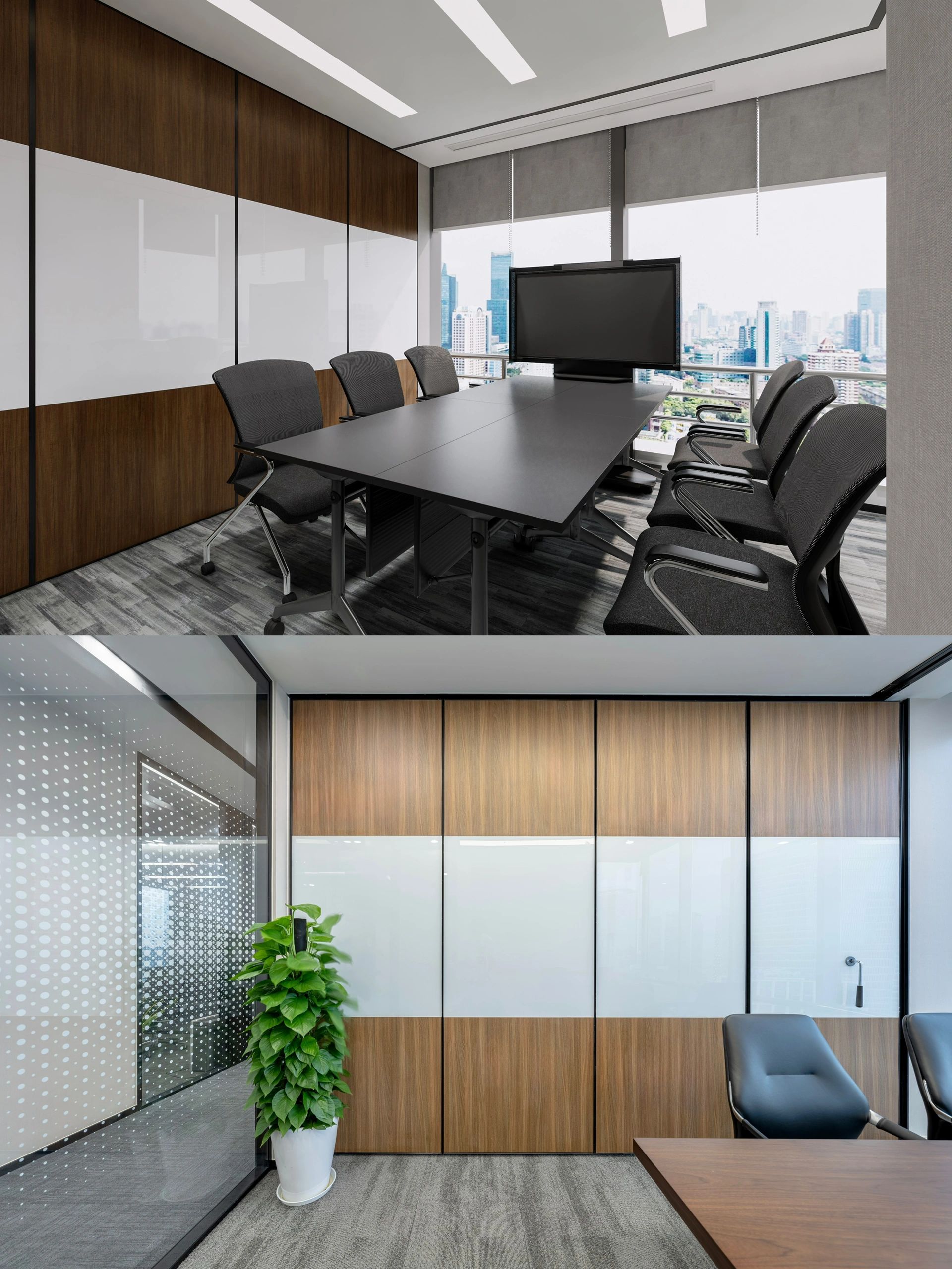 针对会议接待需求,我们设计了不同功能的会议室。通过家具形态可满足洽谈 线上线下会议。运用移动隔断可扩充会议室大小提高空间利用率。