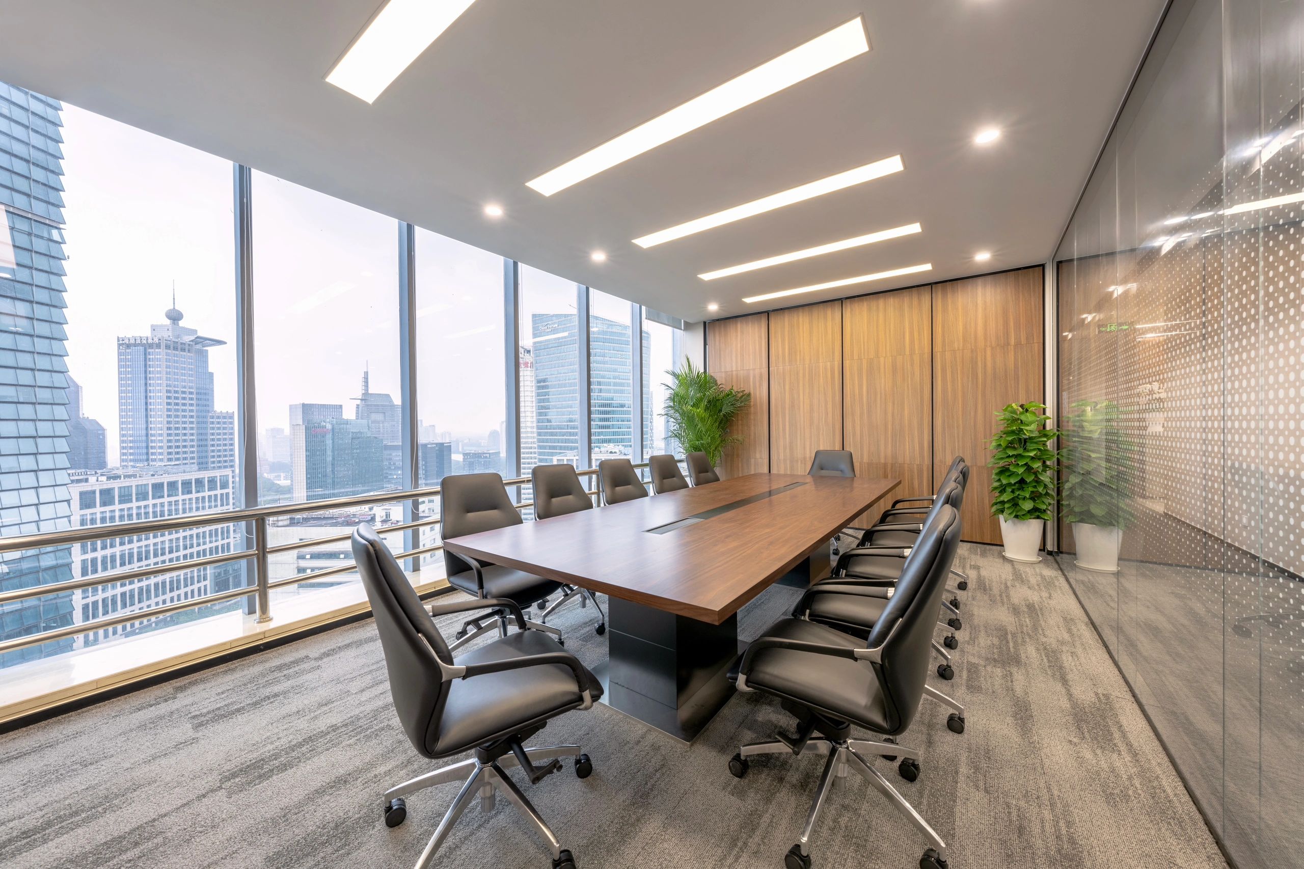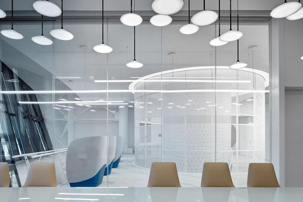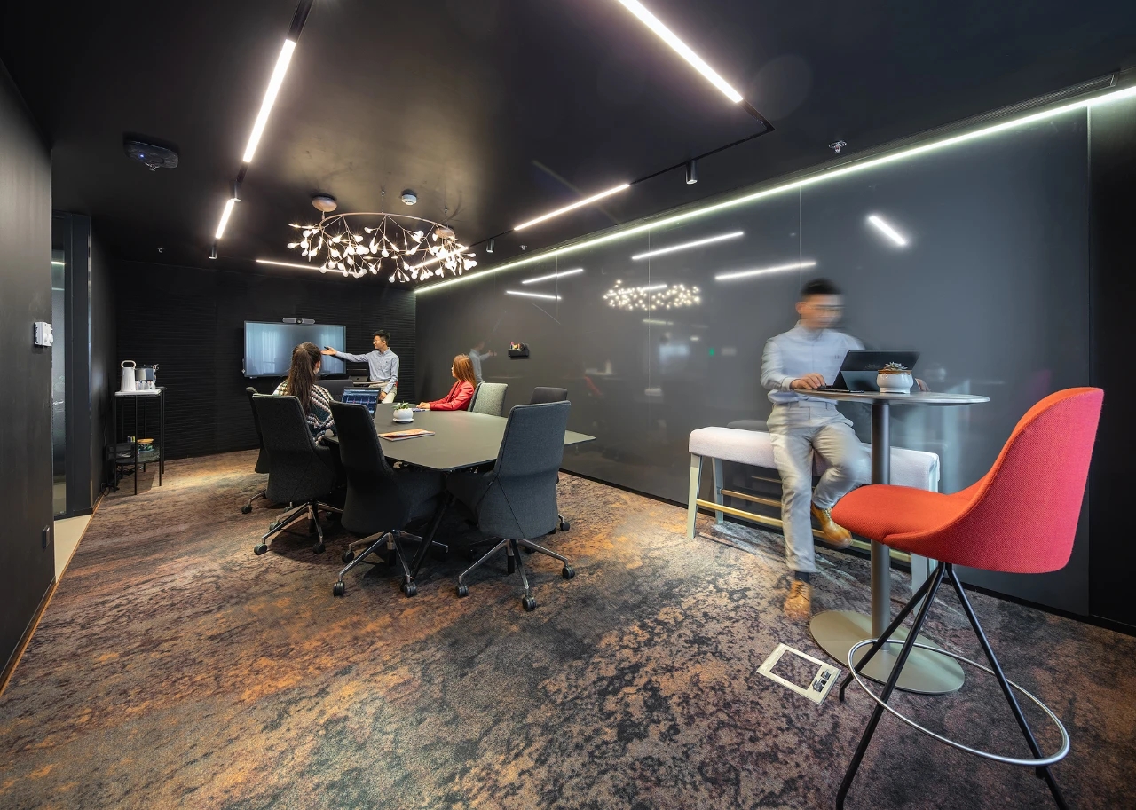 针对会议接待需求,我们设计了不同功能的会议室。通过家具形态可满足洽谈 线上线下会议。运用移动隔断可扩充会议室大小提高空间利用率。