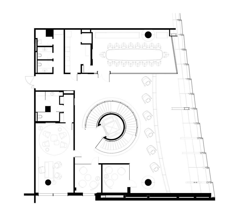 神秘无限的空间充满了神秘的符号和各种明亮的光影。一个垂直的光柱成为中庭连接上下楼层的重要元素,它是由圆形悬浮楼梯、中央电梯、近旁的吧台和空灵的灯光组成的综合体。