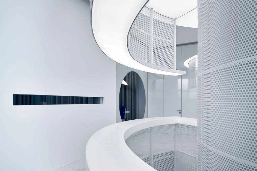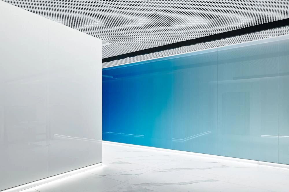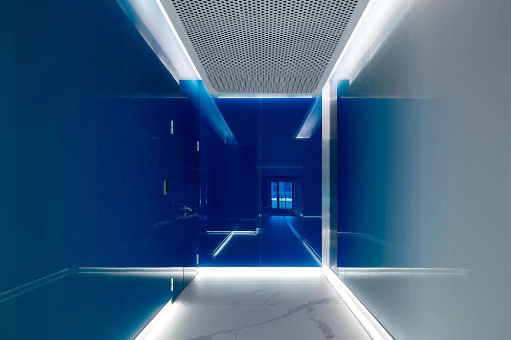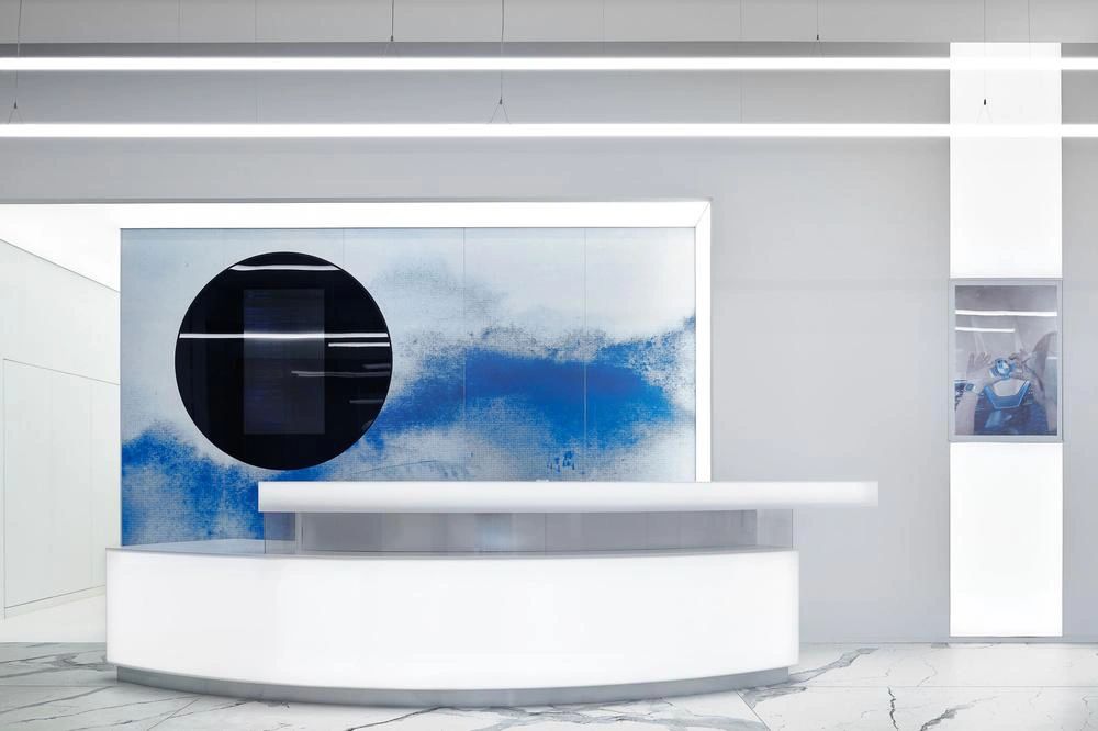 整体的配色方案来自于太空浩瀚的蓝色和白色组合,就像在飞机上你看到的万里碧空和漂浮的白云。空灵唯美的光影空间让客户在等候时犹如正经历着旅行。