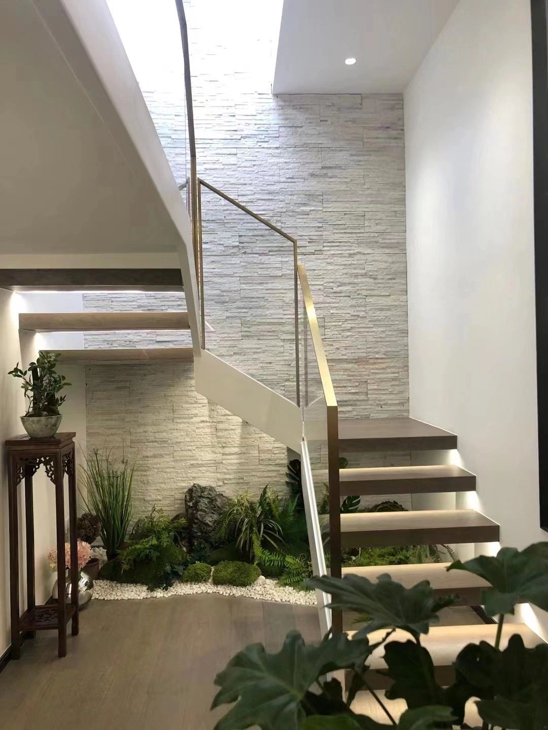 稳重感,我们以较为深色的木饰面和石材来表现,体现大气稳重感,也直观展现行业特点。