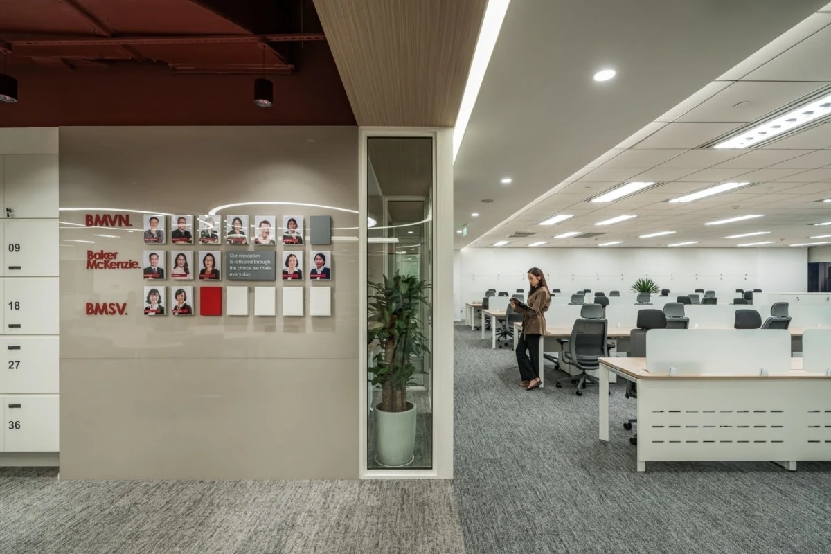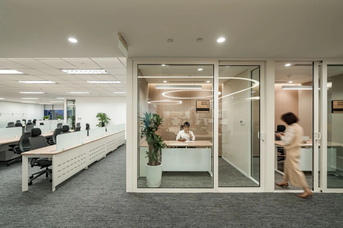 从一楼延伸至四楼的工作区域设计注重透明和开放,采用大面积玻璃隔板,将单一用途的办公室与周围的走廊相连接,保持空间的通透性。其他区域则采用开放式布局,融合了混合空间、电话亭和会议舱等元素,使得员工在同一空间内可以灵活转换工作模式。定制设计的木围栏巧妙地界定了休息区域,提供了非正式的聚会场所,提升了空间的互动性与灵活性。