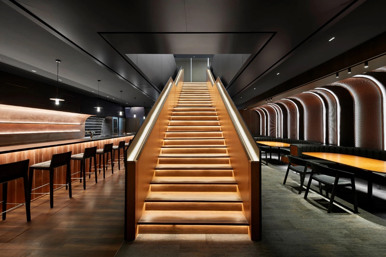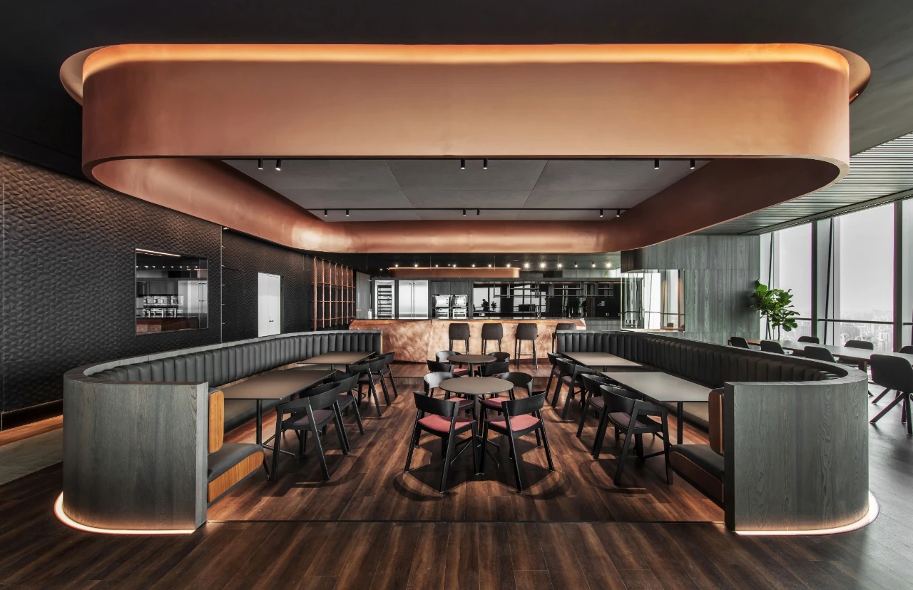 除了专注的工作环境,上海酷拳还配备了多功能共享空间,鼓励团队成员之间的交流与合作。开放区域可一览外滩美景,是进行小组讨论、游戏娱乐或轻松对话的绝佳场所。小型观影室、电竞网吧等设施,为员工提供了丰富的休闲娱乐选择。咖啡吧台的设计灵感源自日本威士忌酒吧,提供咖啡和各种饮品,让员工在忙碌的工作之余也能感受到轻松与惬意。