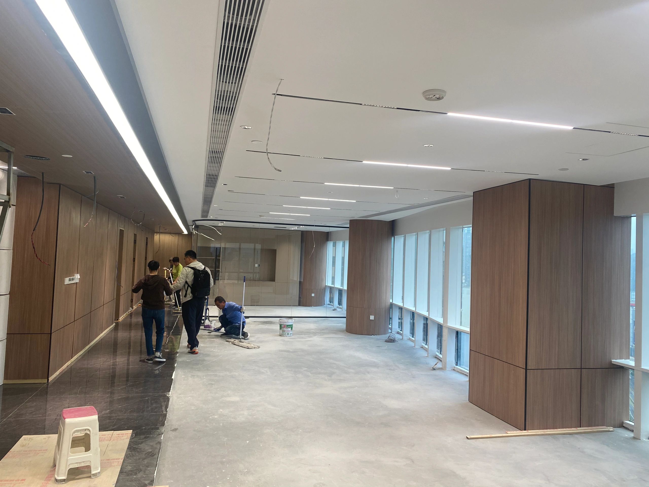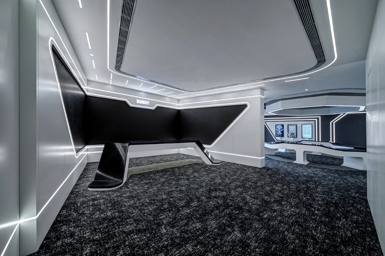 互动展示厅以科技感、大气感为设计主轴,天花选用高品质石膏板,兼具防火、防潮、隔音、环保等性能;多平面展开式LED屏幕搭配白光灯带,造型独特,充分提升整体空间的科技感与未来感,为客户带来耳目一新的交互体验。