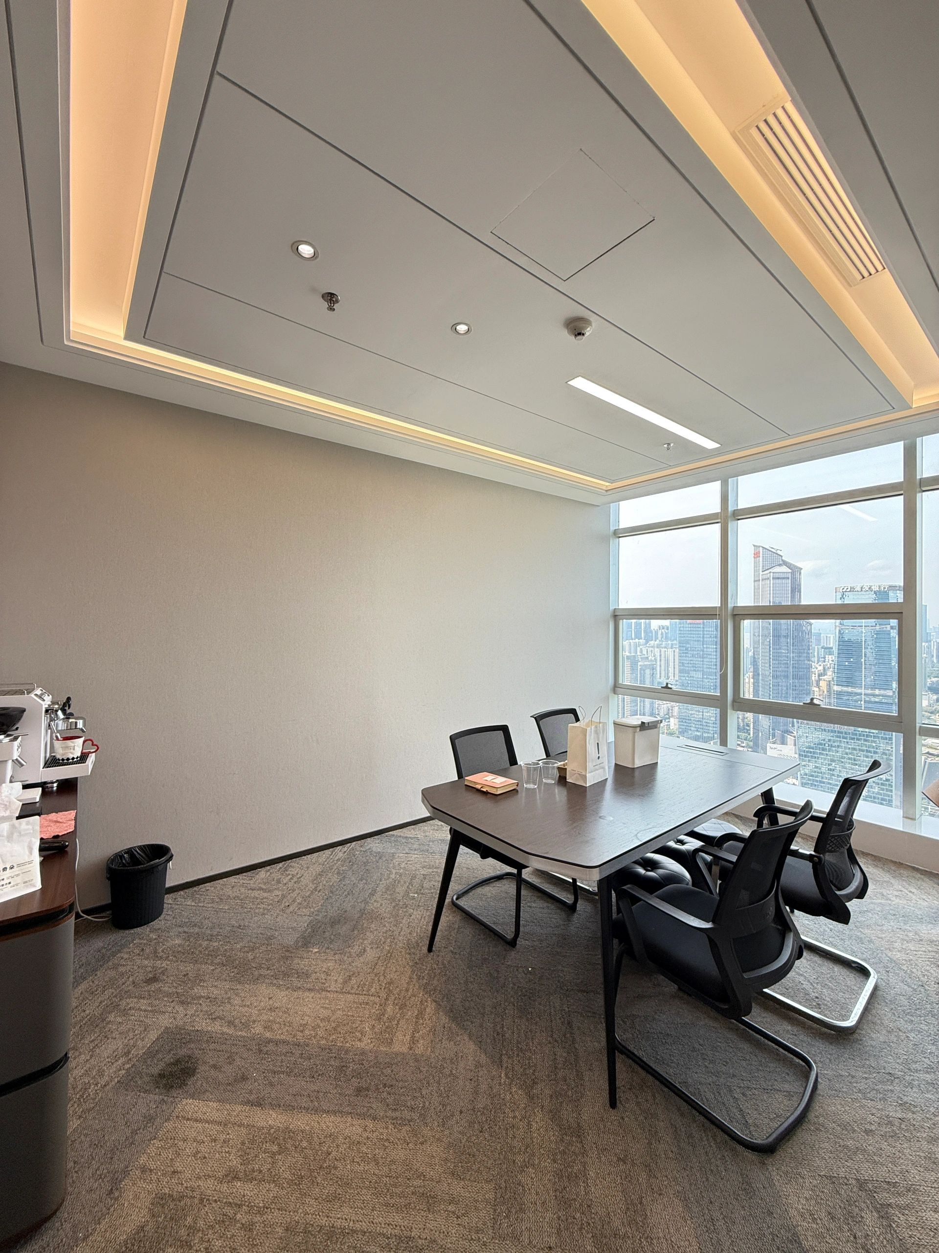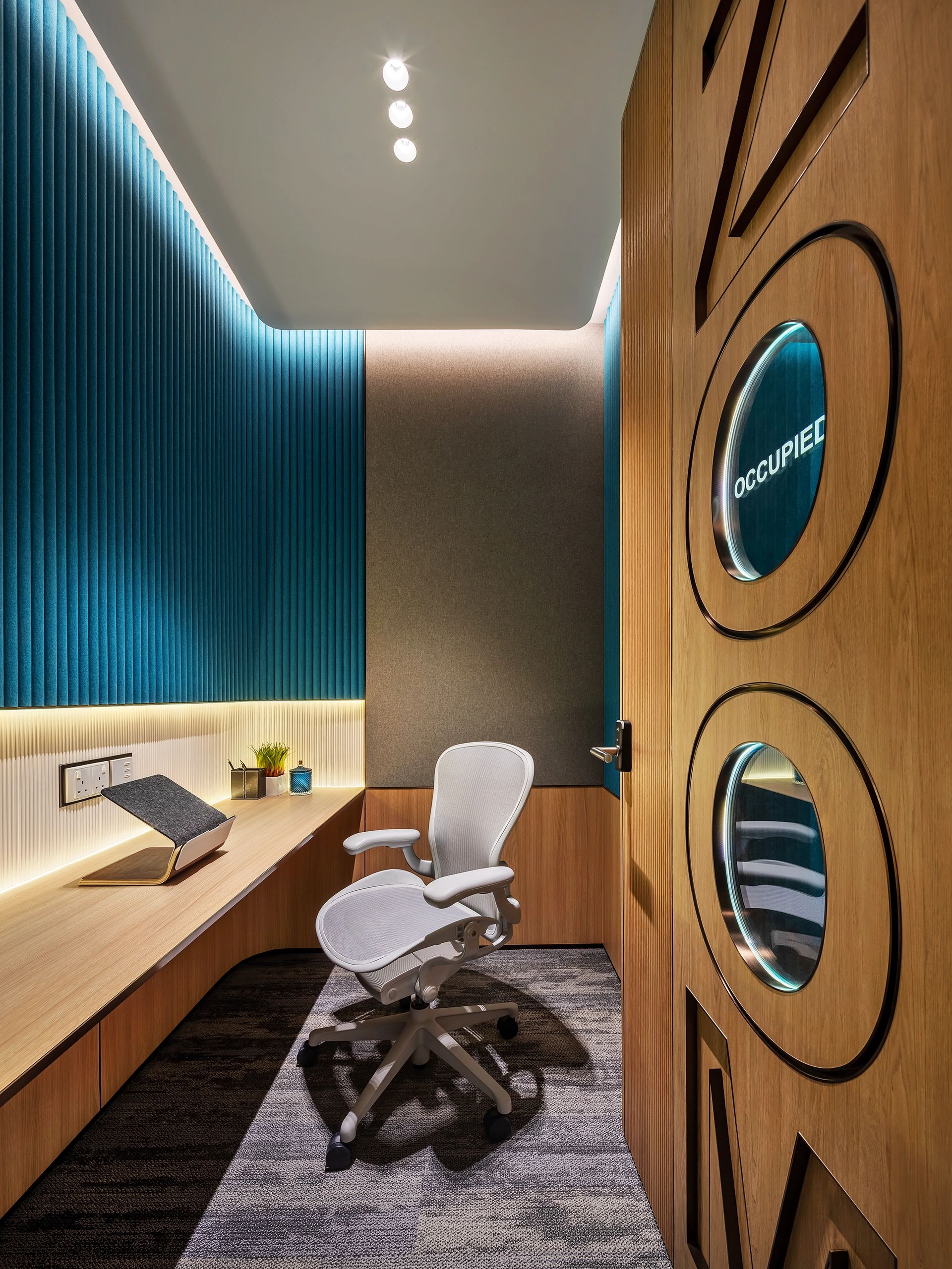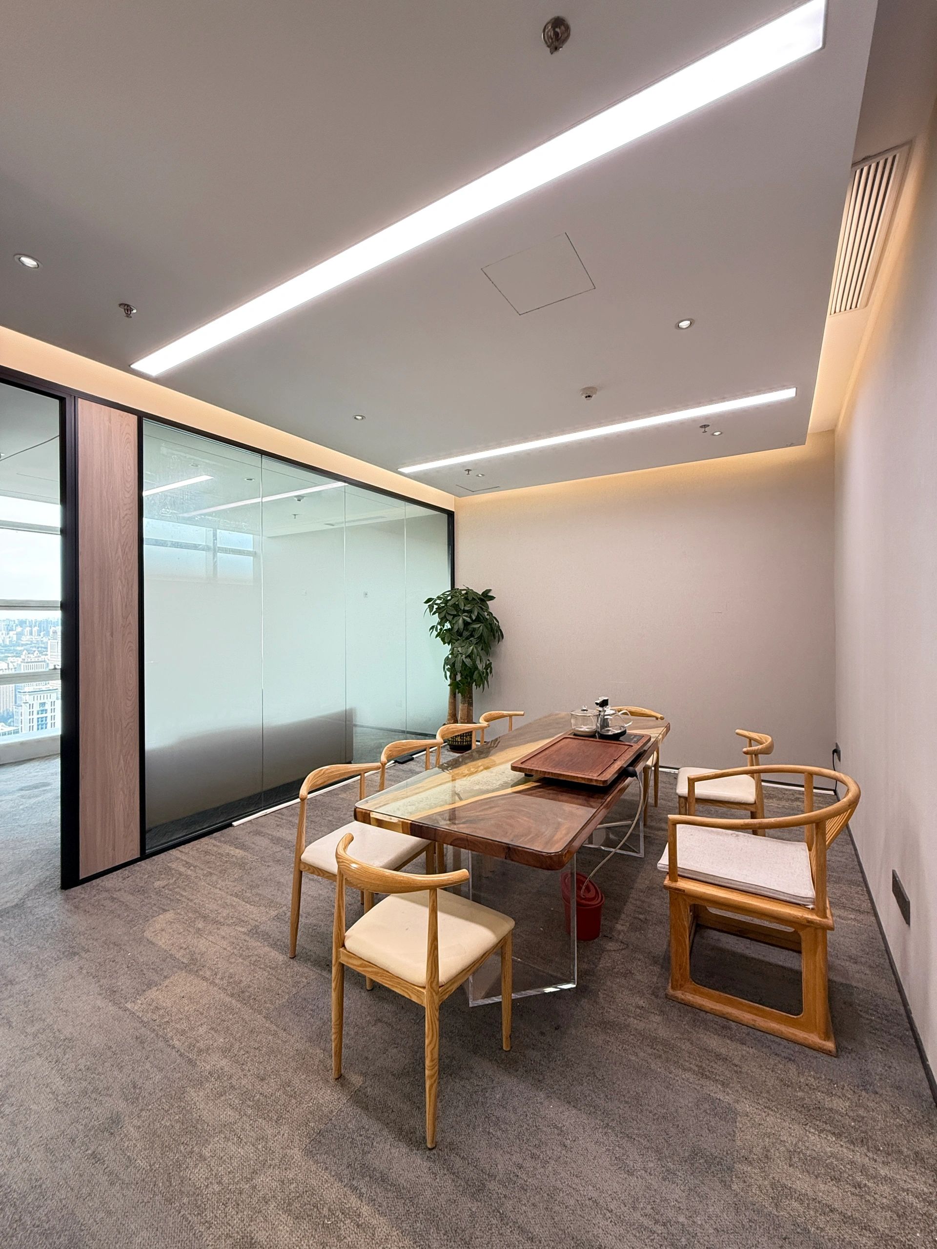 视频会议室延续整体设计的大气风格,质感桌椅构造出大体量的磅礴感,与浅色系墙板的搭配相得益彰,前者如山峦,铸就空间的大气格局,后者如涓流,赋予室内环境轻盈的呼吸感。