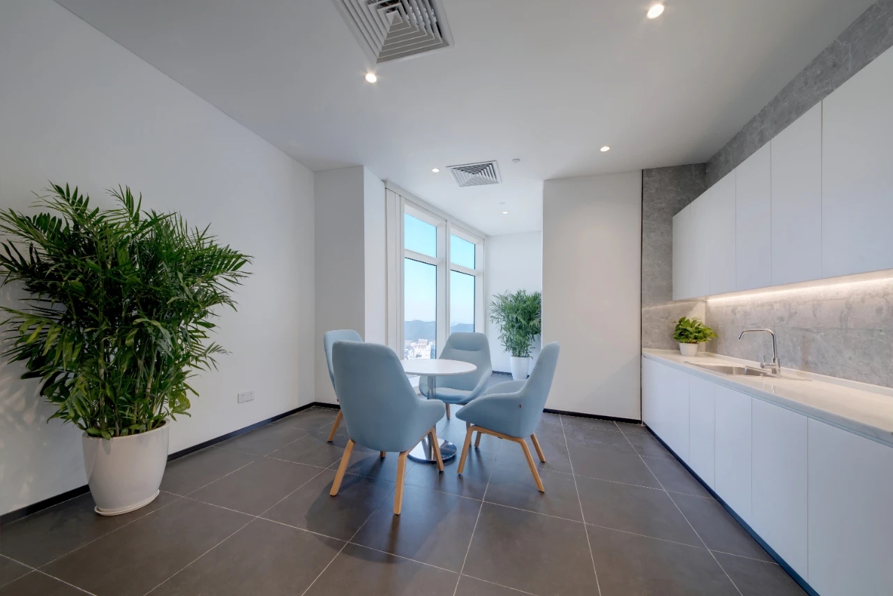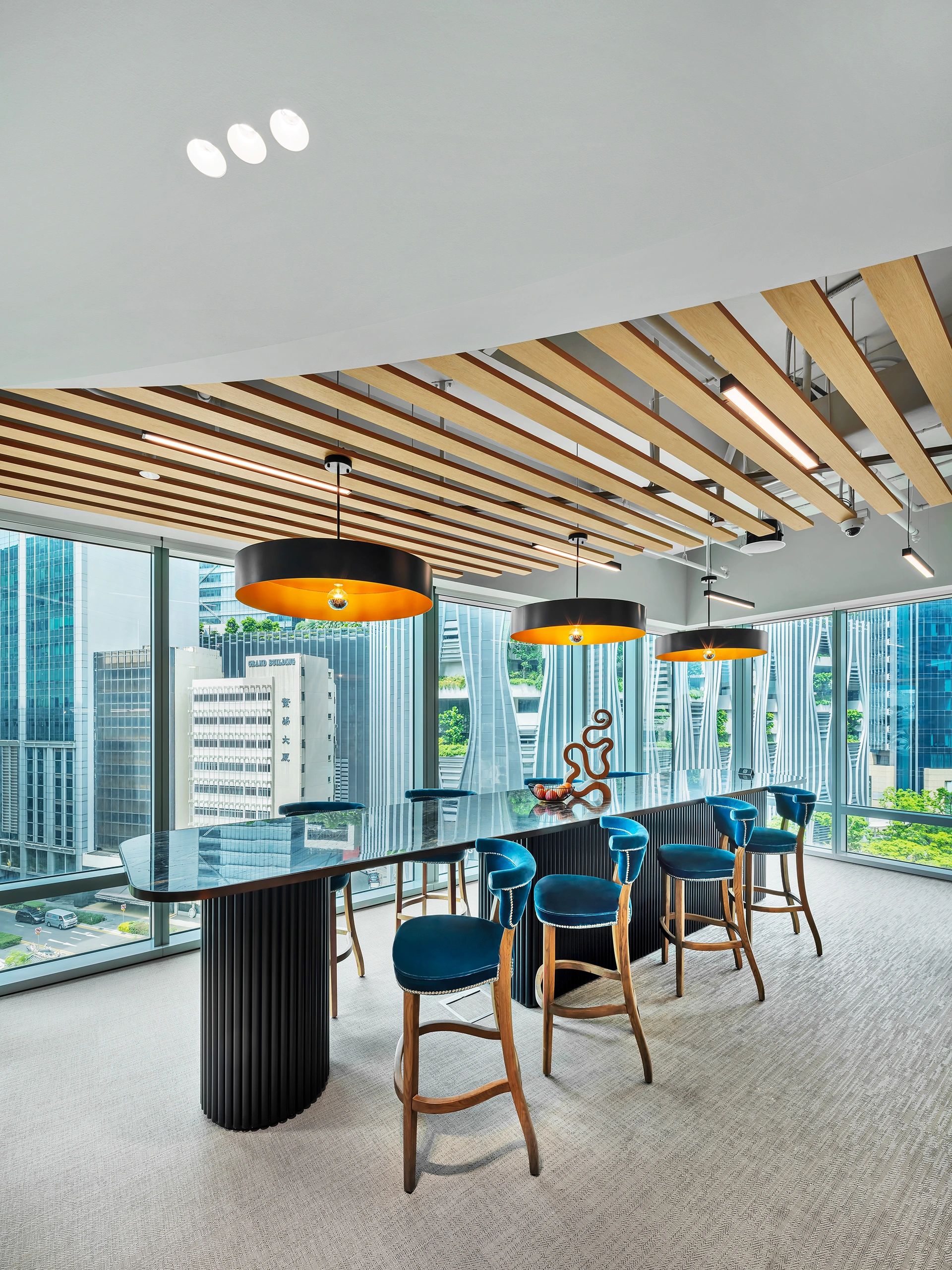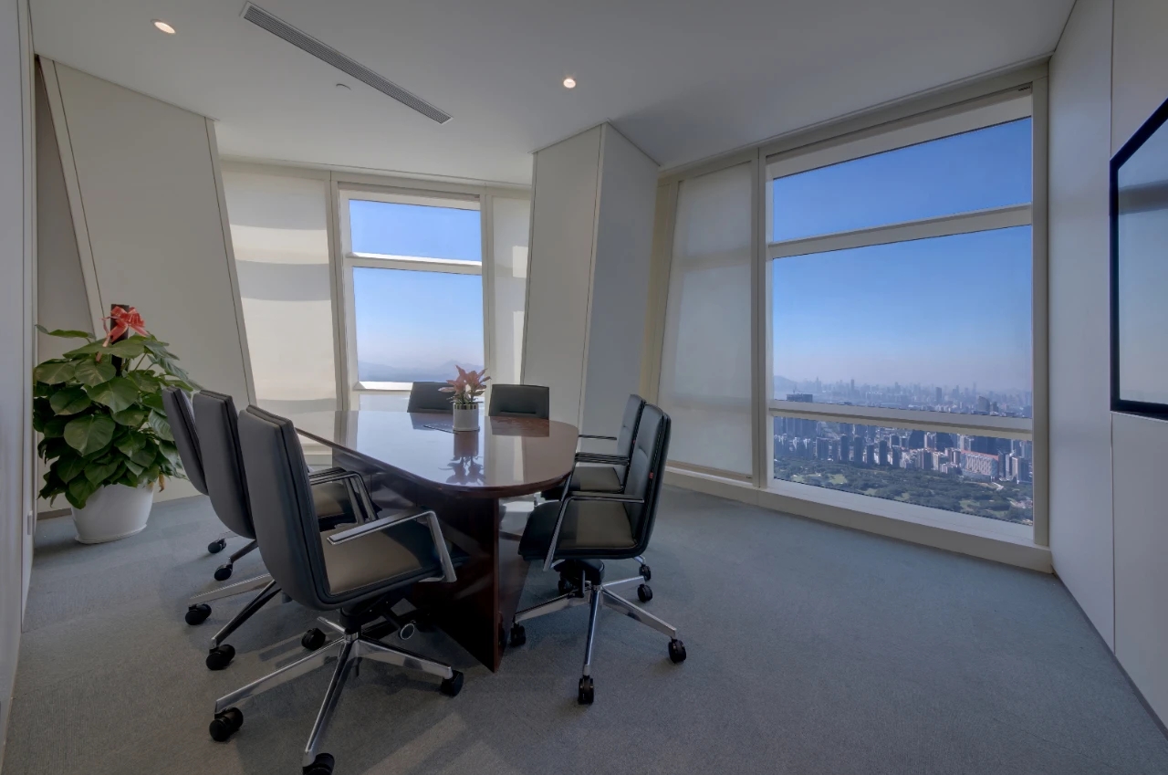 视频会议室延续整体设计的大气风格,质感桌椅构造出大体量的磅礴感,与浅色系墙板的搭配相得益彰,前者如山峦,铸就空间的大气格局,后者如涓流,赋予室内环境轻盈的呼吸感。