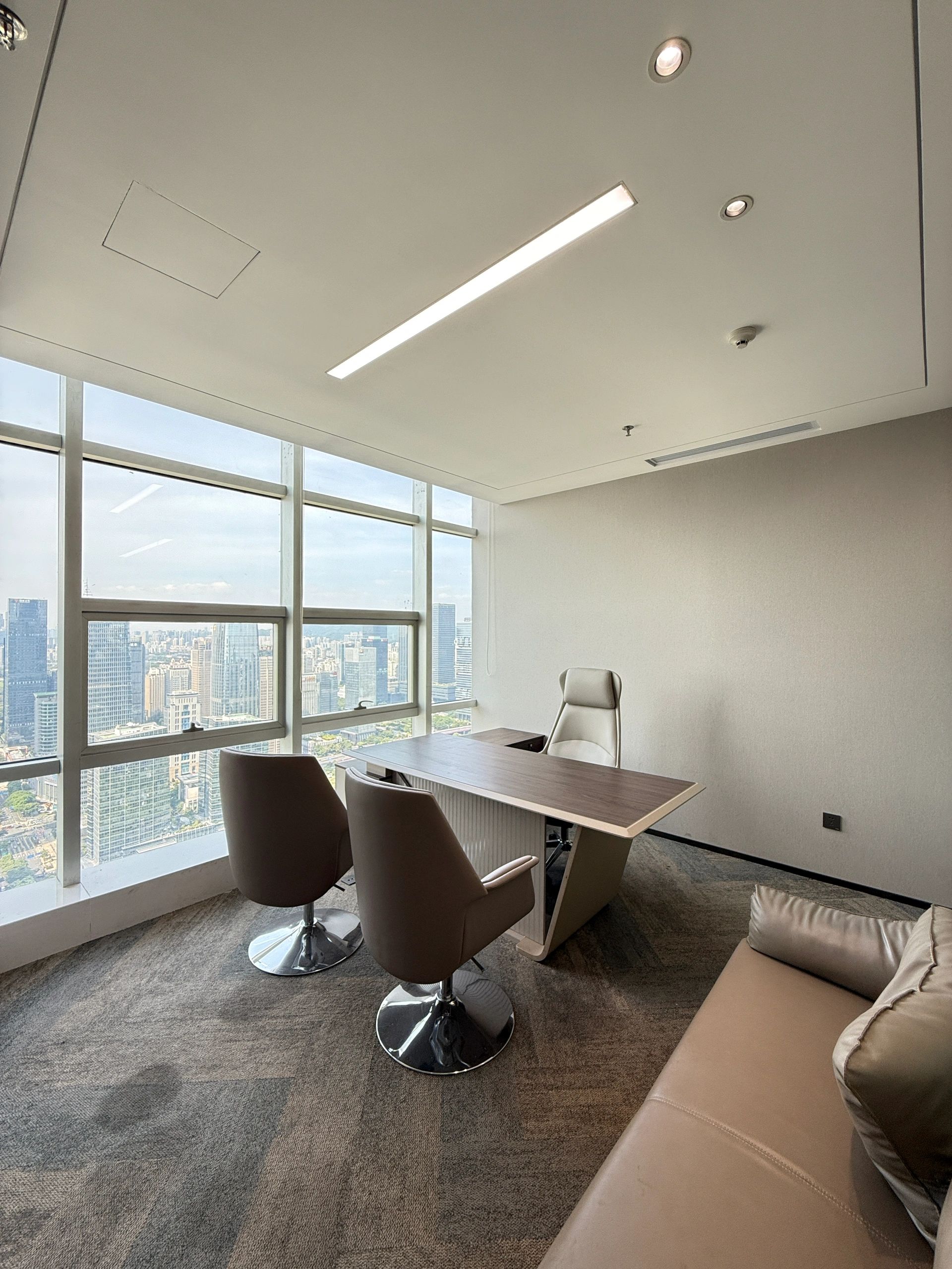副职办公室以浅色调为主,光线柔和宜人,选用原木家具搭配绿植盆景,打造自然绿色的室内环境,舒缓过于紧张的工作节奏,赋予整个空间亲近淡雅的气质。橡木色与深棕色的层次搭配舒缓了高管办公室的沉闷和压抑,相较淡色系空间更具庄重感;同时设有商务沙发、茶几,便于与客户的交流合作,兼具办公与接待功能。