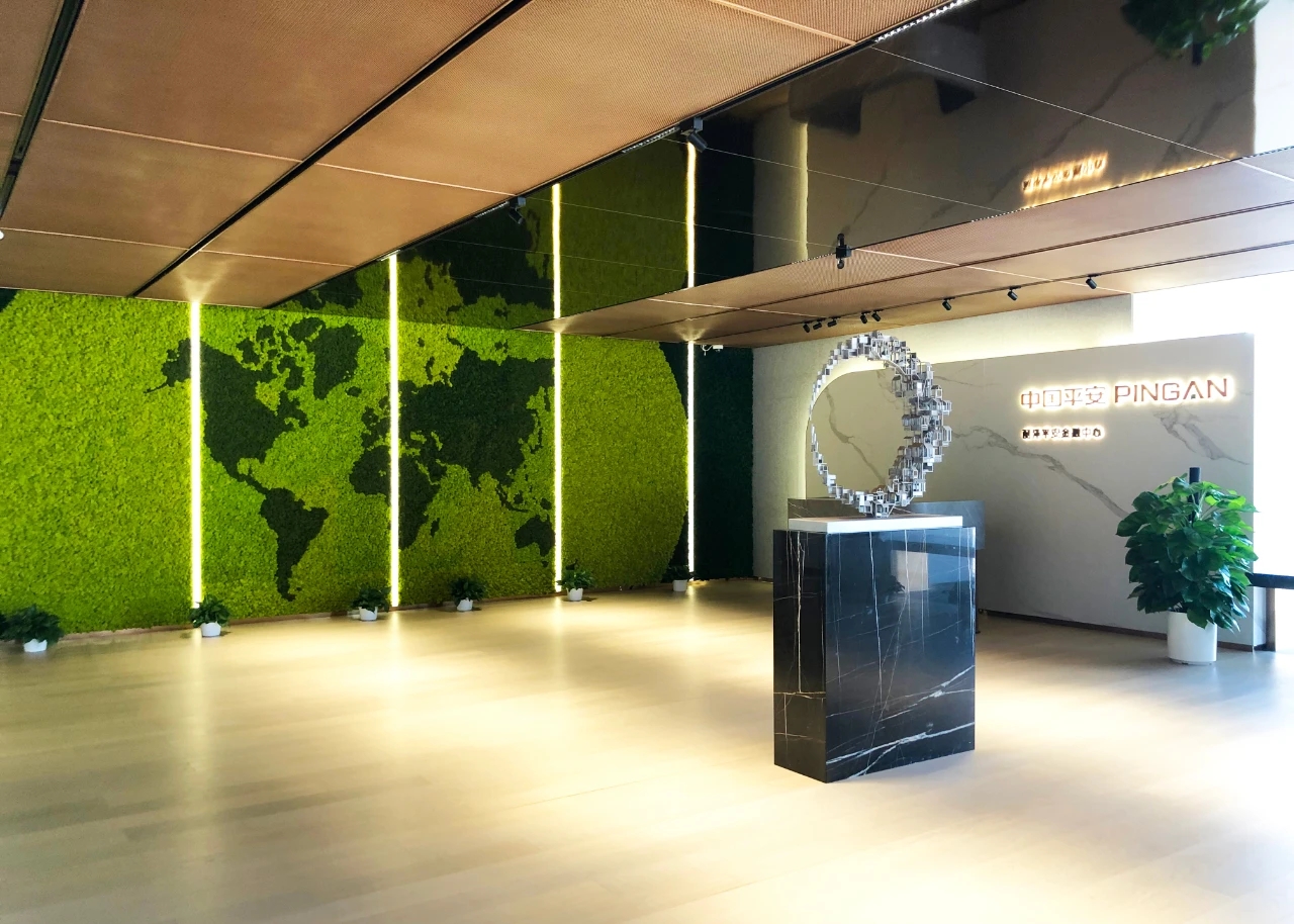 步入大厅,映入眼帘的便是由绿植墙堆叠演绎的全球地图,独特造型彰显出空间的大气感与国际化,象征着企业的包容与开放。设计团队选用白色大理石作为背景墙面,与木质地板相辅相成,给予来访者典雅舒适的商务体验。精心打造的月牙形房屋艺术品,遗世而独立,点燃整体空间的艺术视觉感受。