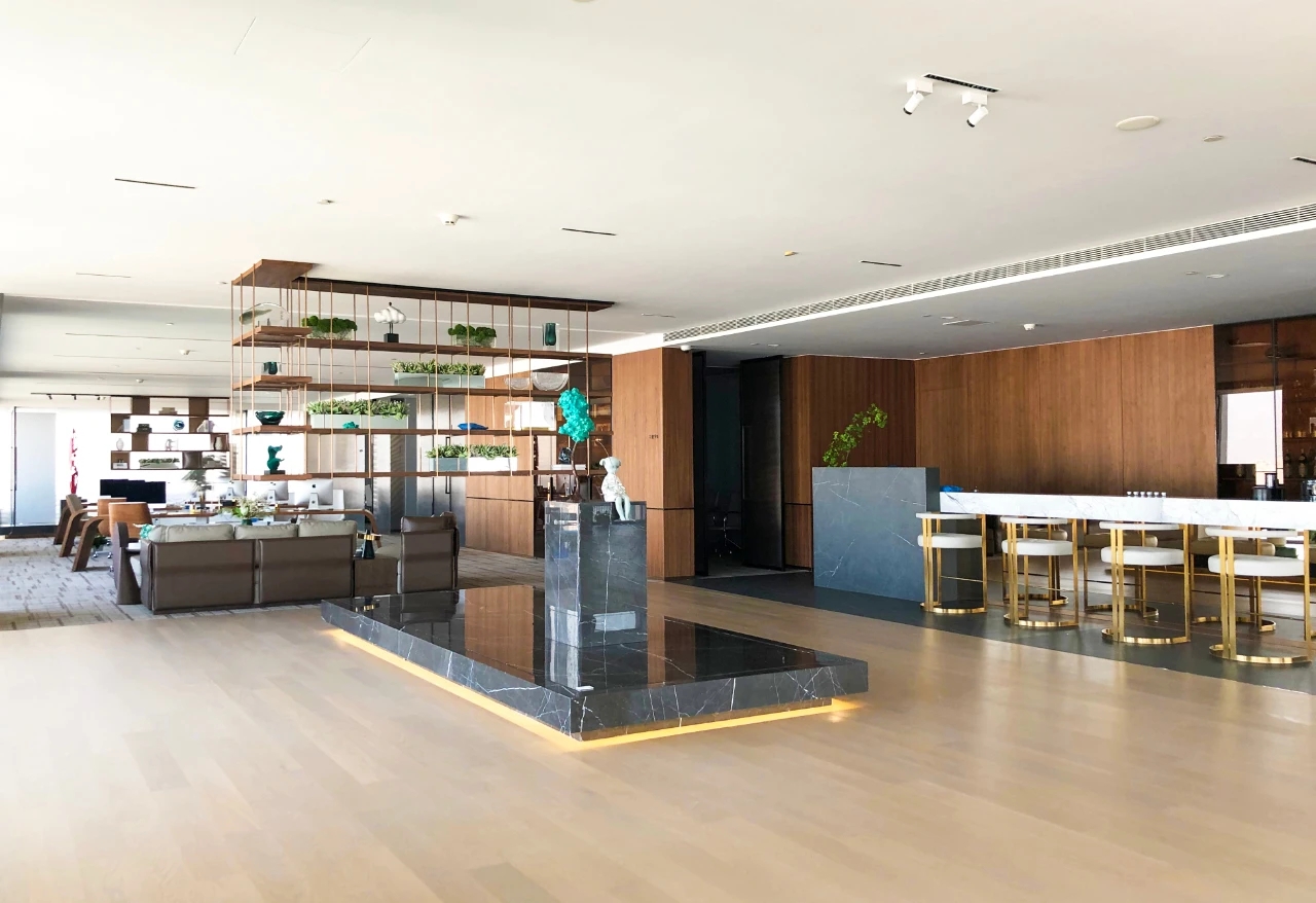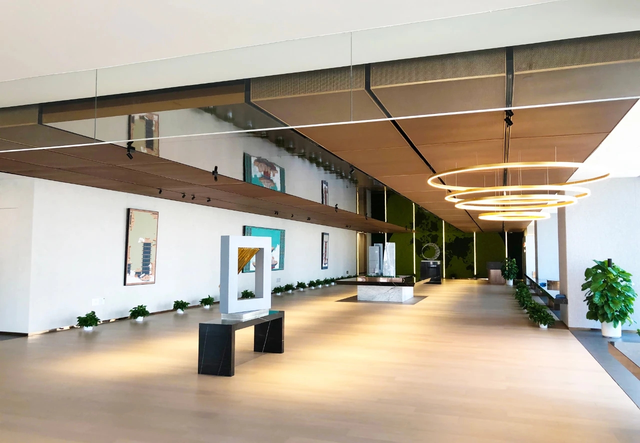 展示大厅内摆放三处建筑类艺术品,以入口处的月牙形艺术品为序曲,透明建筑模型为过渡,窗型摆件为终章,与墙面的艺术插画相映成趣,共同谱写出一曲浮世乐章,整体艺术风格强烈,造型设计时尚简约,极具现代化艺术气息。设计团队极富创意的设置镜面天花,映照着艺术长廊的倒影,刻画出“秋水共长天一色”的雅致。而最为独特的金属圆环灯饰,再度为室内环境带来一丝新意,每一处细节共同营造出高品质的艺术感官体验。