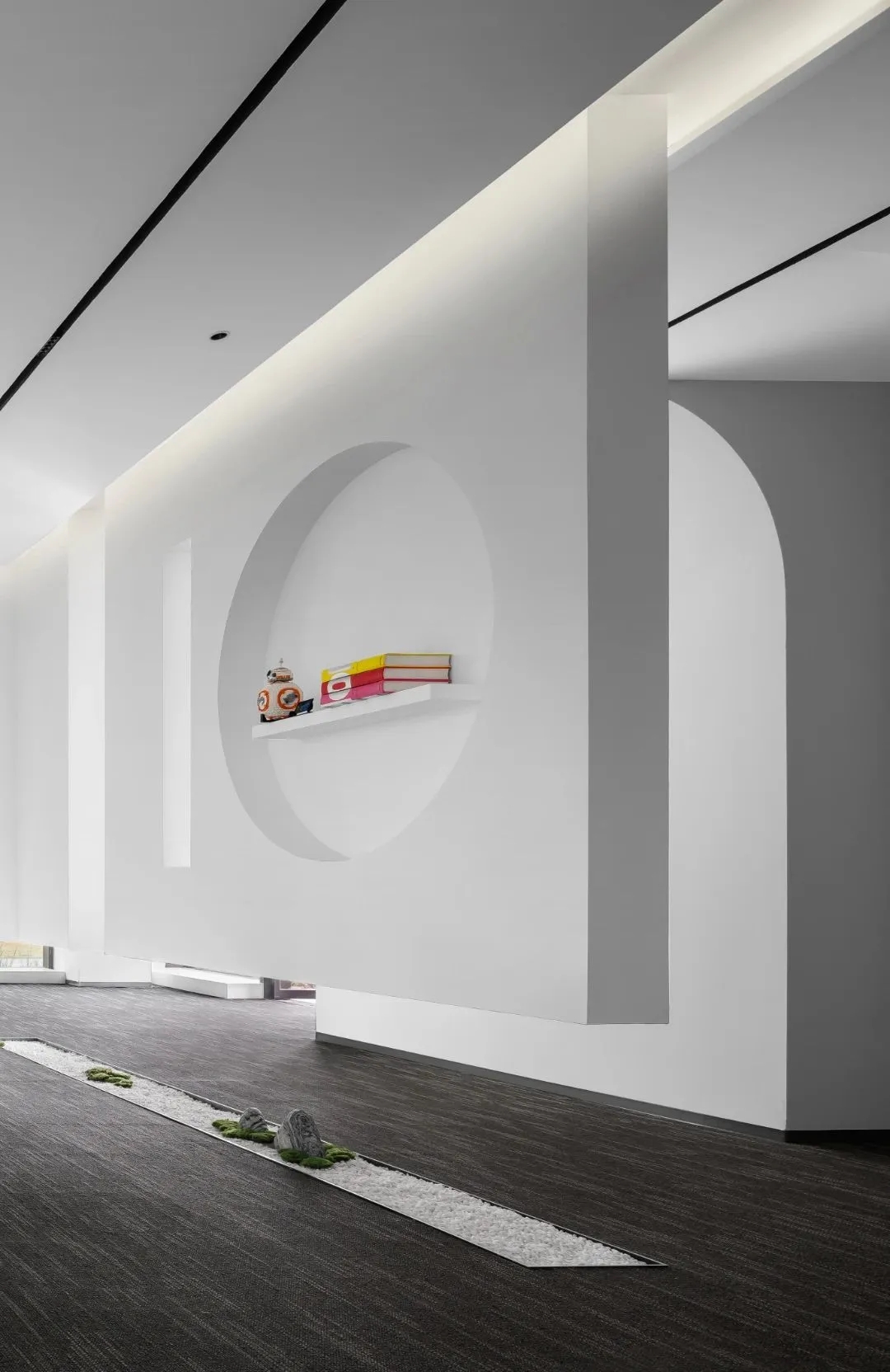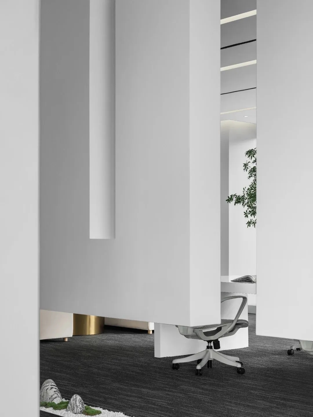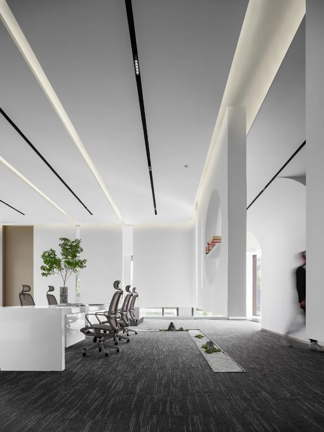 利用块面、隔断和线条等介质来解构空间整体,诉说办公空间的秩序与平衡。遵循由动至静、由开放到私密的组合方式,根据不同需求合理划分空间,从而提升办公效率。在直线组成的块面形态中运用曲线构建空间的柔与钝,让空间画面刚中寓柔,营造不同的空间情绪。设计中运用的不同光源在与线条的协作中赋予空间更为细腻的变化,同时影响着办公场景中人的情绪展现。走进共享办公区,悬浮式墙面设计,隔而不断,兼具实用与美观的双重功能,帮助空间刻画富有雕塑感的形态。