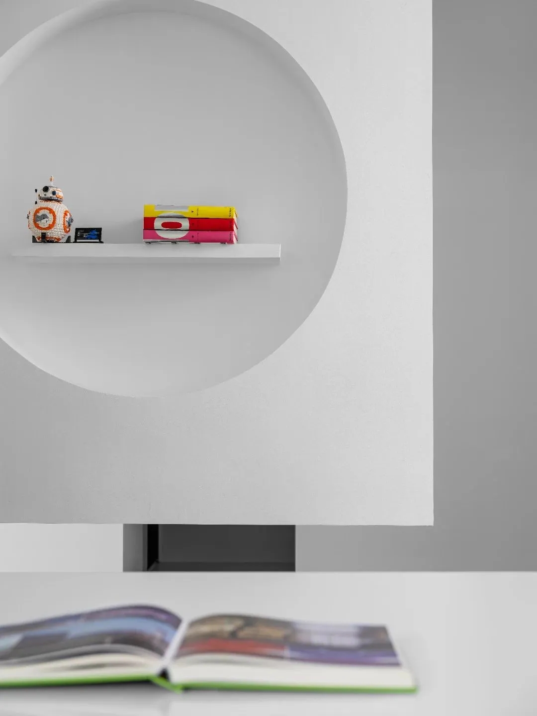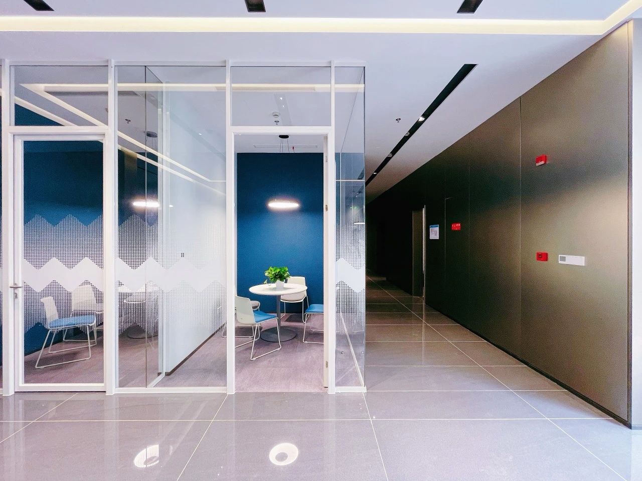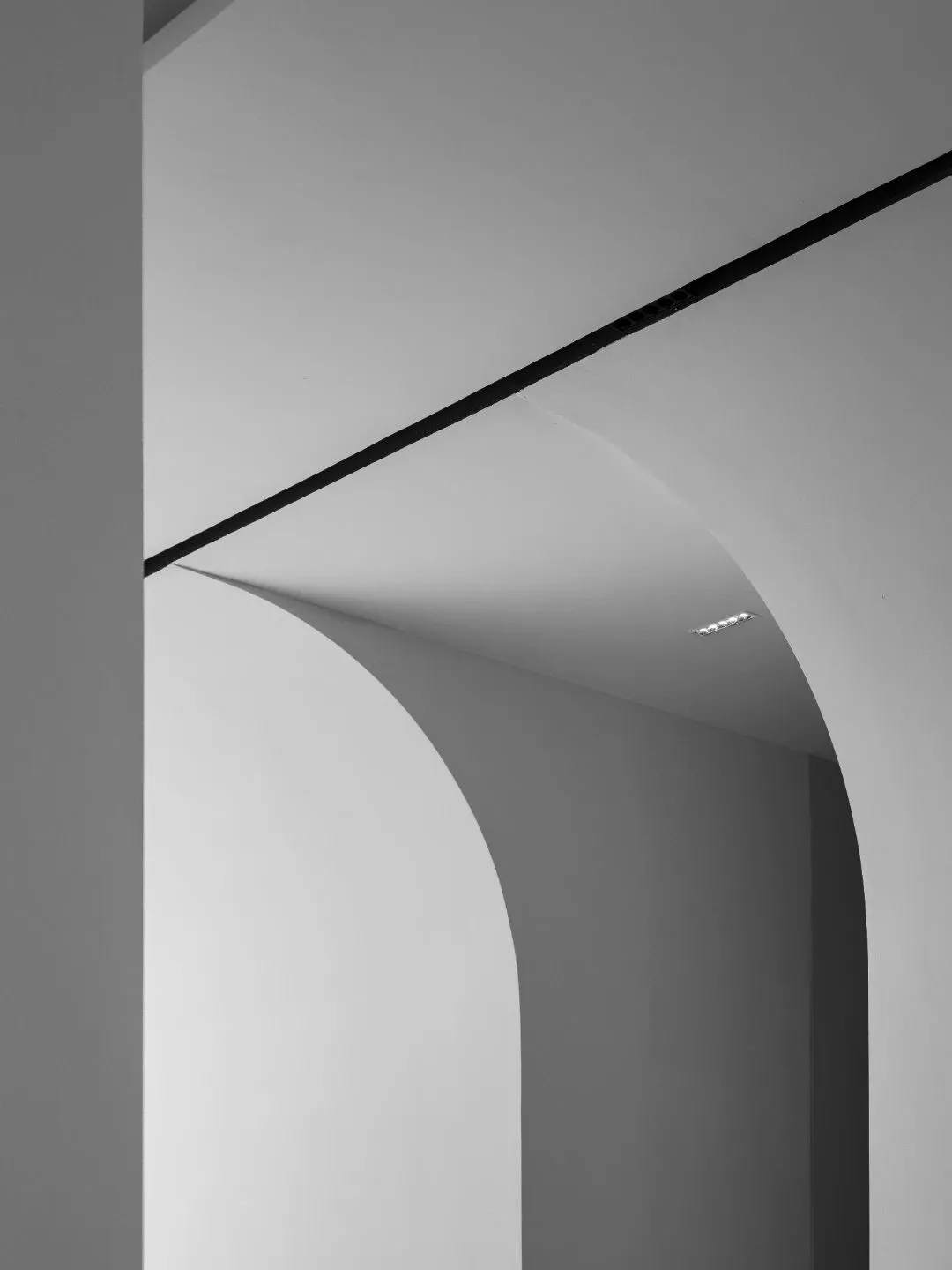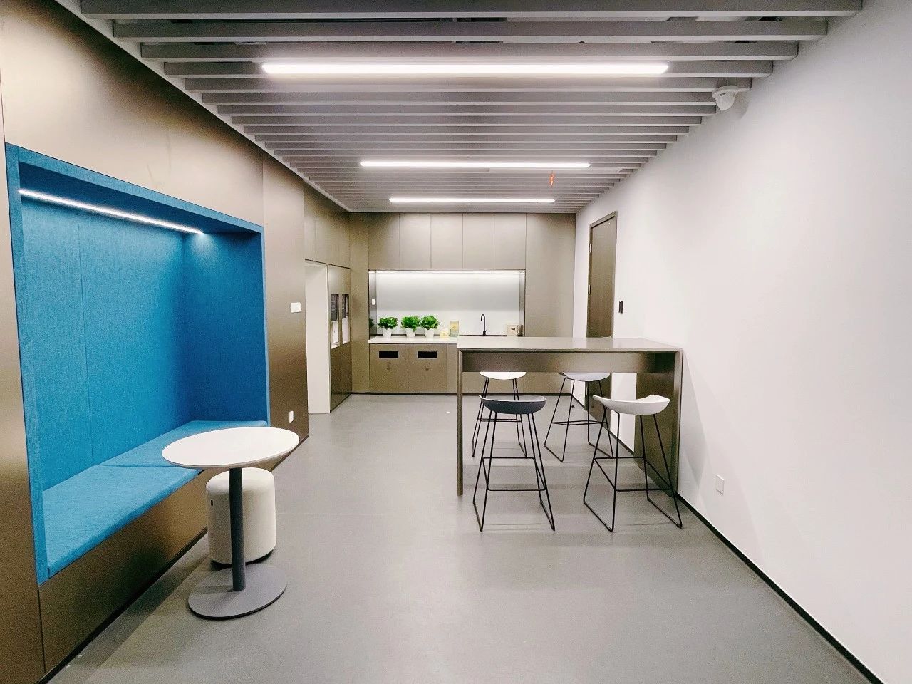 利用块面、隔断和线条等介质来解构空间整体,诉说办公空间的秩序与平衡。遵循由动至静、由开放到私密的组合方式,根据不同需求合理划分空间,从而提升办公效率。在直线组成的块面形态中运用曲线构建空间的柔与钝,让空间画面刚中寓柔,营造不同的空间情绪。设计中运用的不同光源在与线条的协作中赋予空间更为细腻的变化,同时影响着办公场景中人的情绪展现。走进共享办公区,悬浮式墙面设计,隔而不断,兼具实用与美观的双重功能,帮助空间刻画富有雕塑感的形态。
