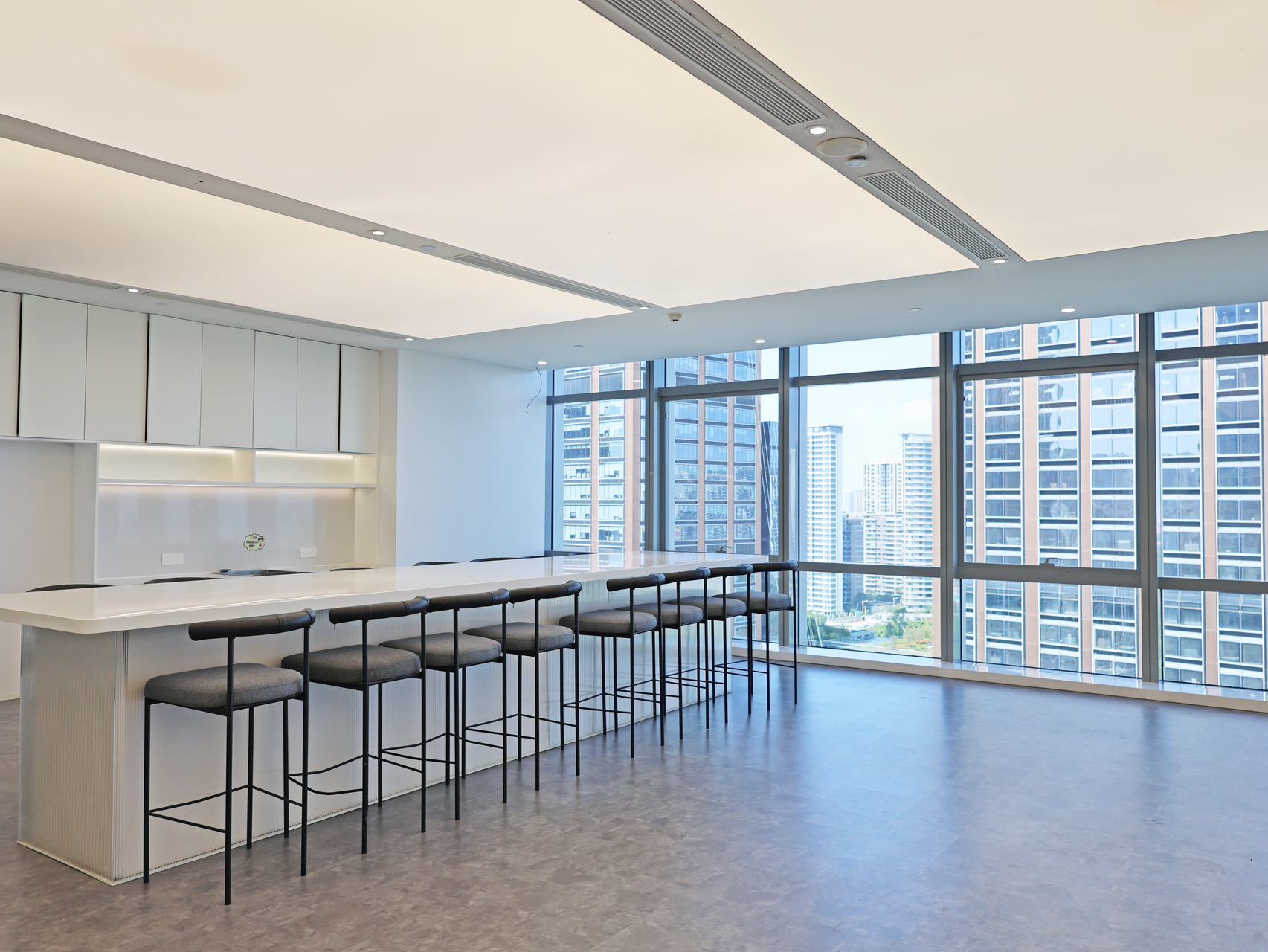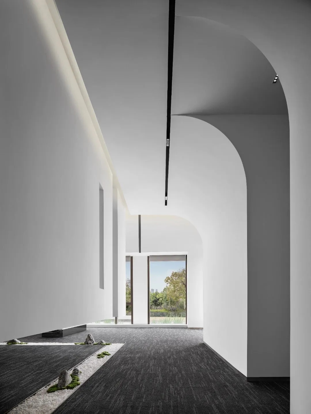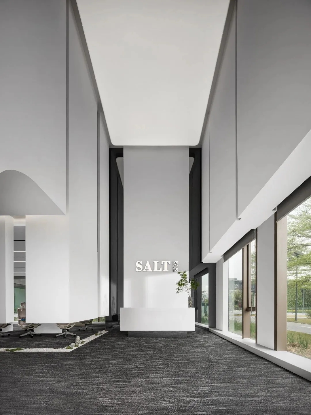 设计将立体化的画面构图延伸至空间中,重构出一个极具雕塑感的艺术空间,致力于为年轻新生的烧糖文化提供极具自由与高效的创作场域。曲直相间,块面交融直线视觉之中,极具张力的挑高背景墙一直延续至整个天花,为前台大厅带来开阔且通透的心理感受,同时给予进入者久违的仪式感。非对称的块面序列,遮蔽了建筑结构的缺陷,而室内外空间借用可视化的玻璃介质,营造出通透明亮的空间格局,模糊内外的界限,让景观与室内空间融为一体。