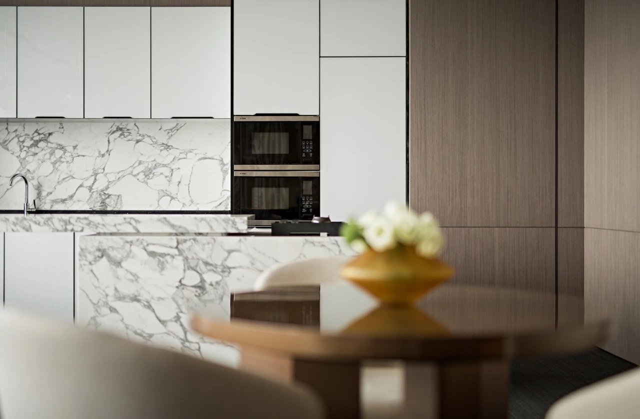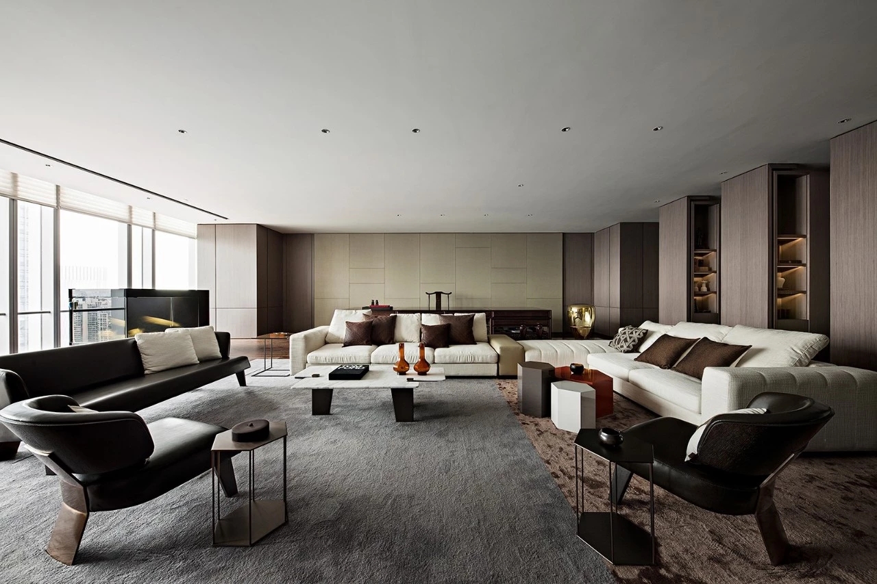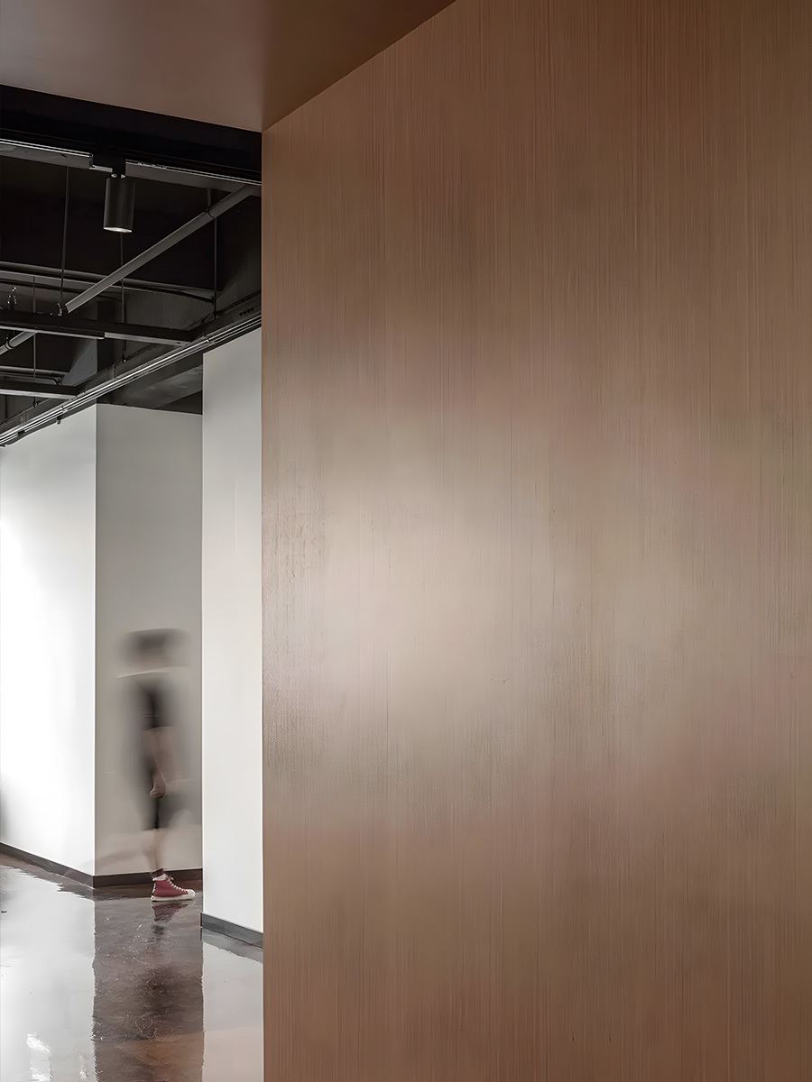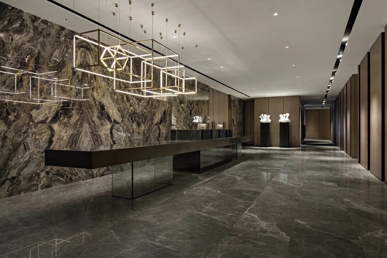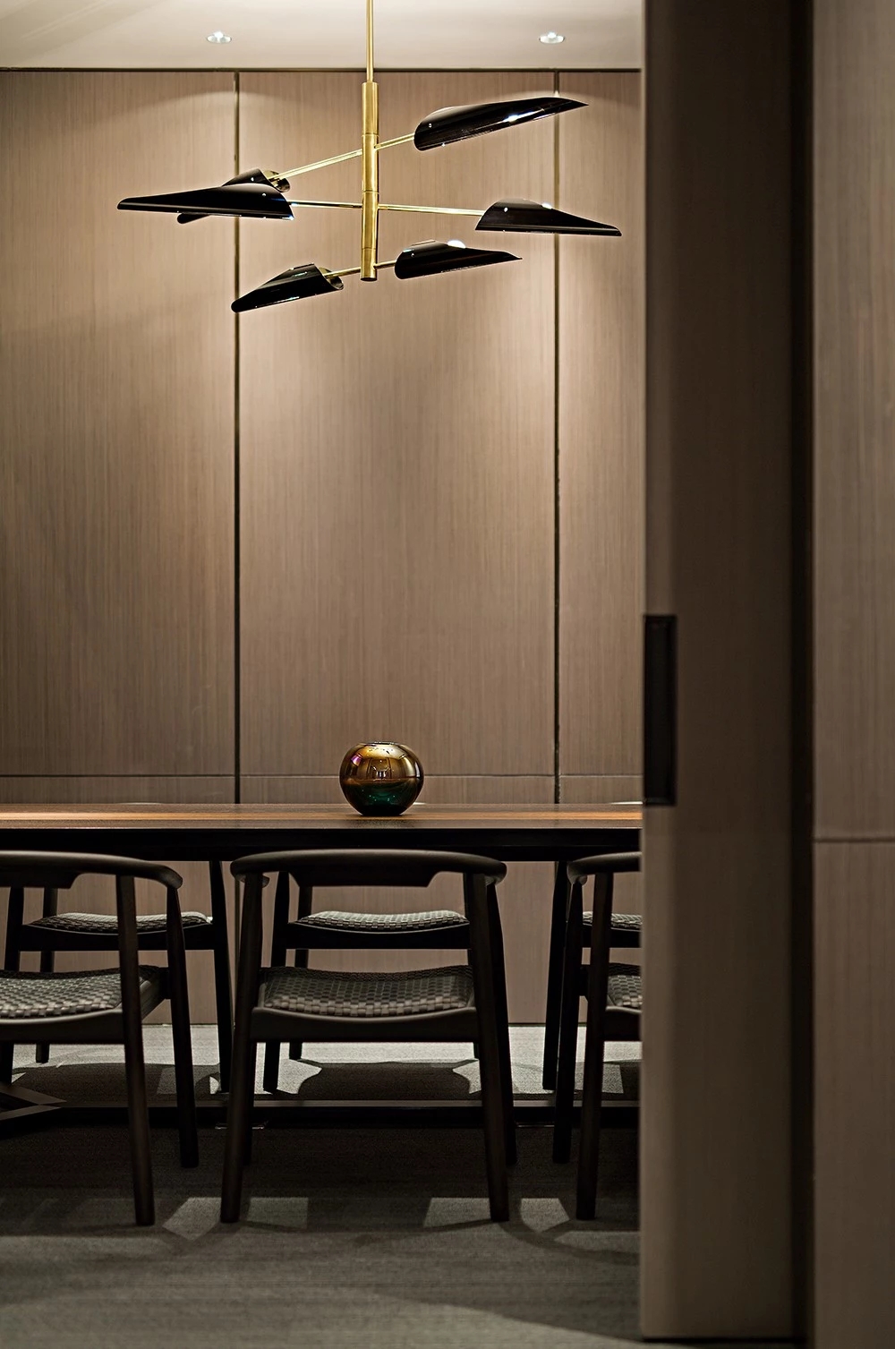 空间格调以稳重的中性灰为基调,墙面大面积的板岩直纹科技饰面板结合青古铜的精致工艺收边,块面体块利索而不失细致;合适的比例划分增添了几分优雅。