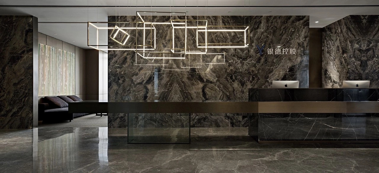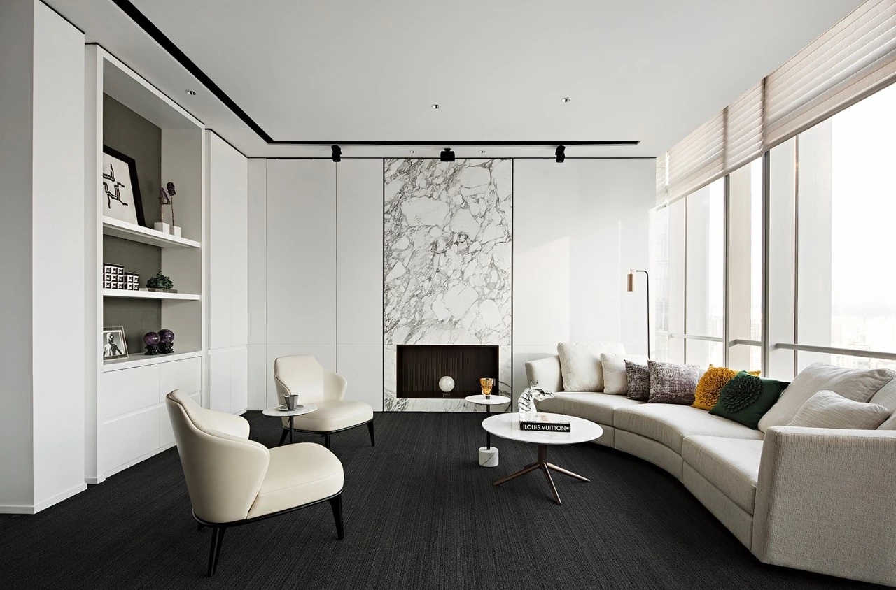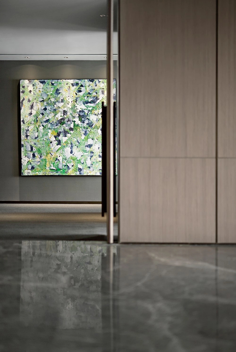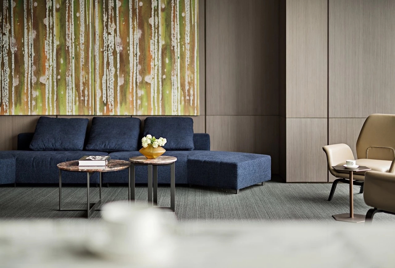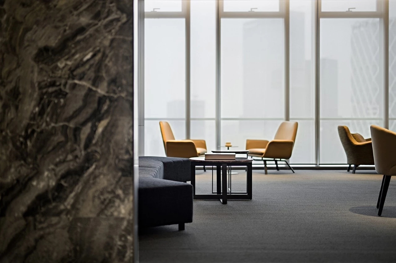 深灰色的模块地毯使得空间沉稳而富于质感;黑白灰系天然大理石的运用使得办公区展示适度的奢华;陈设上色彩丰富的艺术挂画和艺术品是空间精彩的点缀。