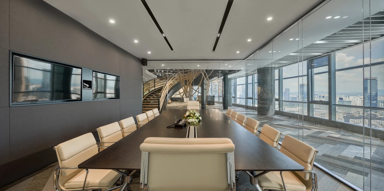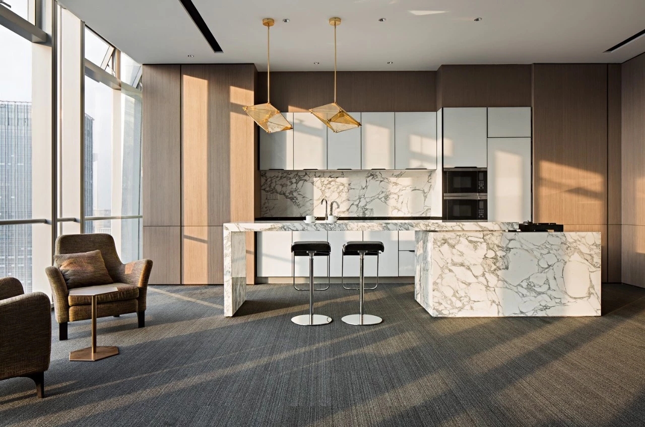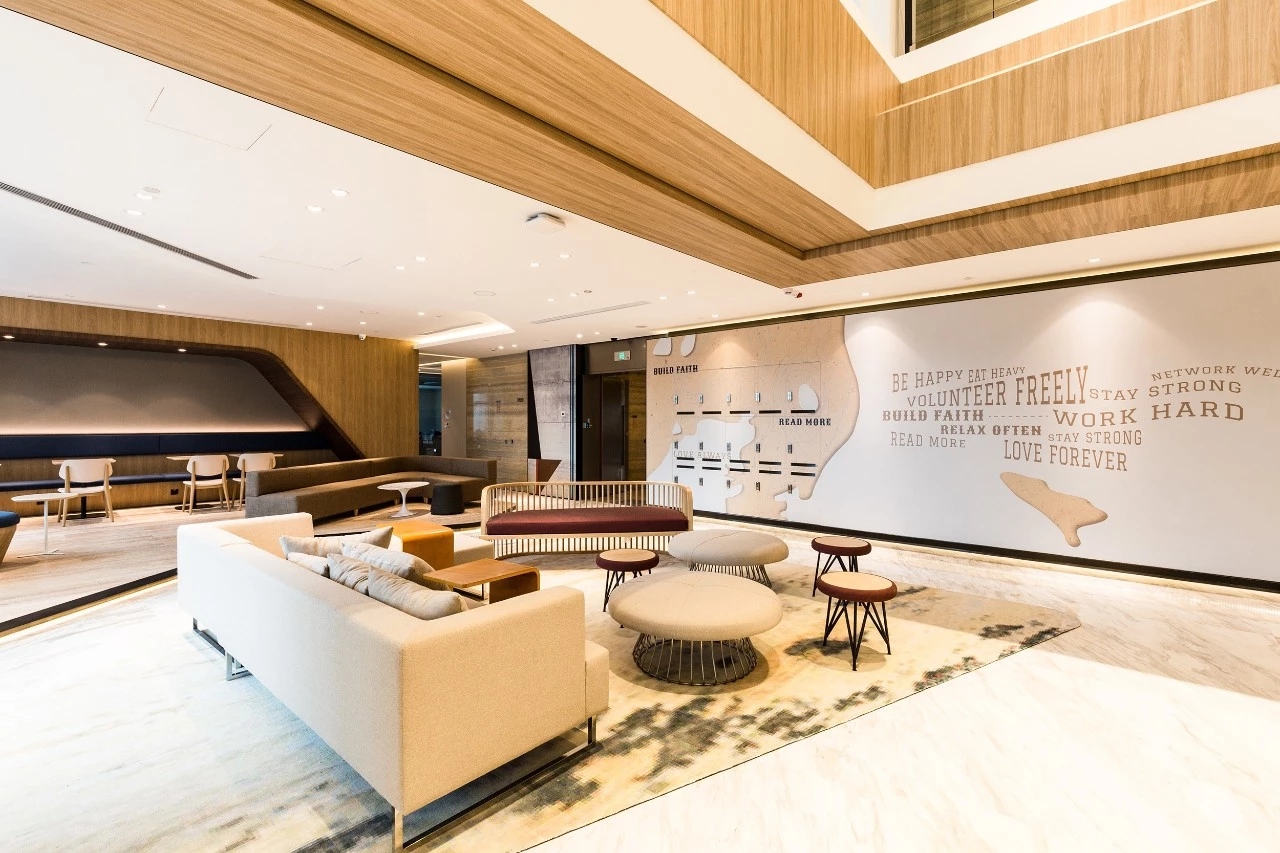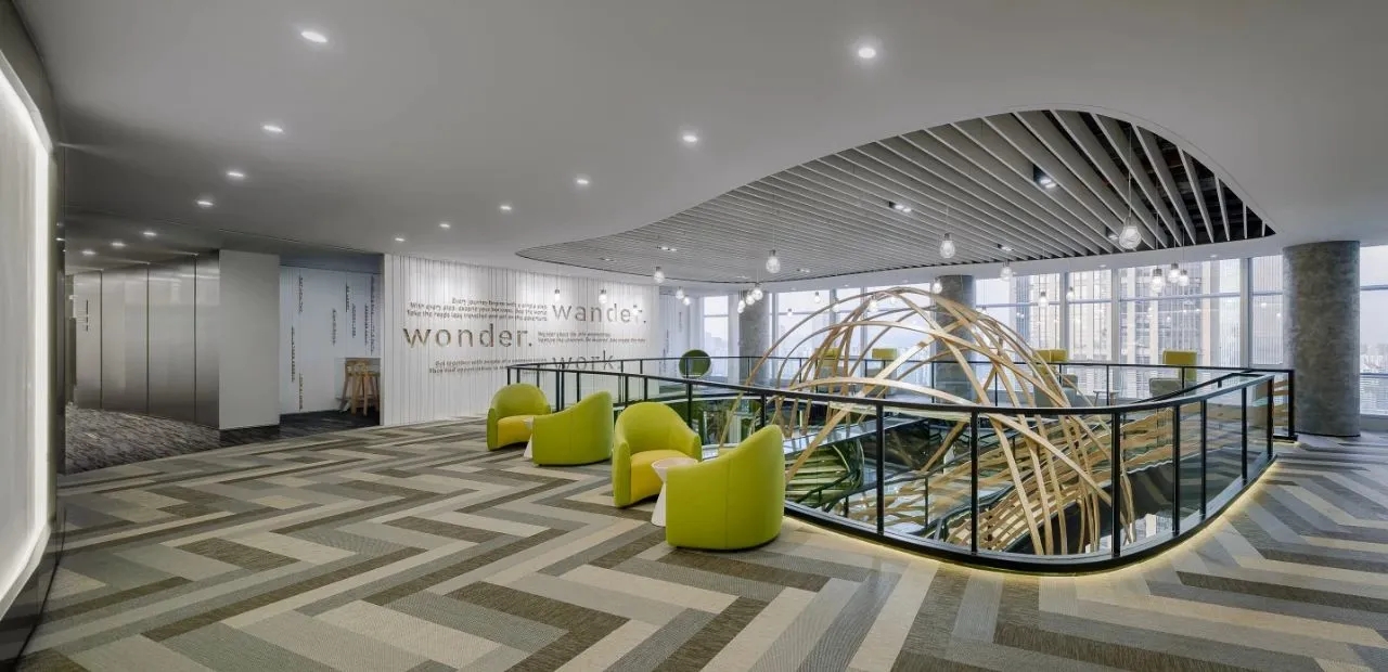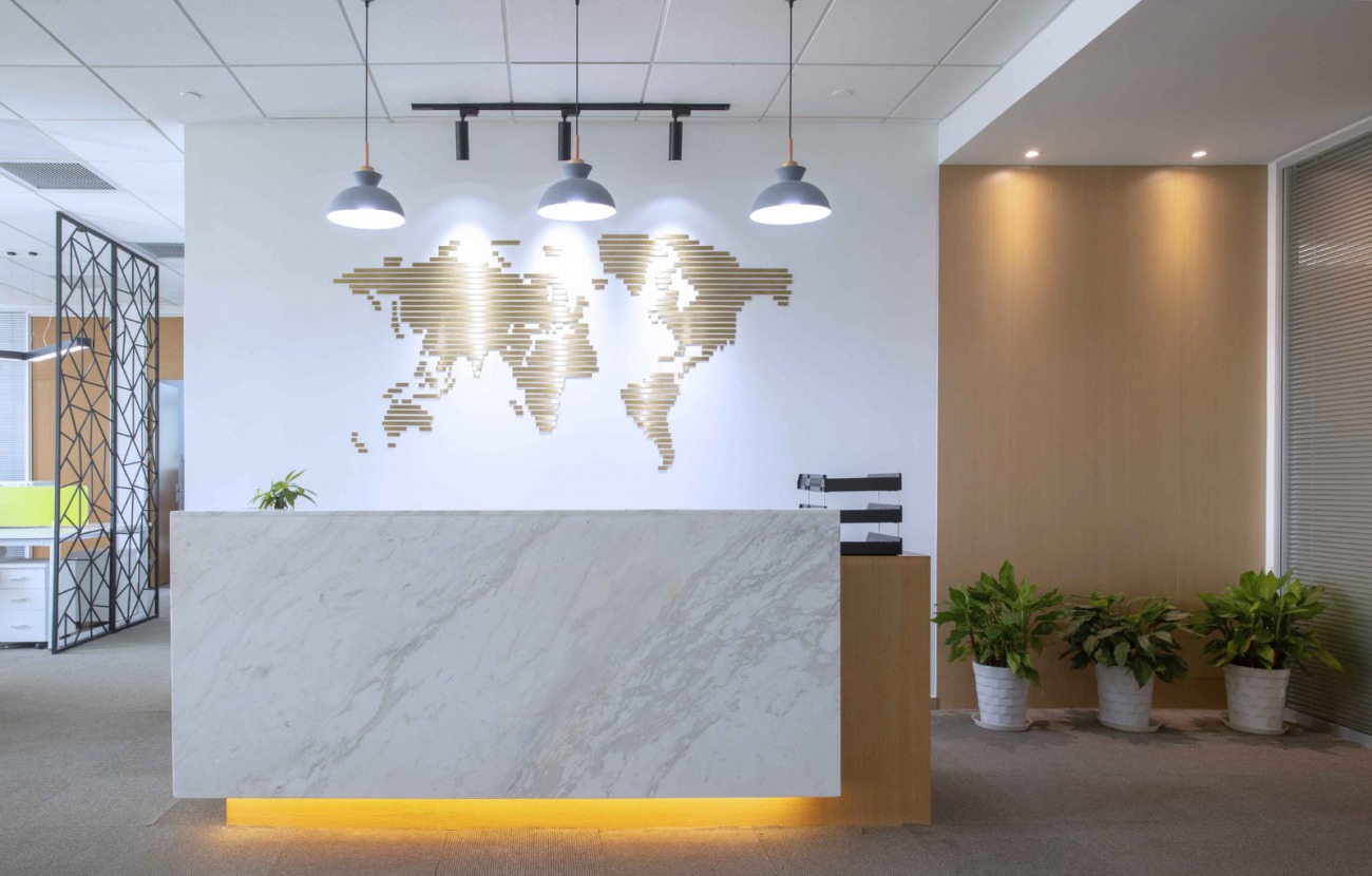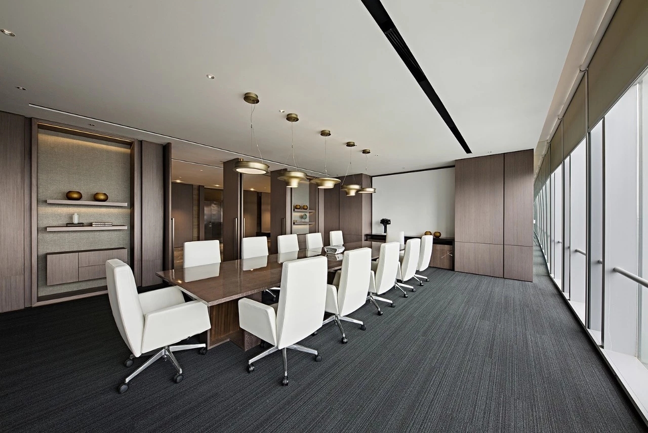 深灰色的模块地毯使得空间沉稳而富于质感;黑白灰系天然大理石的运用使得办公区展示适度的奢华;陈设上色彩丰富的艺术挂画和艺术品是空间精彩的点缀。