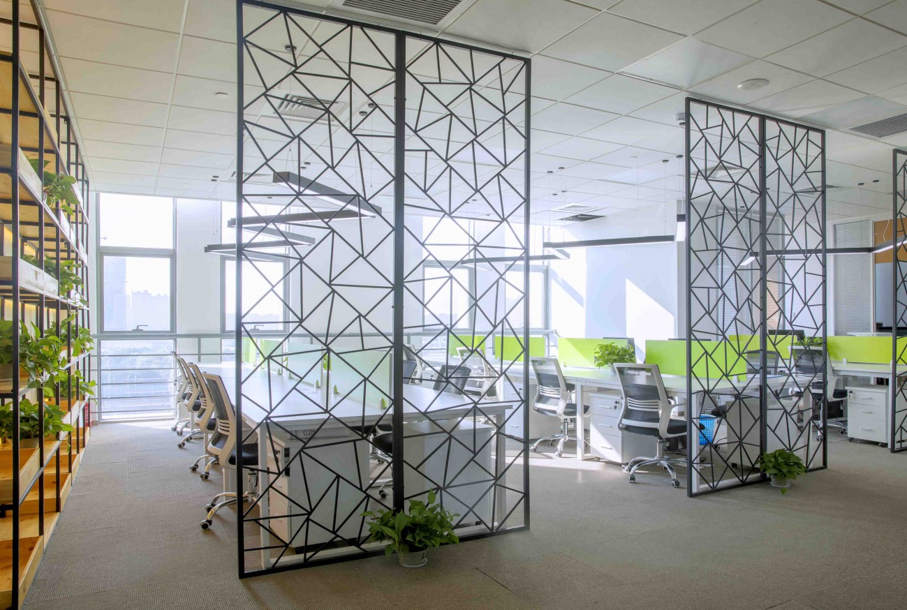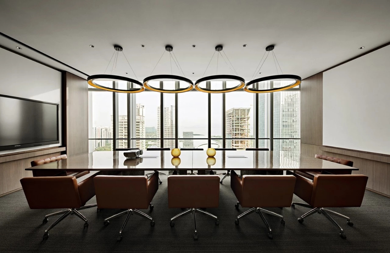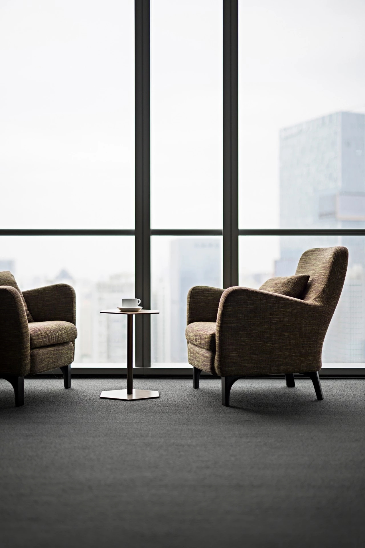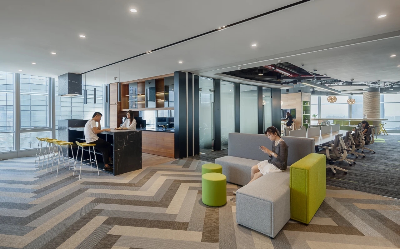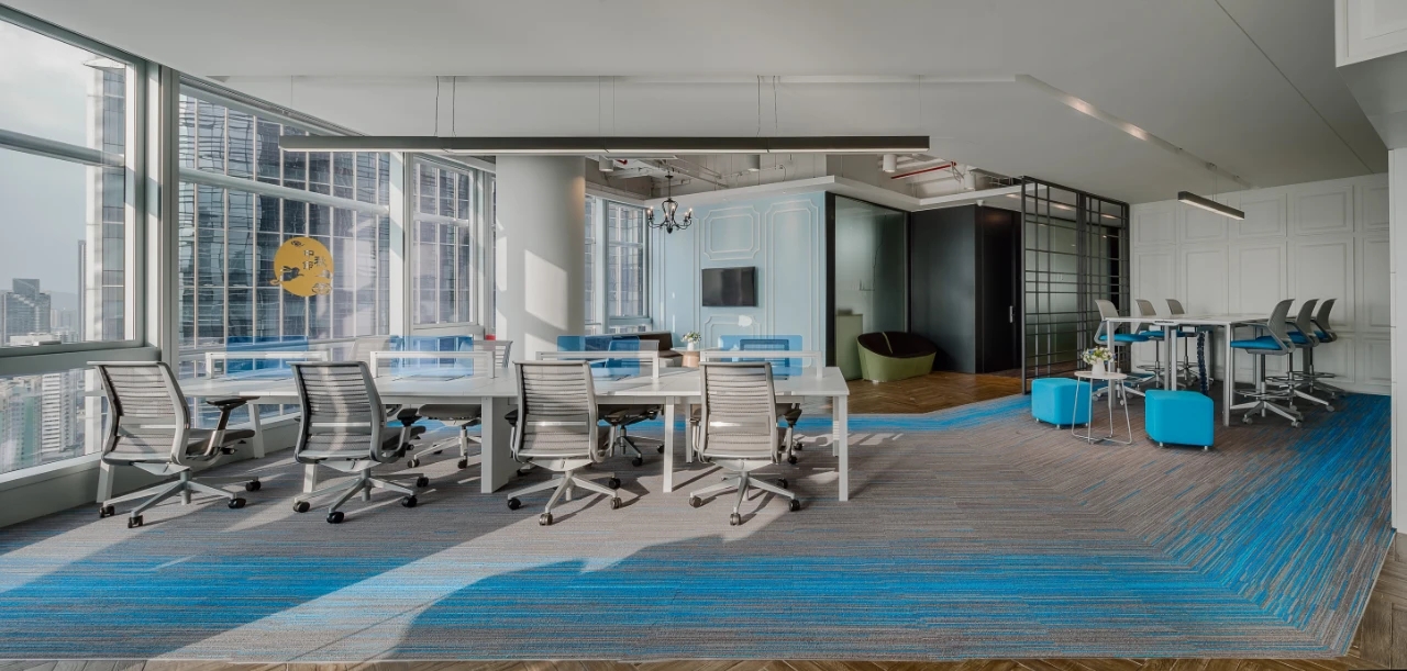 深灰色的模块地毯使得空间沉稳而富于质感;黑白灰系天然大理石的运用使得办公区展示适度的奢华;陈设上色彩丰富的艺术挂画和艺术品是空间精彩的点缀。