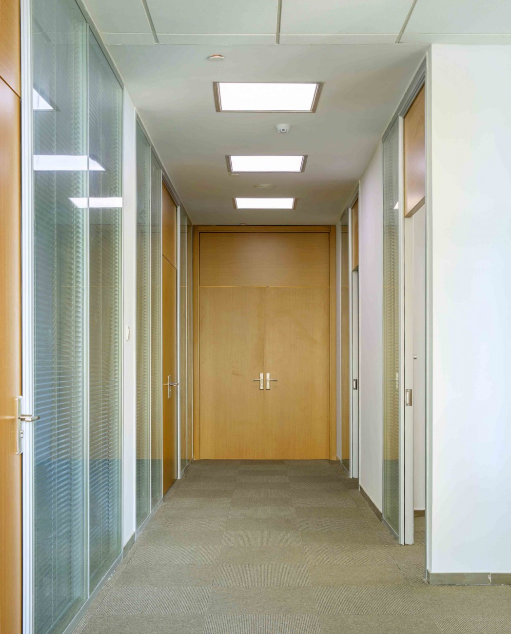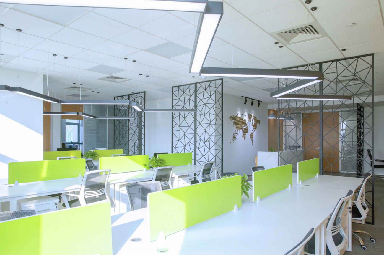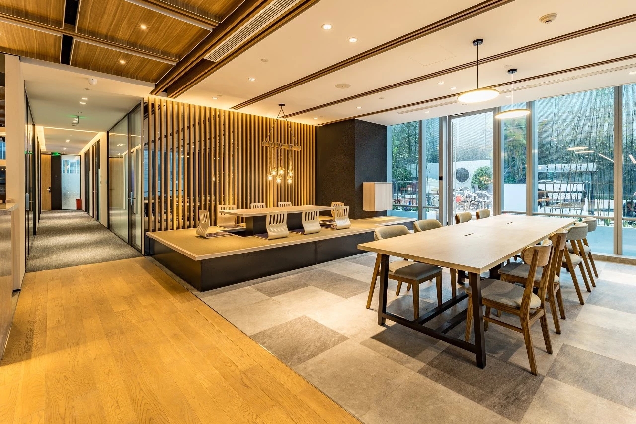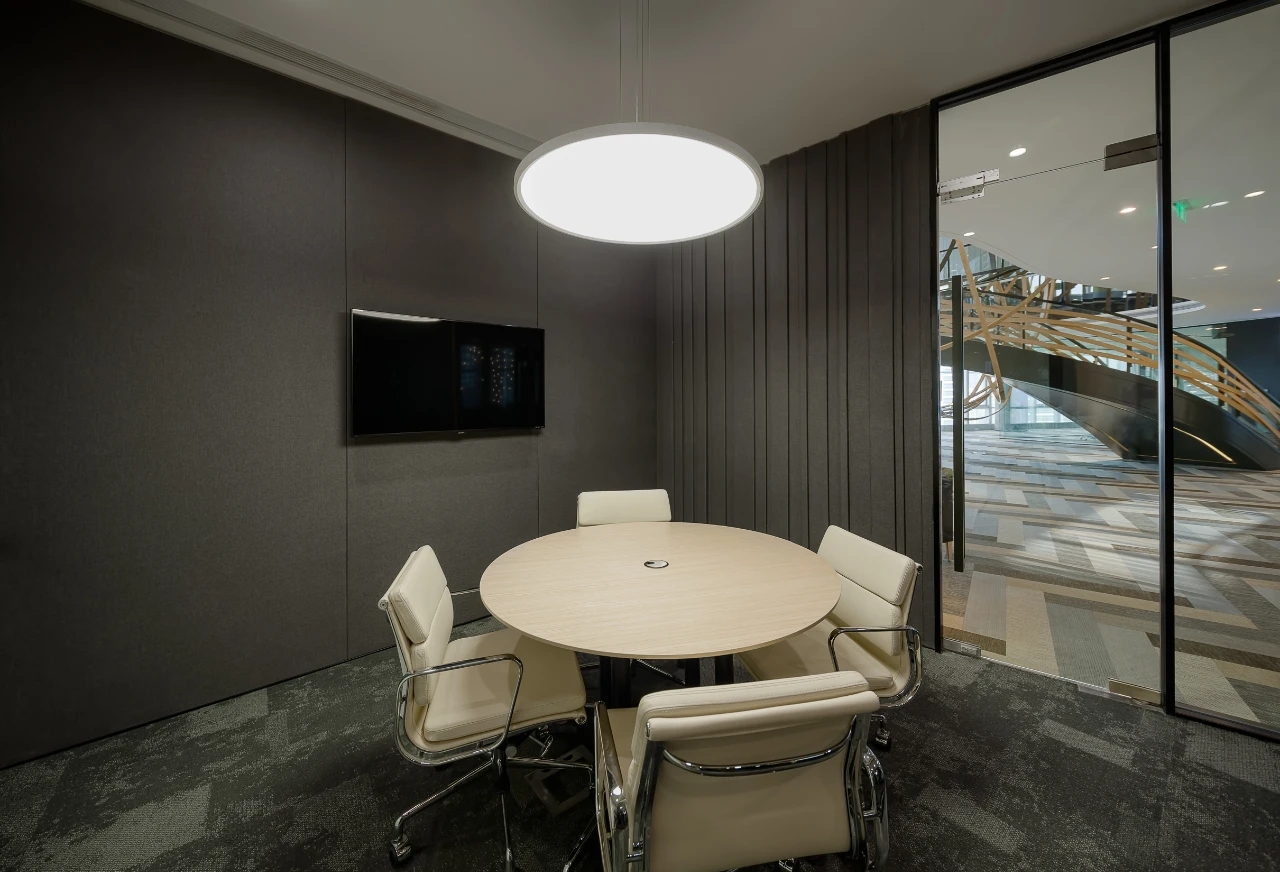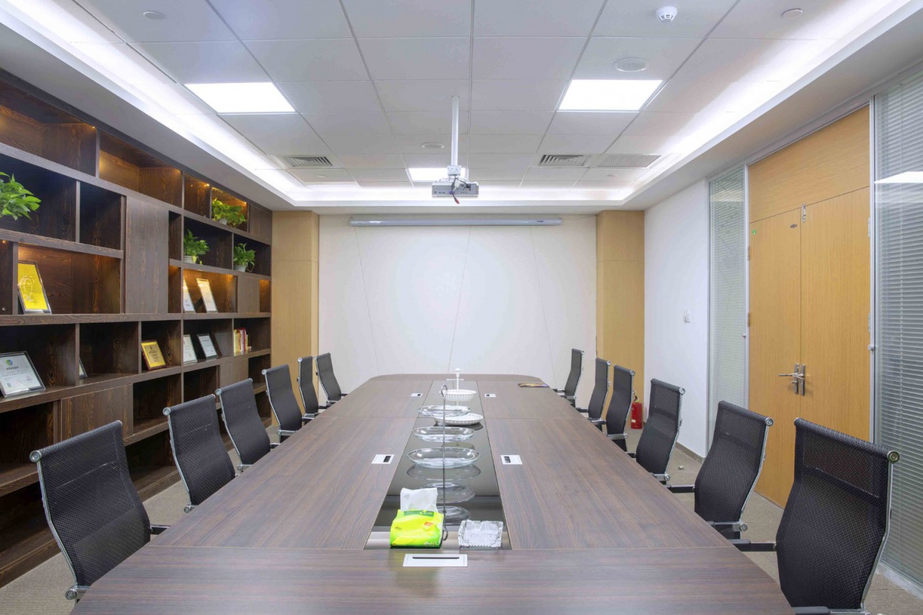 深灰色的模块地毯使得空间沉稳而富于质感;黑白灰系天然大理石的运用使得办公区展示适度的奢华;陈设上色彩丰富的艺术挂画和艺术品是空间精彩的点缀。