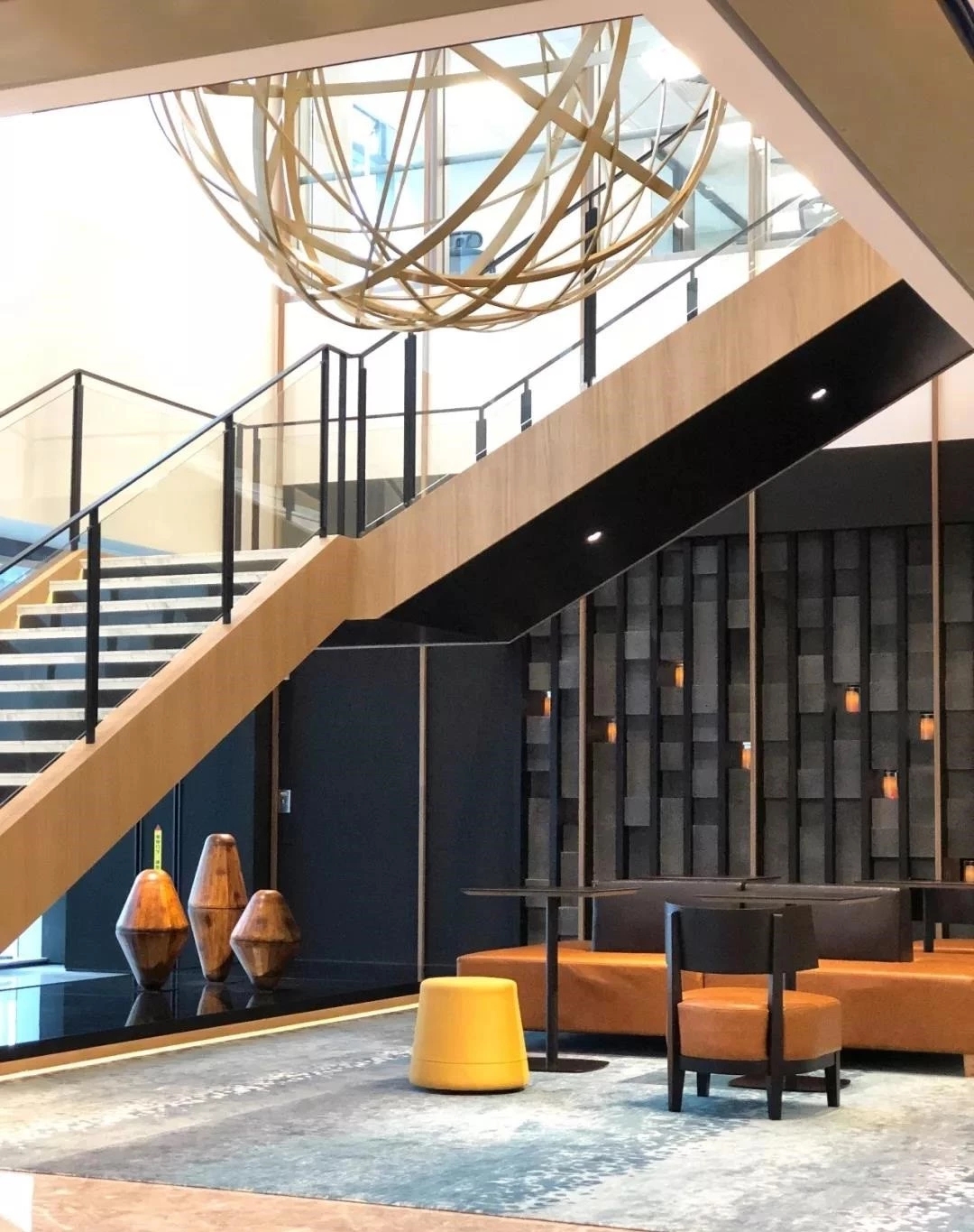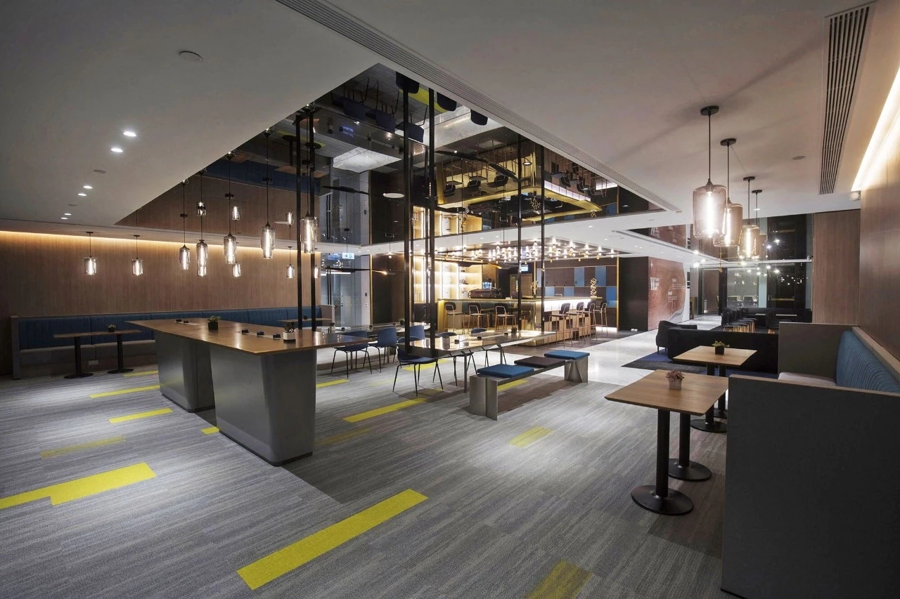 现代爵士主题下的接待前台,呈现酒吧即视感融入海港元素的时尚公共空间与Lounge Bar