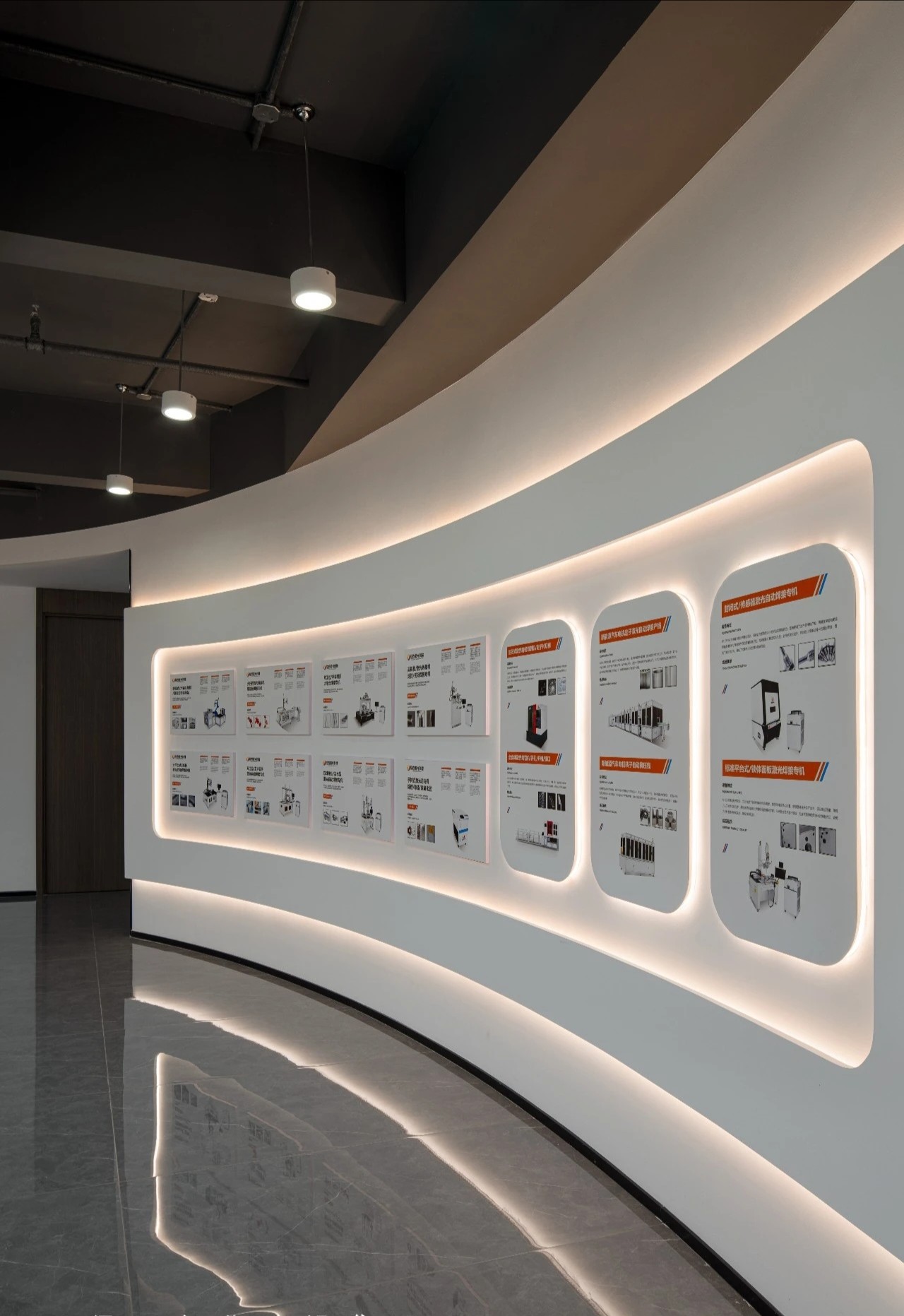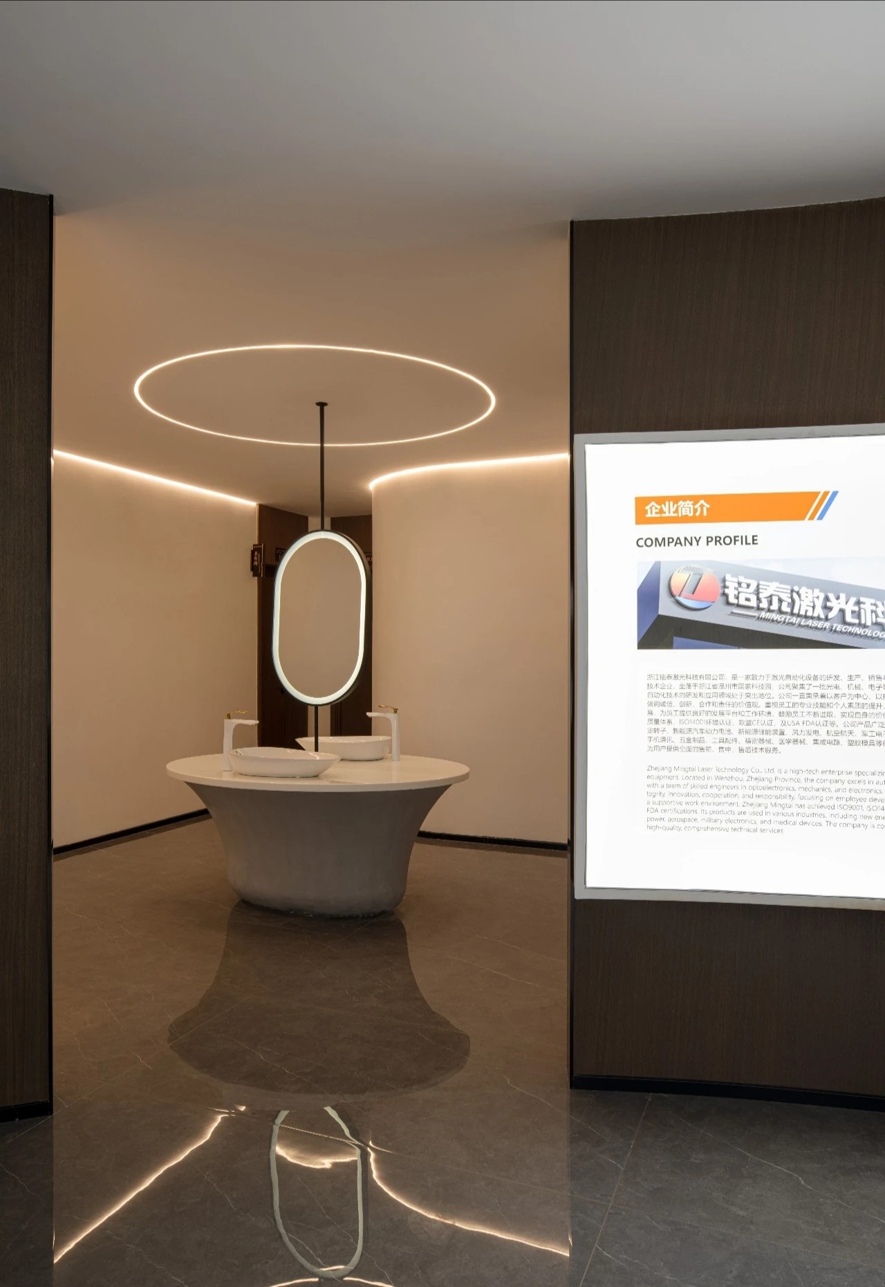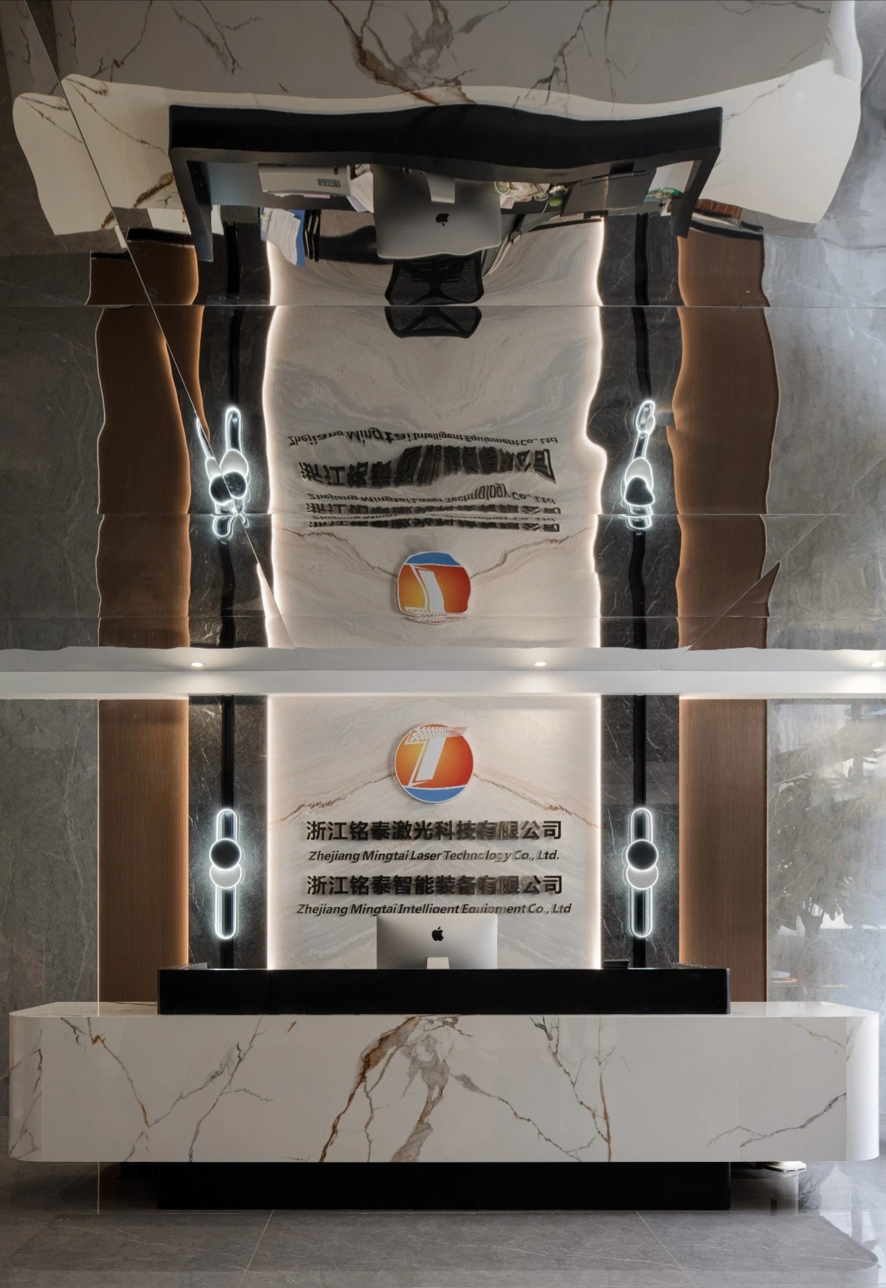 踏入铭泰激光大门,首先映入眼帘的是一方大理石背景,如同企业坚实的基石,沉稳而庄重。顶部镜面不锈钢的巧妙运用,不仅拓宽了视觉层次,更让这方天地在有限的高度中展现出无限的大气与开阔。