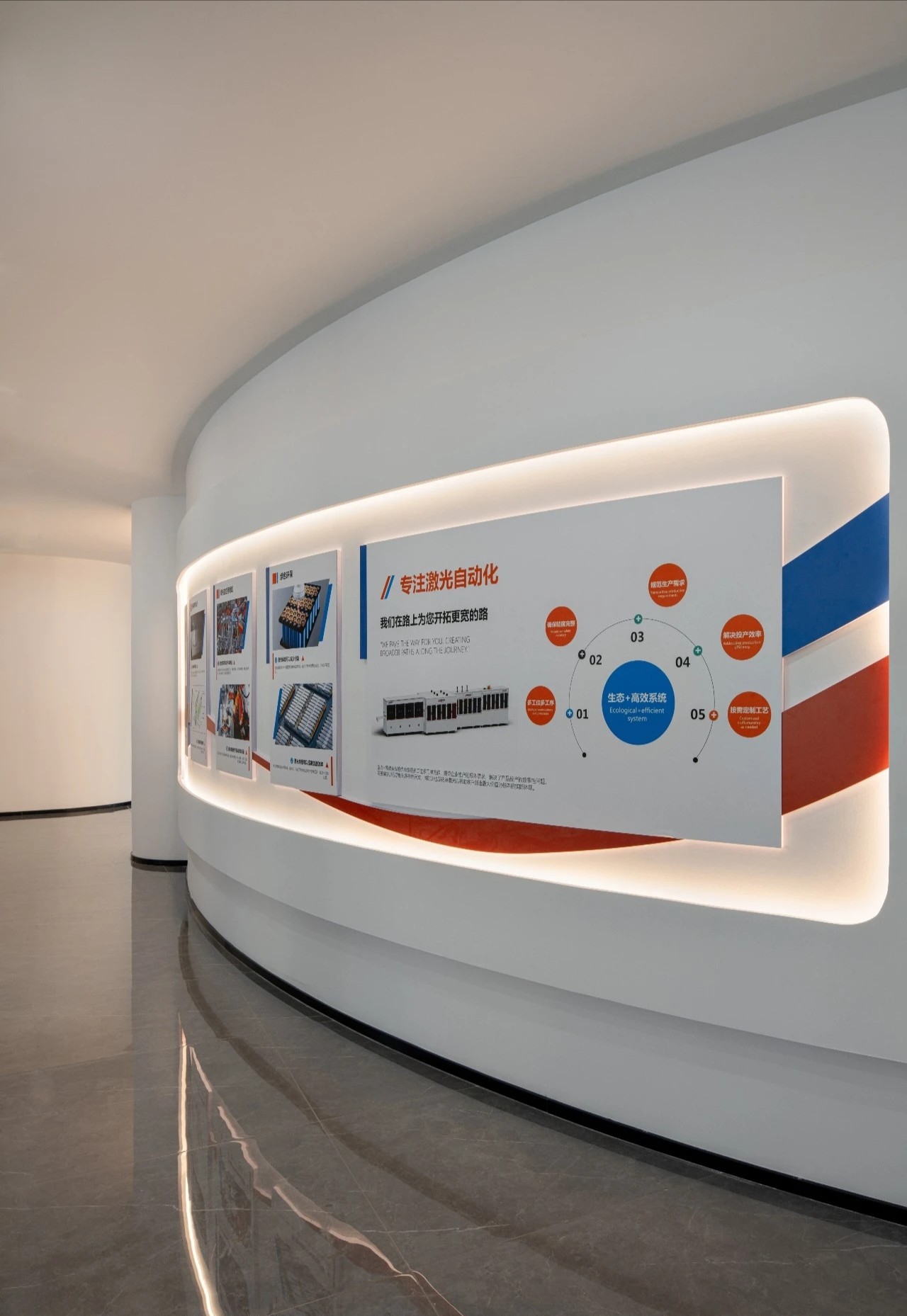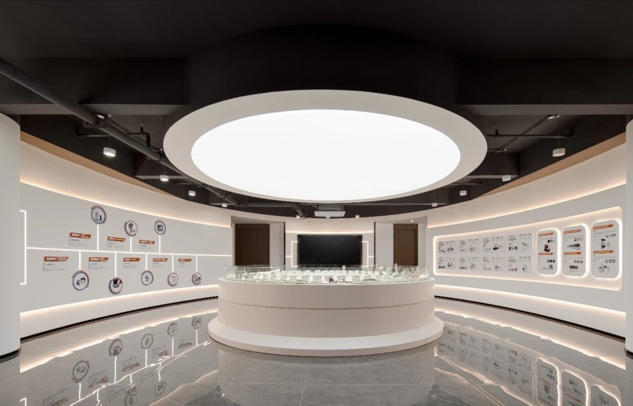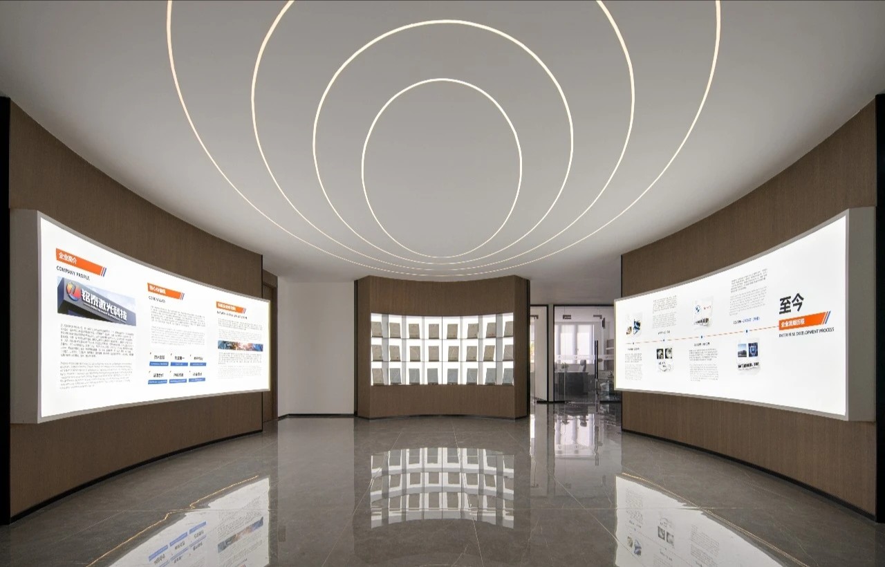 继续前行,椭圆形的企业展厅映入眼帘,中央直径3.5米的圆形展示台,宛如一颗璀璨的科技明珠,精心陈列着铭泰激光制作的精密配件,每一处细节都透露着对品质的极致追求。